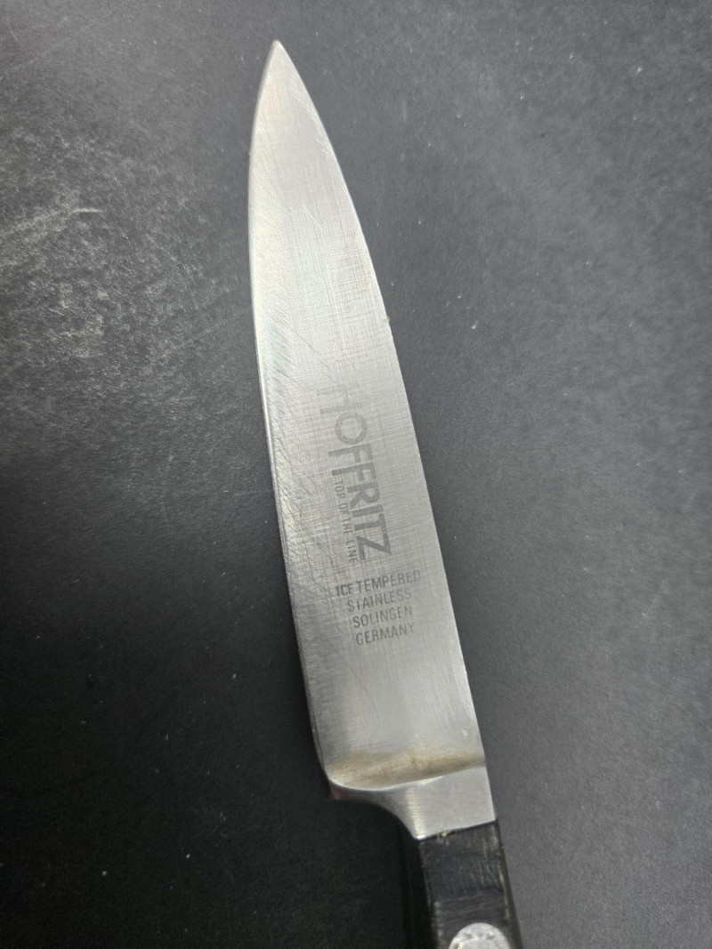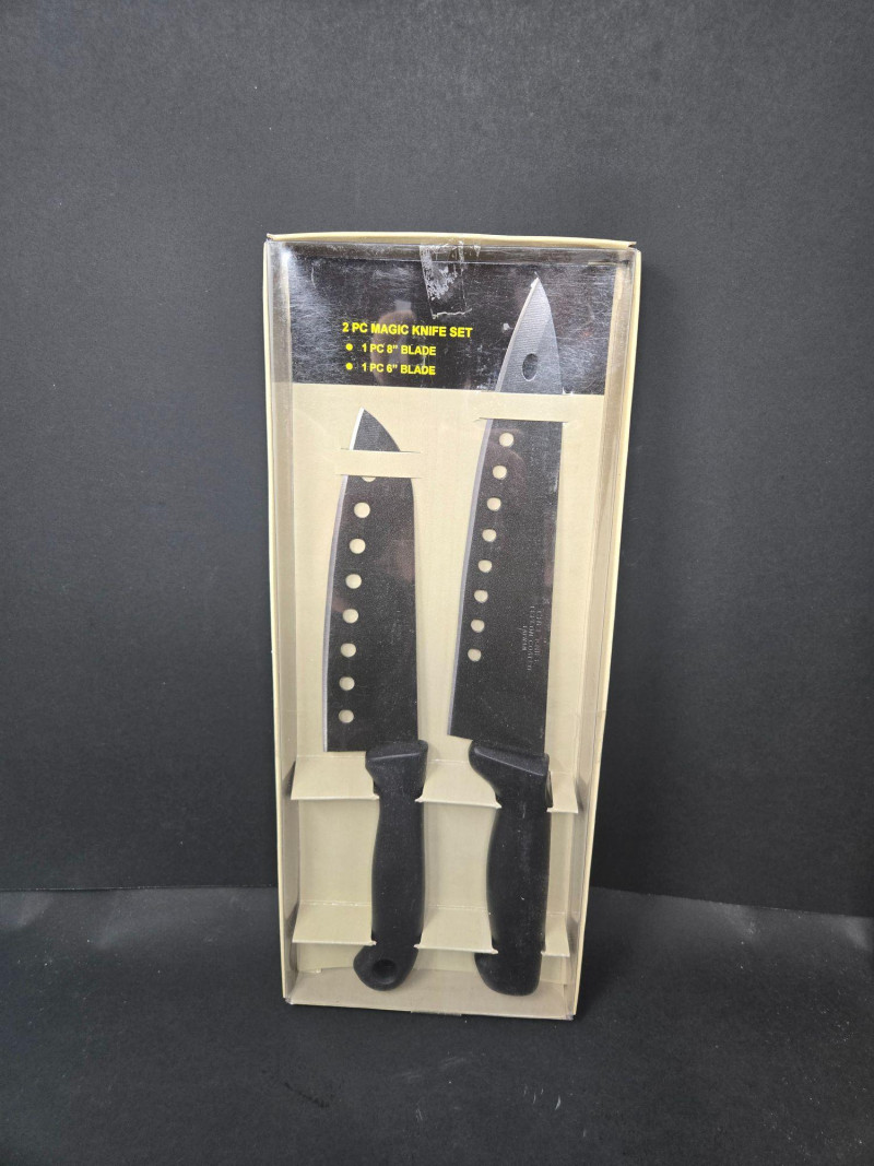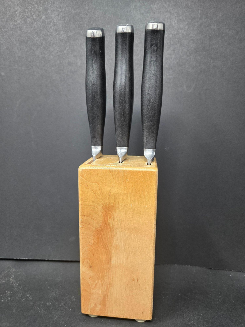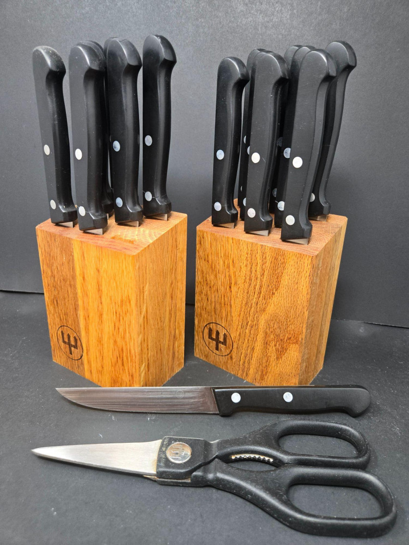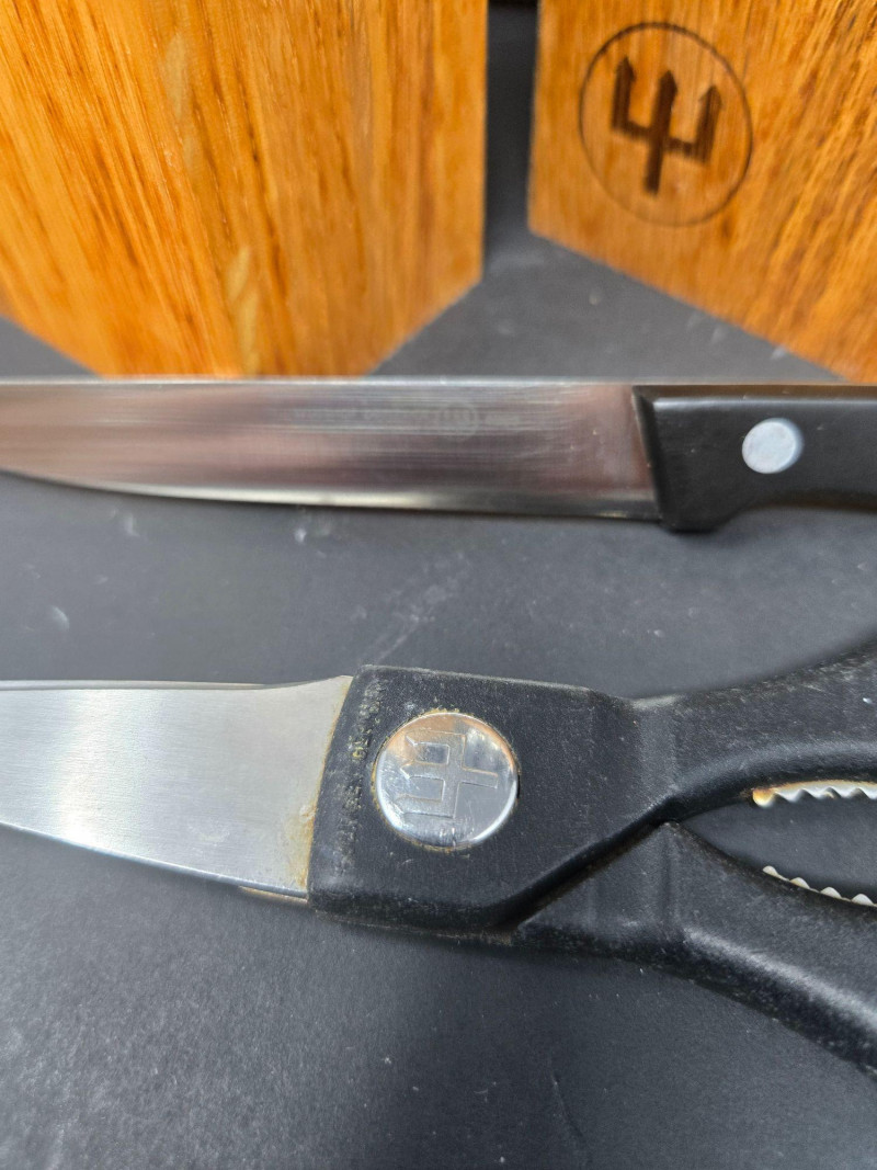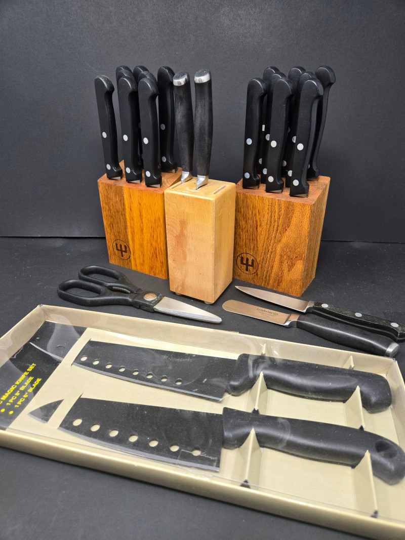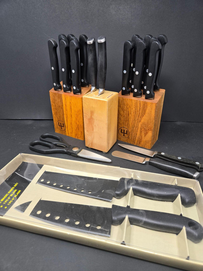 Knife Blocks (3): 2 branded Wüsthof blocks with black-handled knives featuring silver rivets 1 unbranded block with 3 knives Loose Tools & Accessories: Kitchen shears and scissors Cuisinart butter knife Paring knife 2-piece specialty knife set in plastic tray: 6" and 8" blades with ventilation holes Brands Represented: Wüsthof, Cuisinart, and generic stainless steel blades Ideal for home chefs, culinary students, or prep stations Wüsthof Blocks, Cuisinart, Shears & Specialty Blades