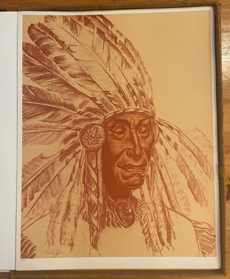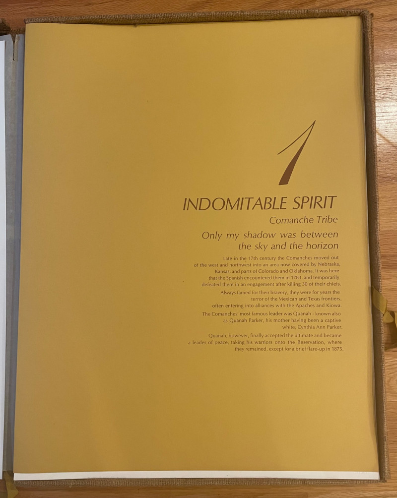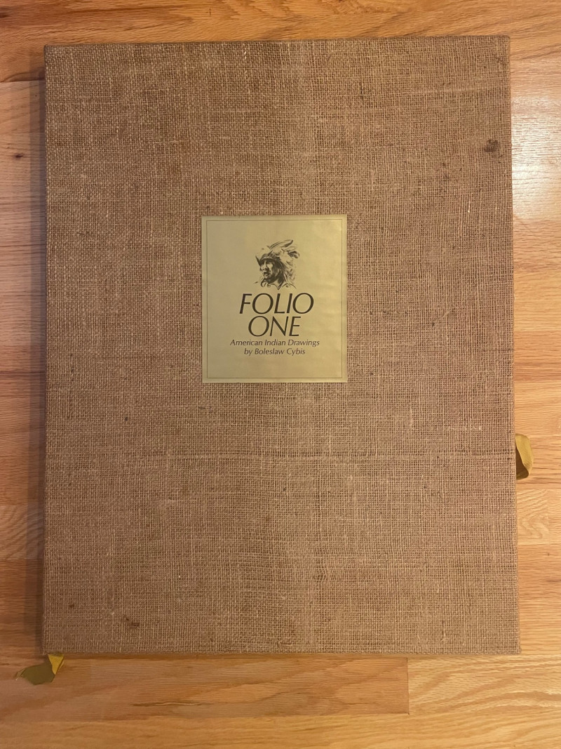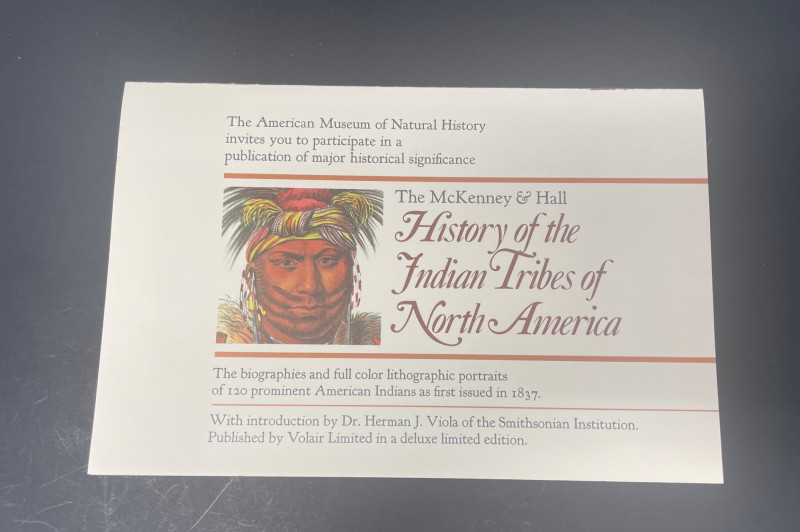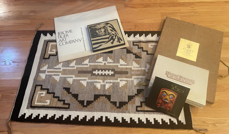 This lot includes: Art Portfolios & Books: Jerome Tiger Art Company folder with illustrated cover Folio One—brown portfolio with gold detailing Edward S. Curtis – The North American Indian folder Small book titled LE featuring a colorful mask illustration Area Rug: Woven textile with Native American-inspired geometric patterns in beige, brown, white, and black Symmetrical design suitable for wall hanging or floor display Condition: Excellent; clean surfaces and crisp edges Picture : 11” x 10 3/4” Area Rug: 49” x 30 1/2”