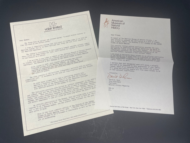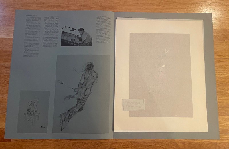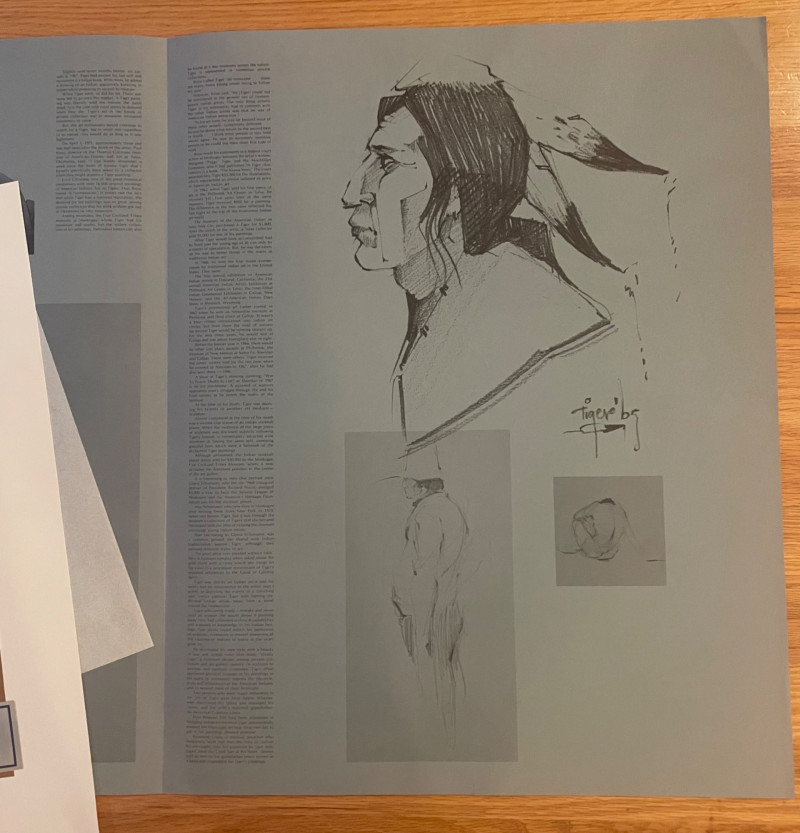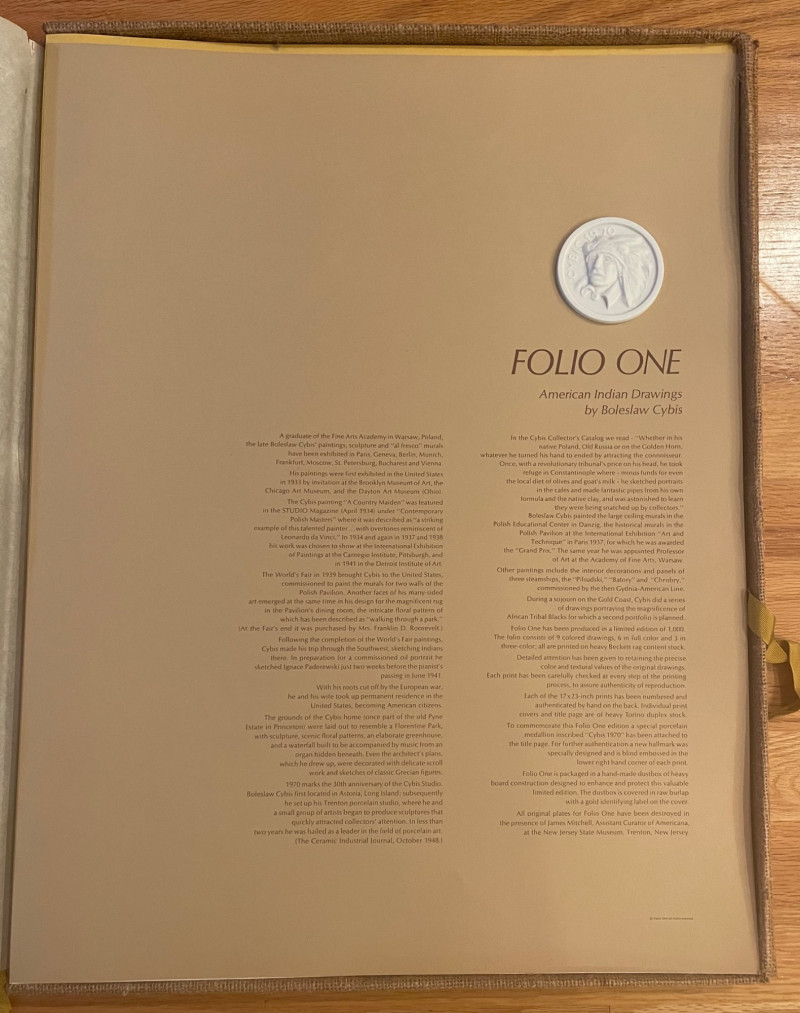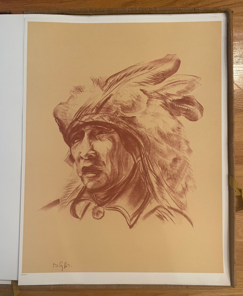 This lot includes: Art Portfolios & Books: Jerome Tiger Art Company folder with illustrated cover Folio One—brown portfolio with gold detailing Edward S. Curtis – The North American Indian folder Small book titled LE featuring a colorful mask illustration Area Rug: Woven textile with Native American-inspired geometric patterns in beige, brown, white, and black Symmetrical design suitable for wall hanging or floor display Condition: Excellent; clean surfaces and crisp edges Picture : 11” x 10 3/4” Area Rug: 49” x 30 1/2”
