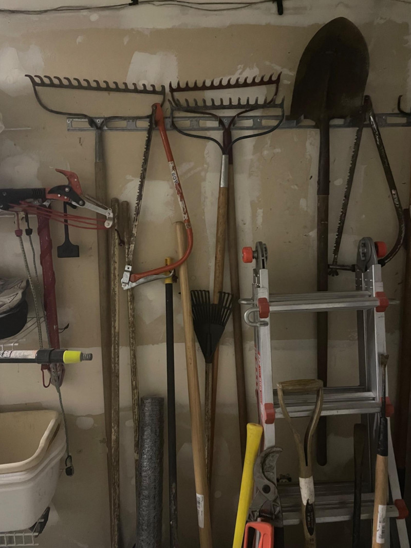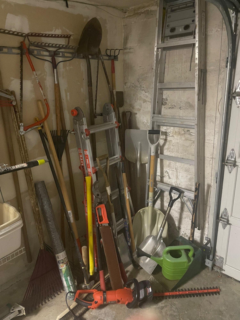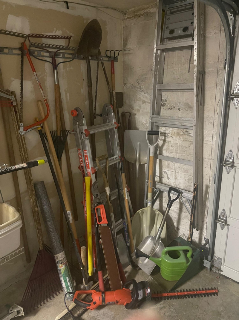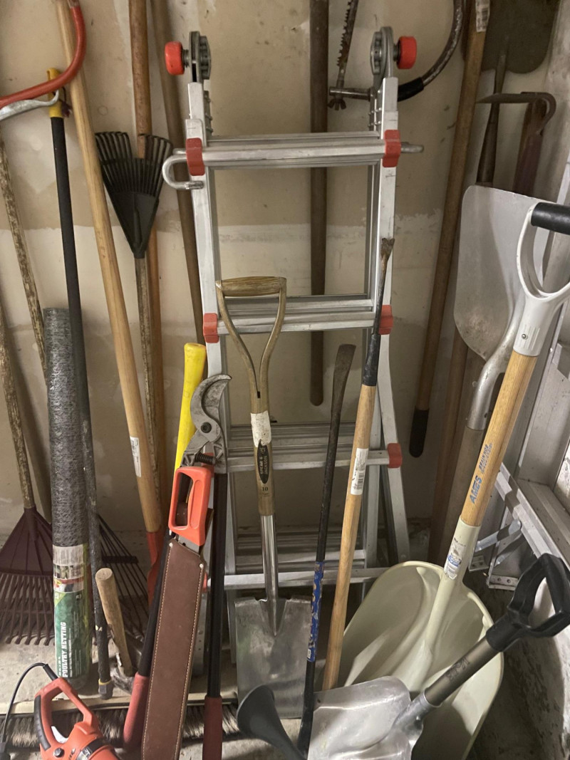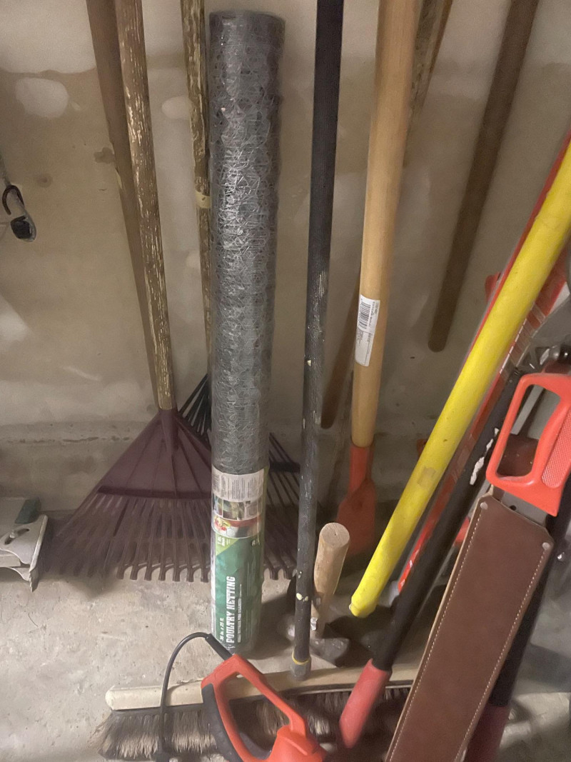 This well-equipped lot features a wide variety of tools for gardening, landscaping, and general outdoor upkeep: Hand Tools: Multiple rakes, shovels, garden hoe, pitchfork, bow saw, loppers Power Tool: Hedge trimmer Accessories: Green watering can, roll of wire mesh Extension Gear: Orange extension cord Ladder: Step ladder for elevated tasks Condition: Good to excellent; tools show light use and are neatly stored