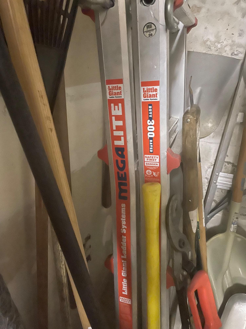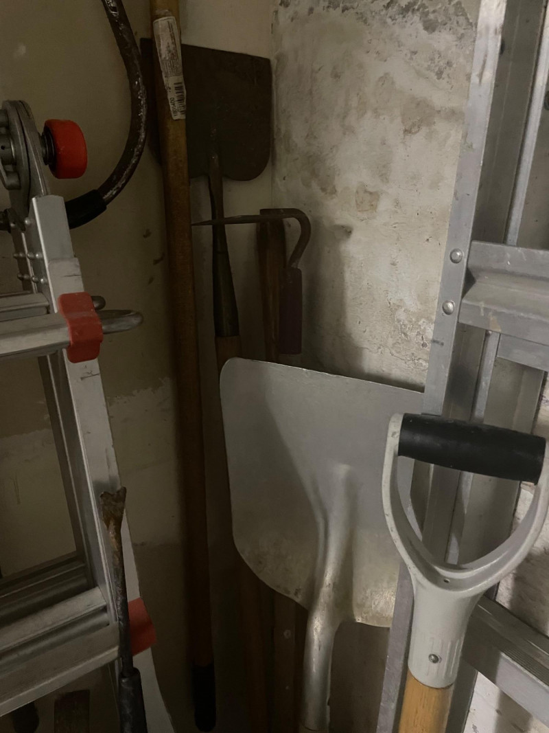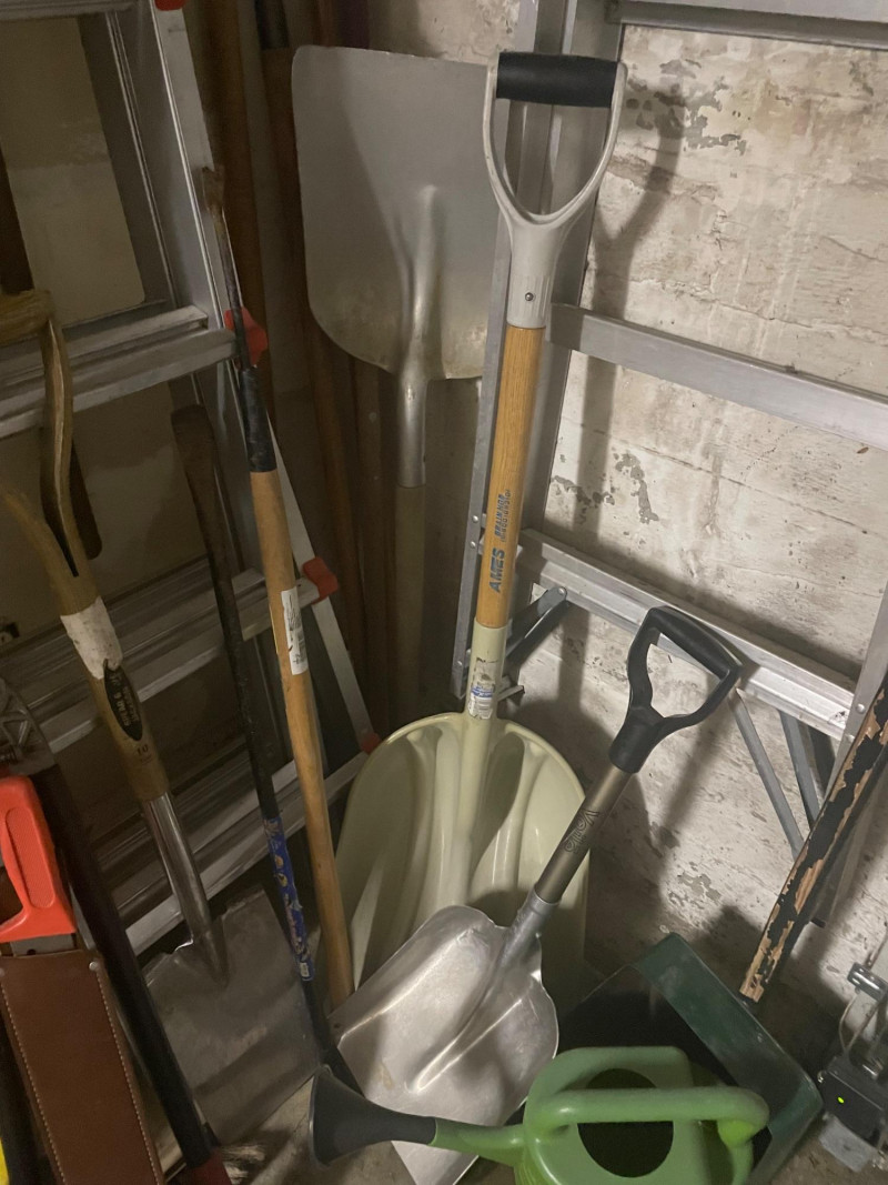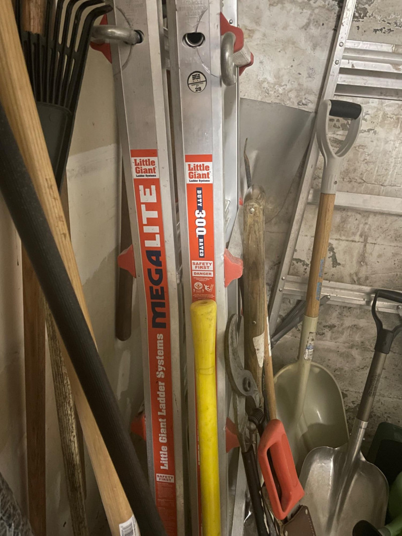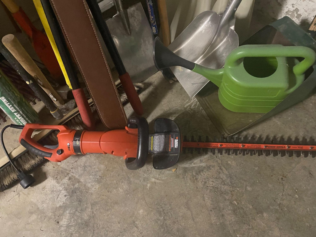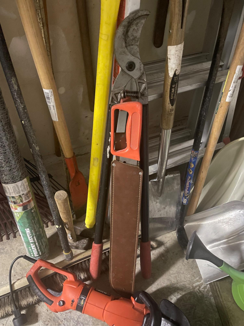 This well-equipped lot features a wide variety of tools for gardening, landscaping, and general outdoor upkeep: Hand Tools: Multiple rakes, shovels, garden hoe, pitchfork, bow saw, loppers Power Tool: Hedge trimmer Accessories: Green watering can, roll of wire mesh Extension Gear: Orange extension cord Ladder: Step ladder for elevated tasks Condition: Good to excellent; tools show light use and are neatly stored