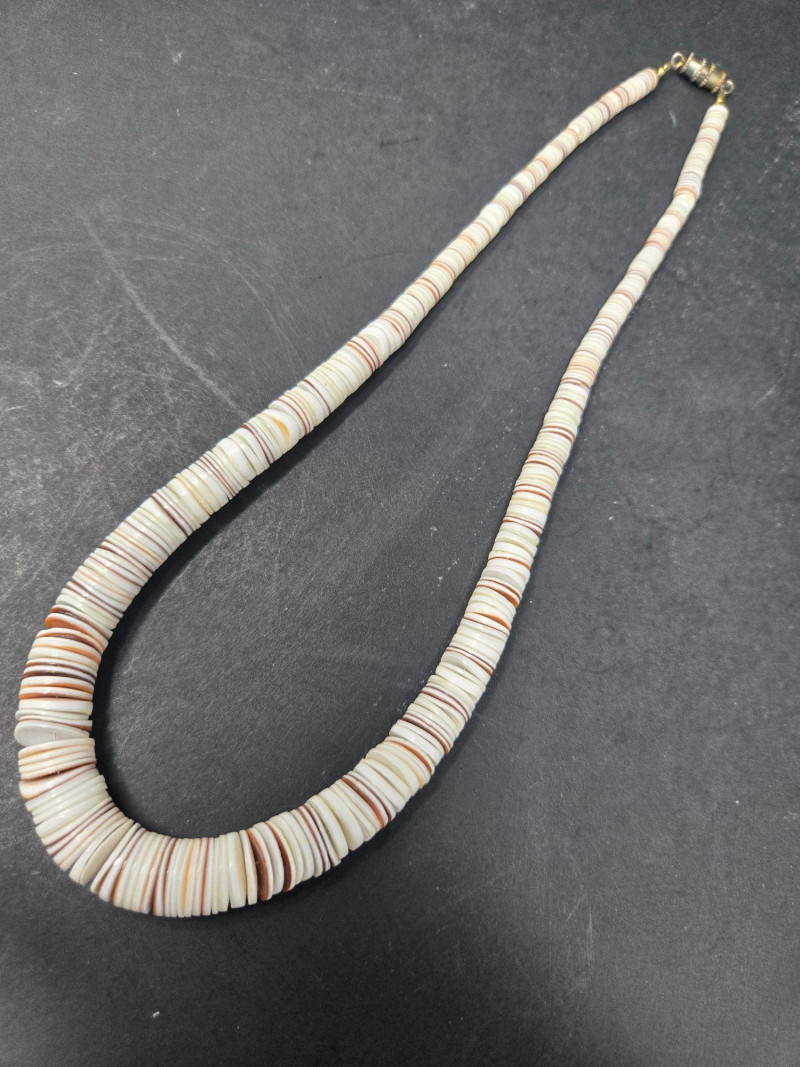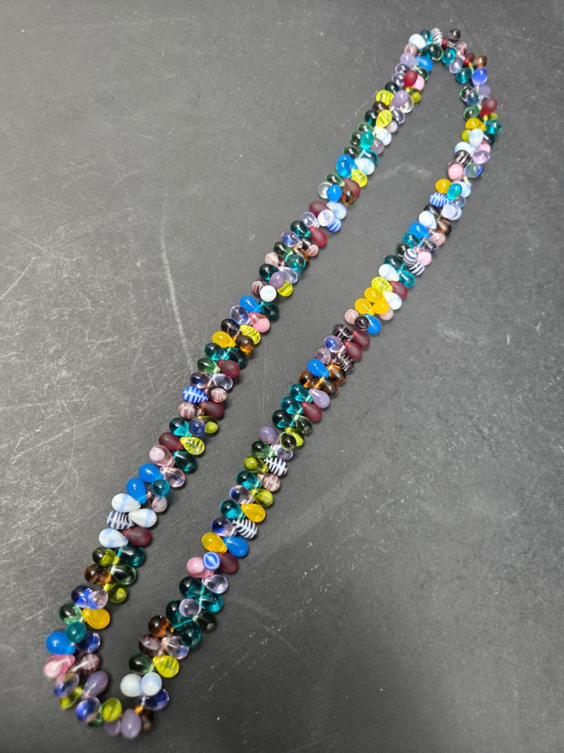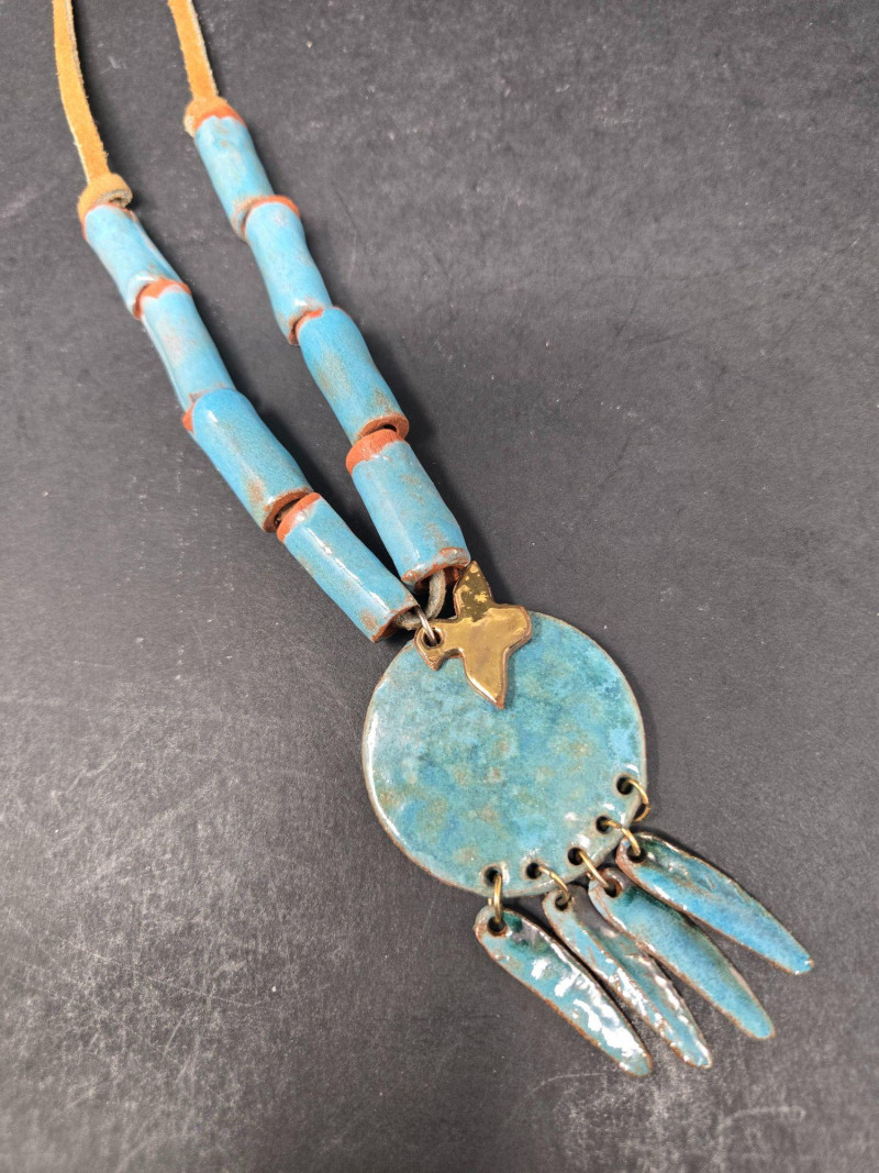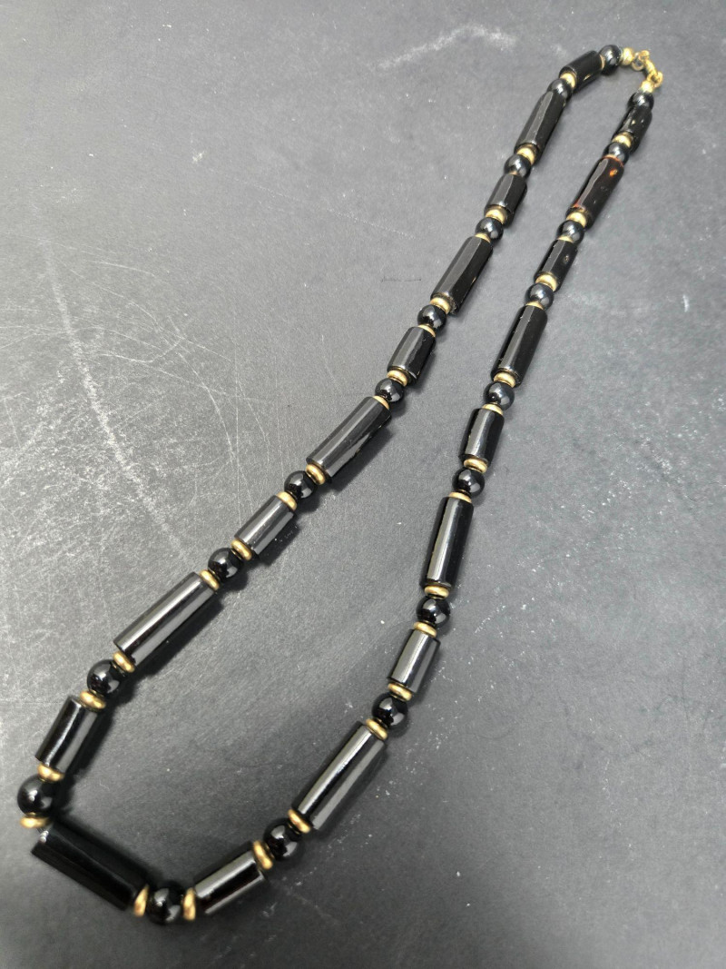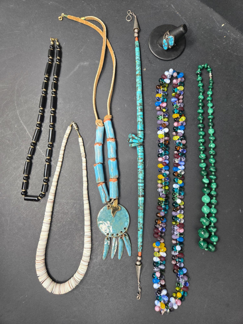 This assortment includes eight necklaces and one size 8 ring, each with distinctive character: Two black beaded necklaces with cylindrical beads and gold-tone spacers—classic and versatile, possibly a matching pair White heishi-style necklace with subtle gradient—lightweight and ideal for layering Turquoise pendant necklace with large beads and a round medallion featuring a star and four dangling turquoise drops—boho and southwestern flair Long turquoise strand with metal hook—possibly a bolo tie or decorative accent Multicolored glass bead necklace with a variety of shapes and hues—artistic and playful Green polished stone necklace, possibly malachite—earthy and elegant Size 8 turquoise ring set in a silver-tone band—bold and southwestern-inspired