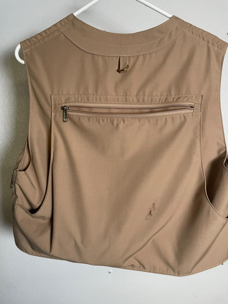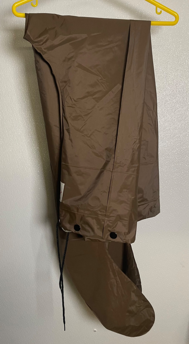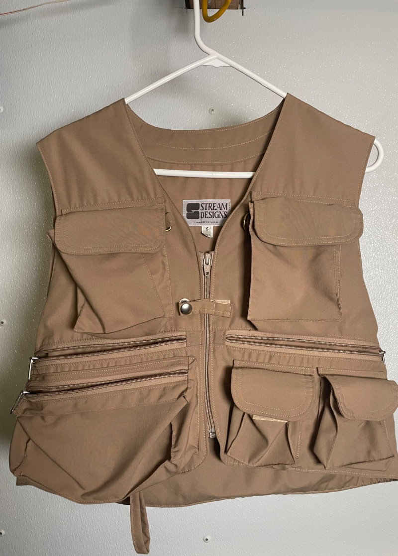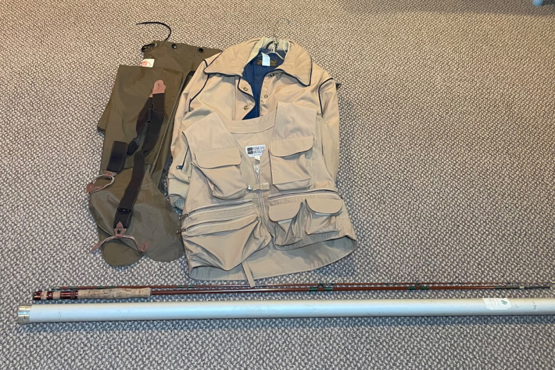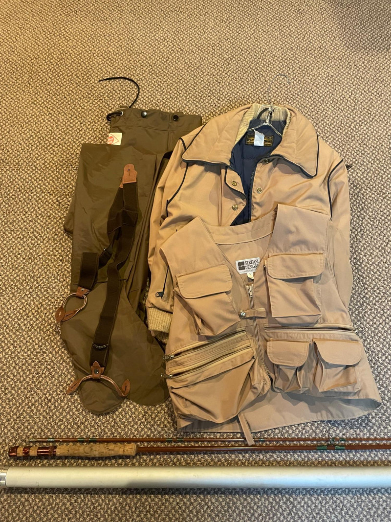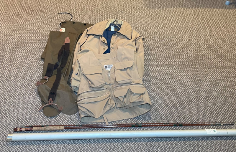 This lot includes: Fly Fishing Rod – Reddish-brown rod with green thread wraps, stored in a silver travel tube for protection and portability Orvis Super Tac-L-Pak Vest – Tan women’s fishing vest with multiple pockets and compartments for flies, tools, and accessories Chest Waders – Brown waterproof waders with black suspenders and brown straps; designed for comfort and mobility in water Brands: Orvis (vest), unspecified rod and waders Condition: Excellent; clean and lightly used