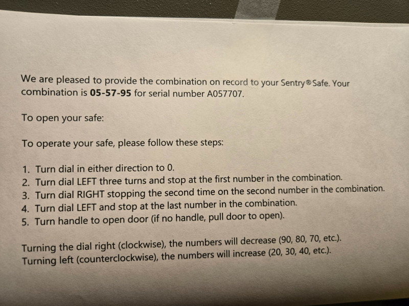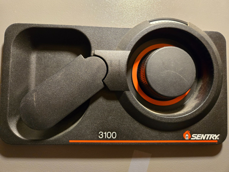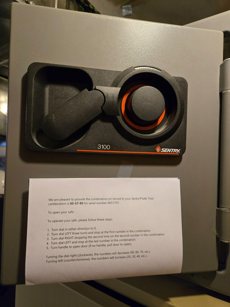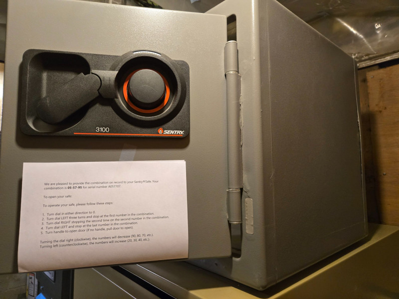 Sentry Group Safe, is a secure and compact personal safe ideal for storing valuables, documents, or small electronics. Model 3100: Equipped with a combination lock and manual handle for reliable access. Combination included: Comes with printed instructions and the original combination (05-57-95) tied to serial number A057707. Construction: Durable steel body with a classic gray finish, designed for home or office use. Dimensions: Approximately 10” x 14” x 10”, offering practical storage without taking up excessive space.
