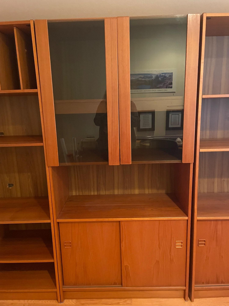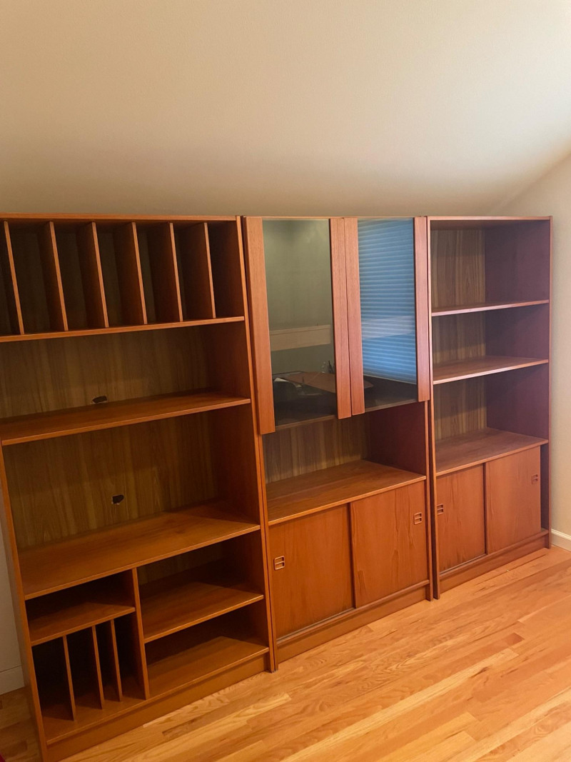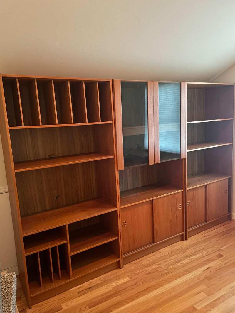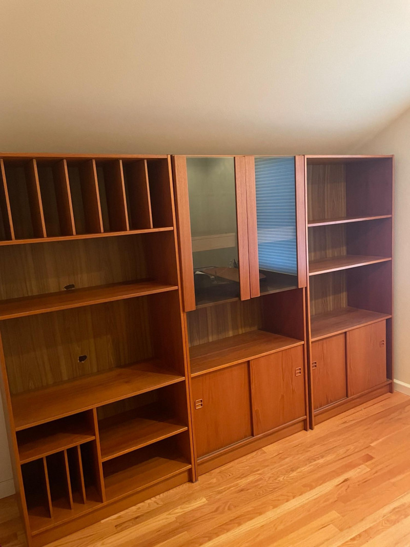 This set includes three coordinating wooden shelving units: Left Unit: Vertical dividers on the top shelf for organizing files or documents, with open shelving below Center Unit: Upper glass-front cabinets for display, lower section with wooden sliding doors for concealed storage Right Unit: Open upper shelves and lower sliding-door compartments for flexible use Style: Mid-century modern Finish: Warm-toned wood with visible grain Features: Sliding doors, glass panels, vertical dividers Condition: Excellent; clean surfaces and sturdy construction 71”H x 35” W x 17” D each