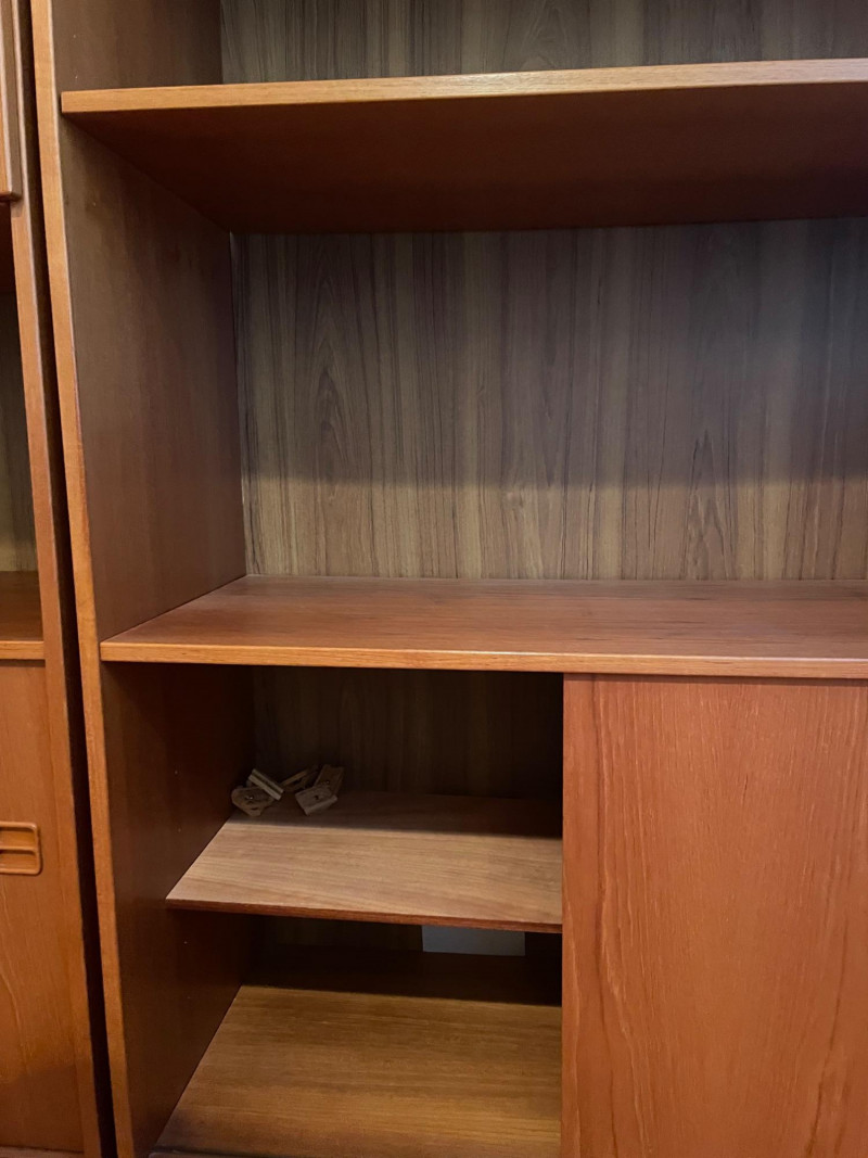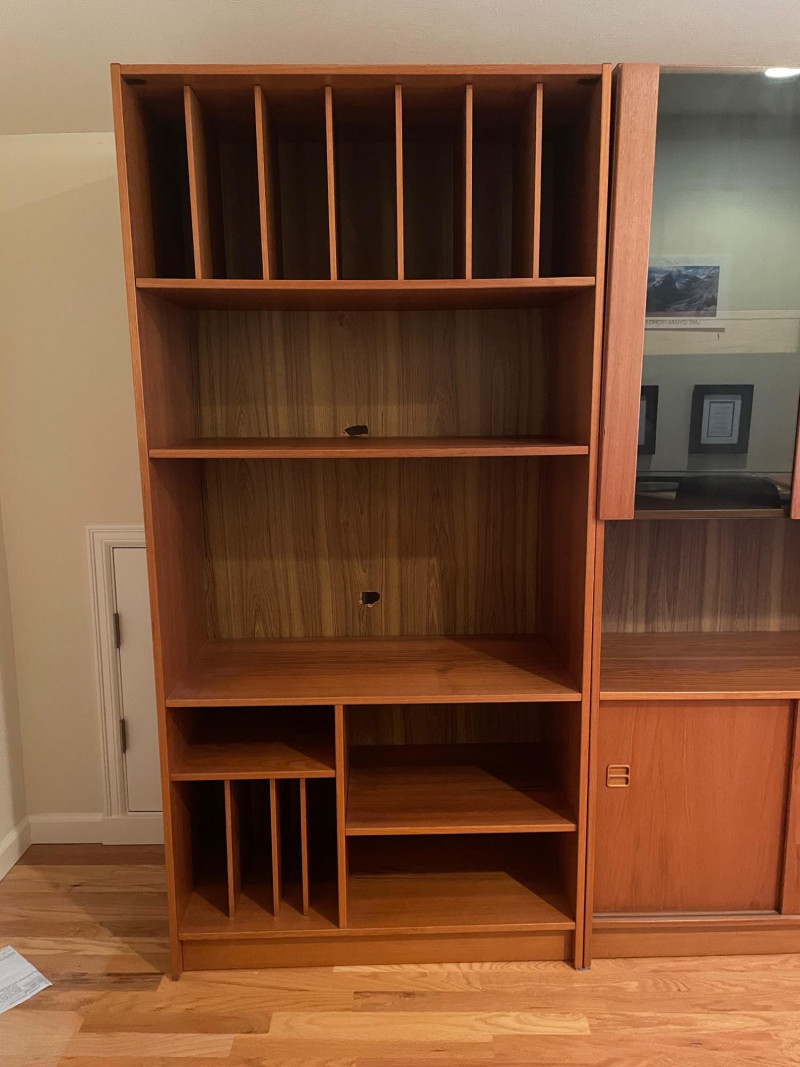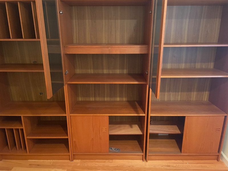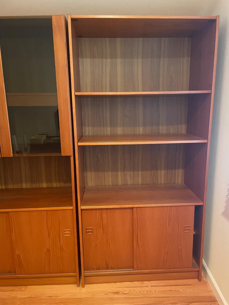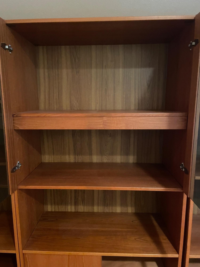 This set includes three coordinating wooden shelving units: Left Unit: Vertical dividers on the top shelf for organizing files or documents, with open shelving below Center Unit: Upper glass-front cabinets for display, lower section with wooden sliding doors for concealed storage Right Unit: Open upper shelves and lower sliding-door compartments for flexible use Style: Mid-century modern Finish: Warm-toned wood with visible grain Features: Sliding doors, glass panels, vertical dividers Condition: Excellent; clean surfaces and sturdy construction 71”H x 35” W x 17” D each