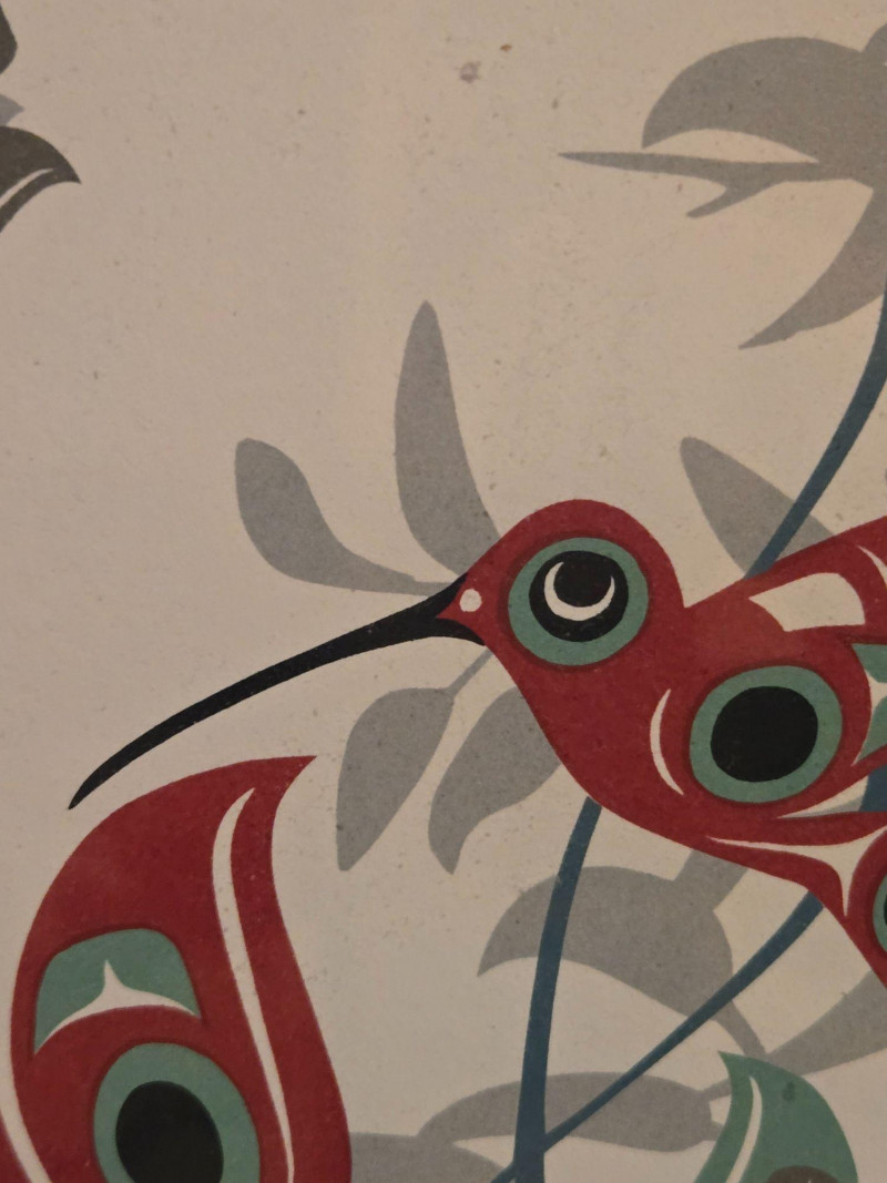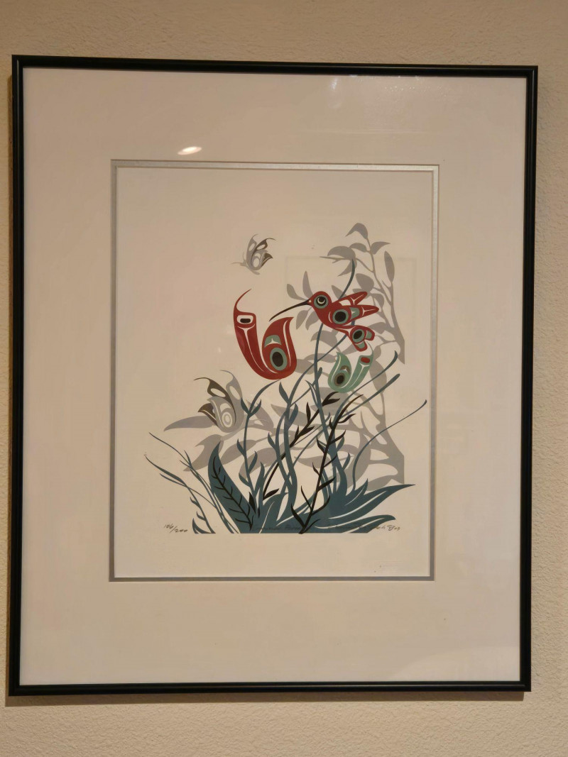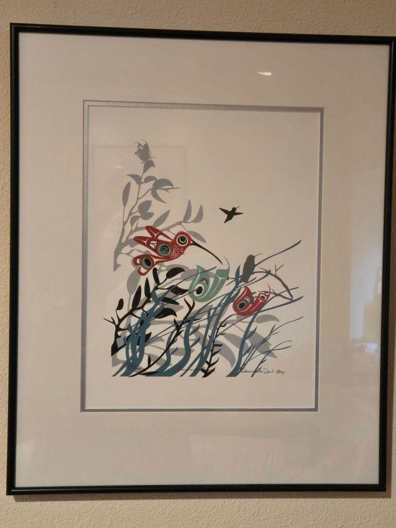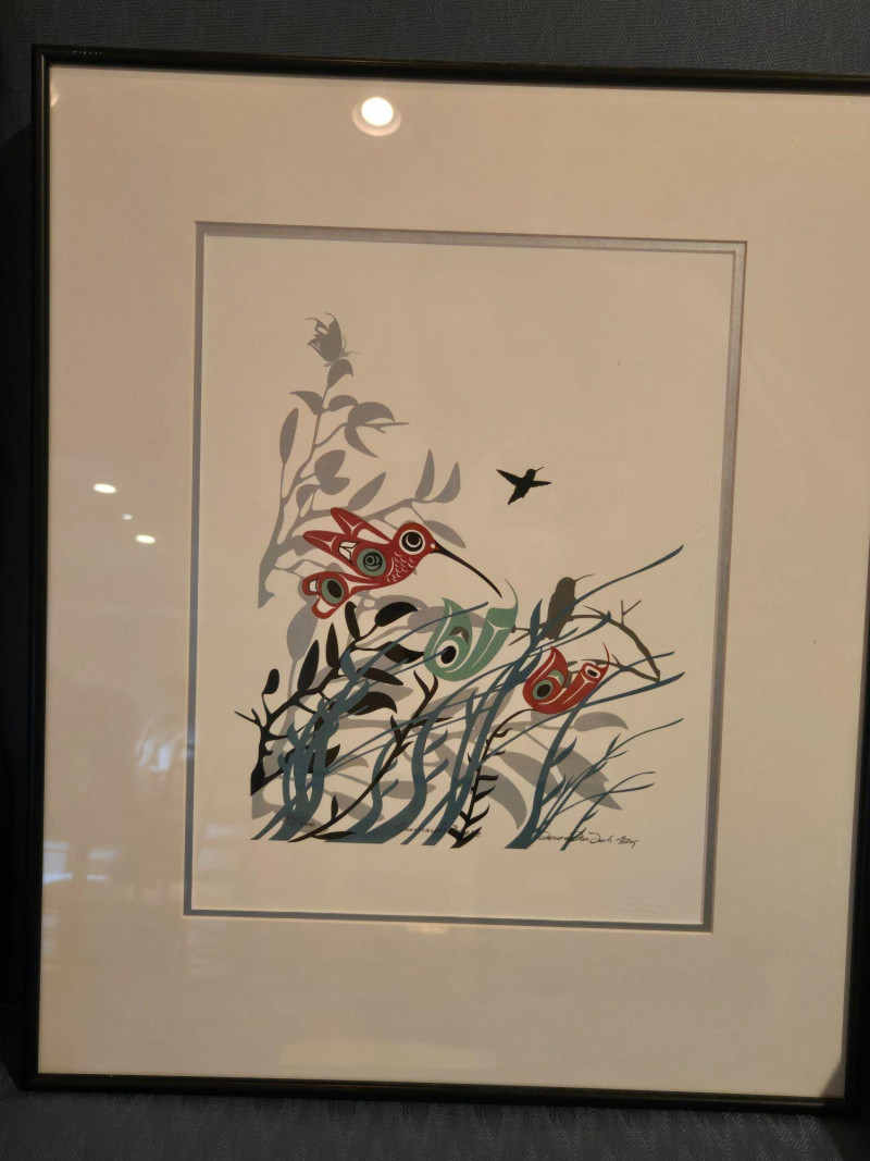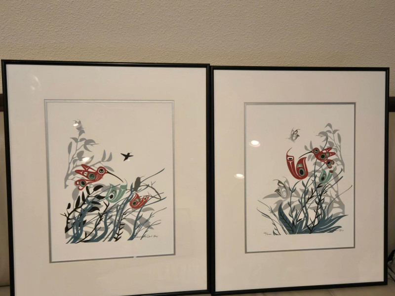 This matched pair of framed silk screen prints by Kwakwaka’wakw artist Francis Dick showcases her distinctive visual language rooted in Northwest Coast traditions. Each print features three stylized birds rendered in red, green, black, and gray tones, surrounded by abstract foliage and airborne elements. Left print (2004): Three birds among tall grasses with a small bird in flight Right print (2003): Three upright birds with a bee hovering above Medium: Silk screen on paper Edition: Limited; both signed and dated by the artist Condition: Professionally framed, excellent condition Artistic Significance