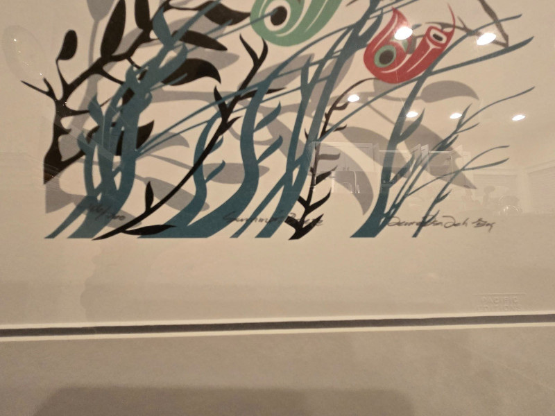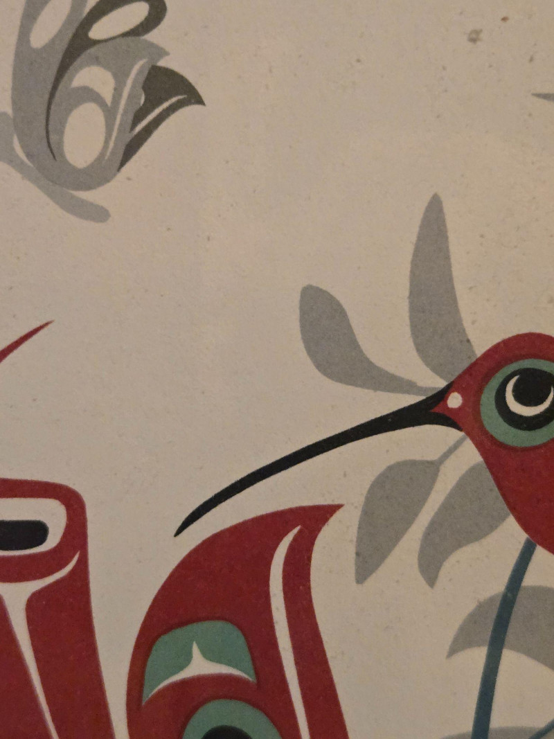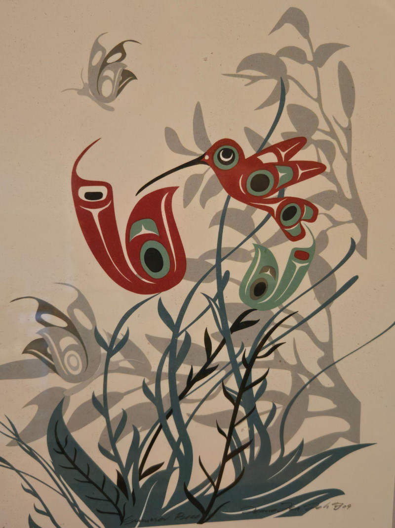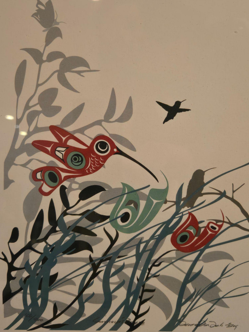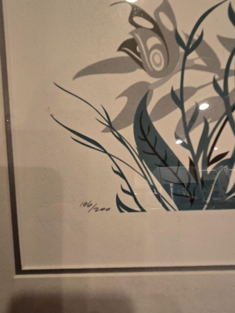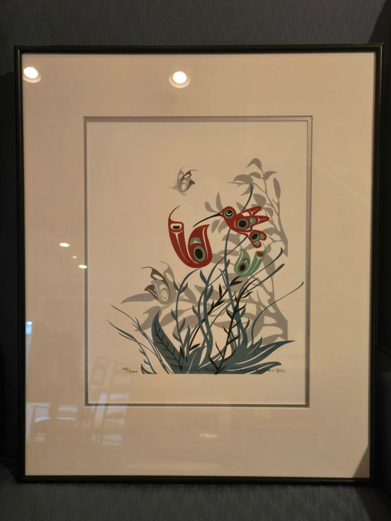 This matched pair of framed silk screen prints by Kwakwaka’wakw artist Francis Dick showcases her distinctive visual language rooted in Northwest Coast traditions. Each print features three stylized birds rendered in red, green, black, and gray tones, surrounded by abstract foliage and airborne elements. Left print (2004): Three birds among tall grasses with a small bird in flight Right print (2003): Three upright birds with a bee hovering above Medium: Silk screen on paper Edition: Limited; both signed and dated by the artist Condition: Professionally framed, excellent condition Artistic Significance