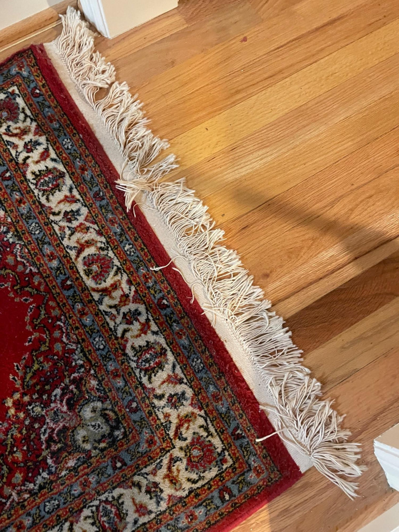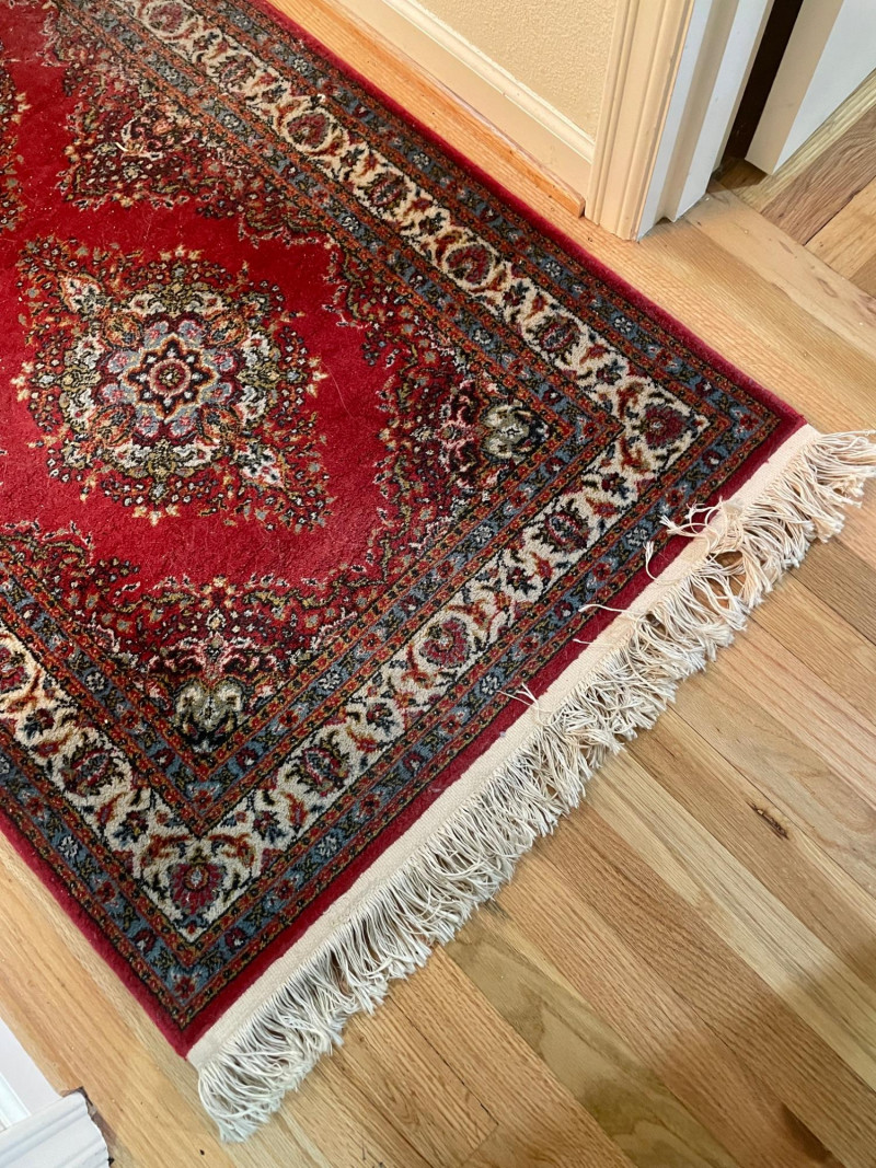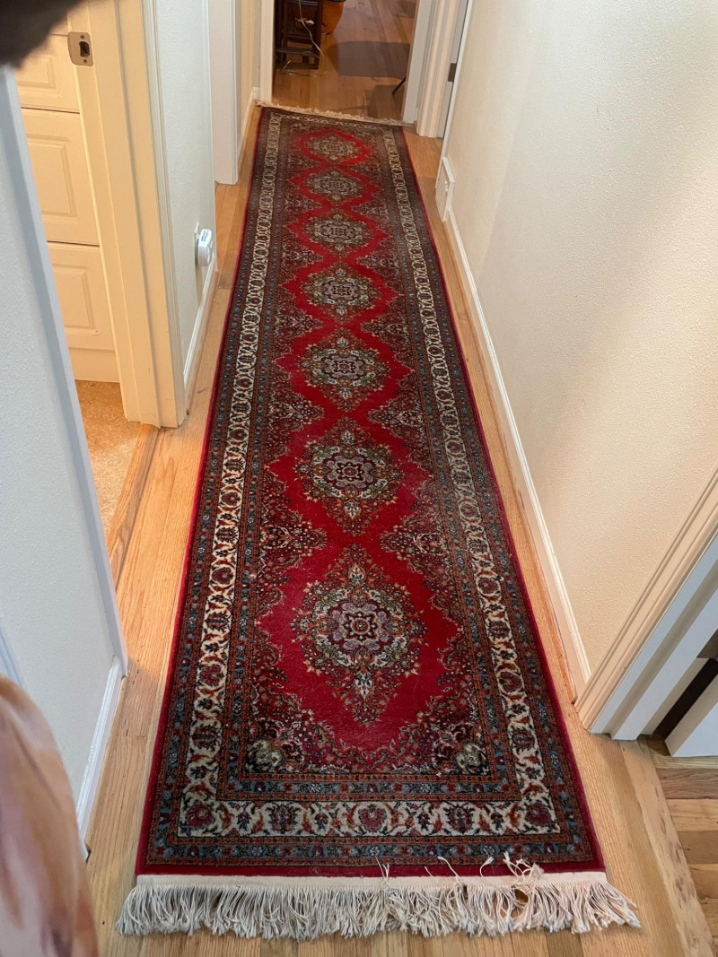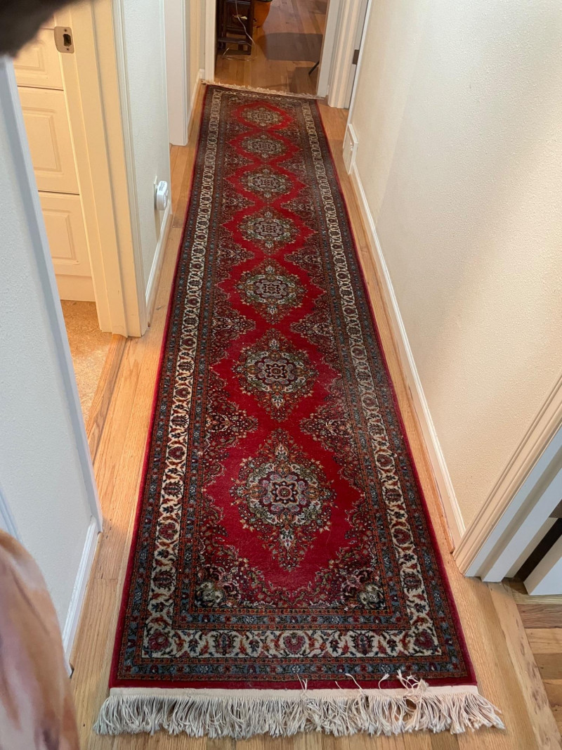 This long, narrow runner features: Color Palette: Deep red background with accents of blue, cream, and brown Design: Central row of diamond-shaped medallions filled with floral and geometric patterns Border: Detailed floral motif framed by cream fringe at one end Style: Traditional Persian or Oriental Condition: Excellent; vibrant colors and clean weave
