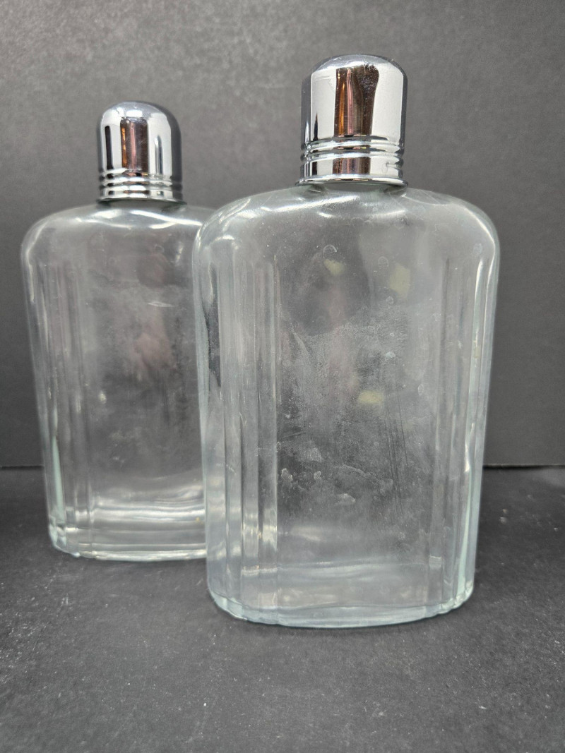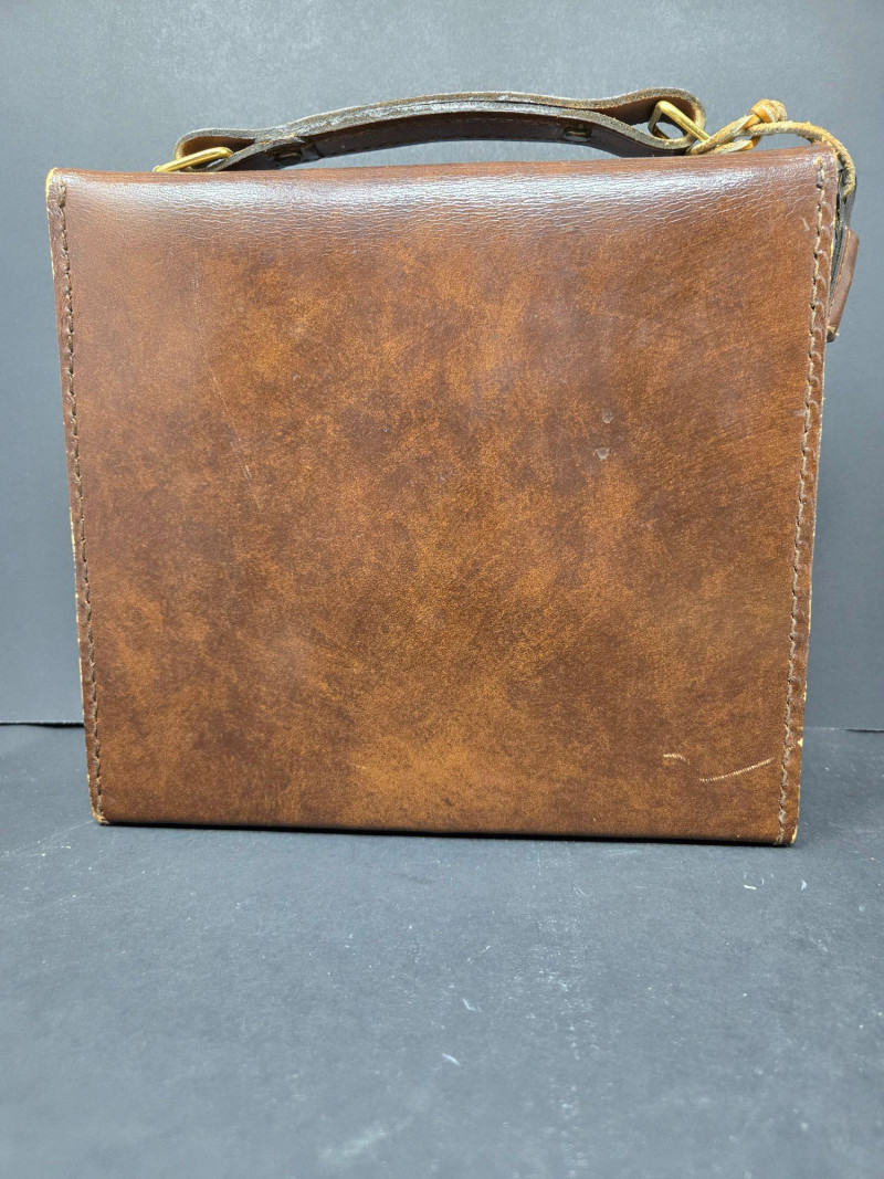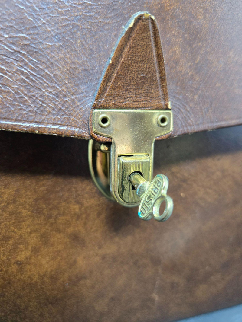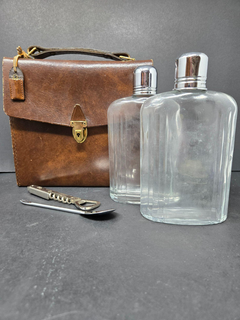 Vintage Traveling Bar Case with Presto Key, is a nostalgic and stylish set perfect for collectors or entertainers with a taste for classic flair. Brown leather case: Compact and structured with a brass clasp, evoking mid-century travel elegance. Two clear glass flasks: Each with shiny silver-tone caps, ideal for spirits or mixers. Presto key: A vintage accessory, for securing the case. Bar tools: Includes a metal corkscrew and small spoon, completing the portable cocktail setup.