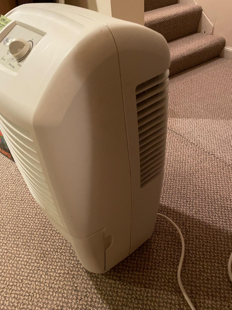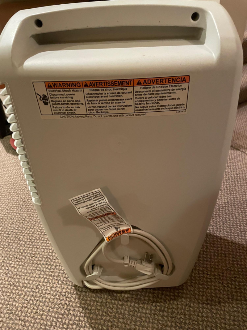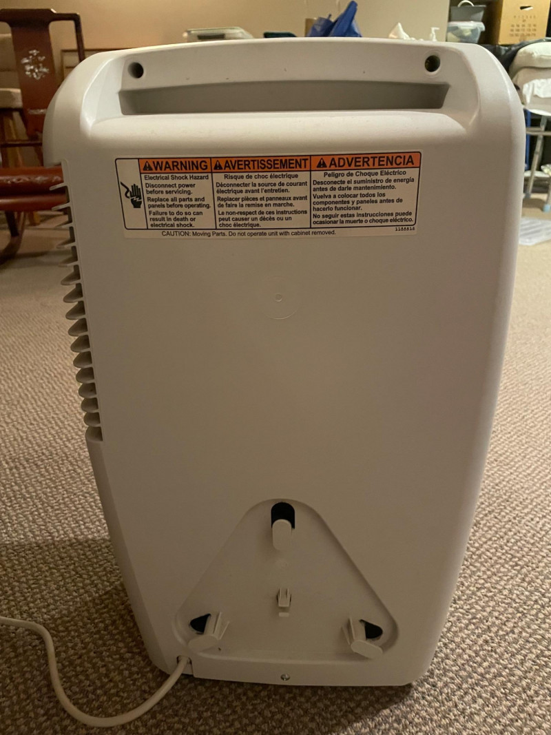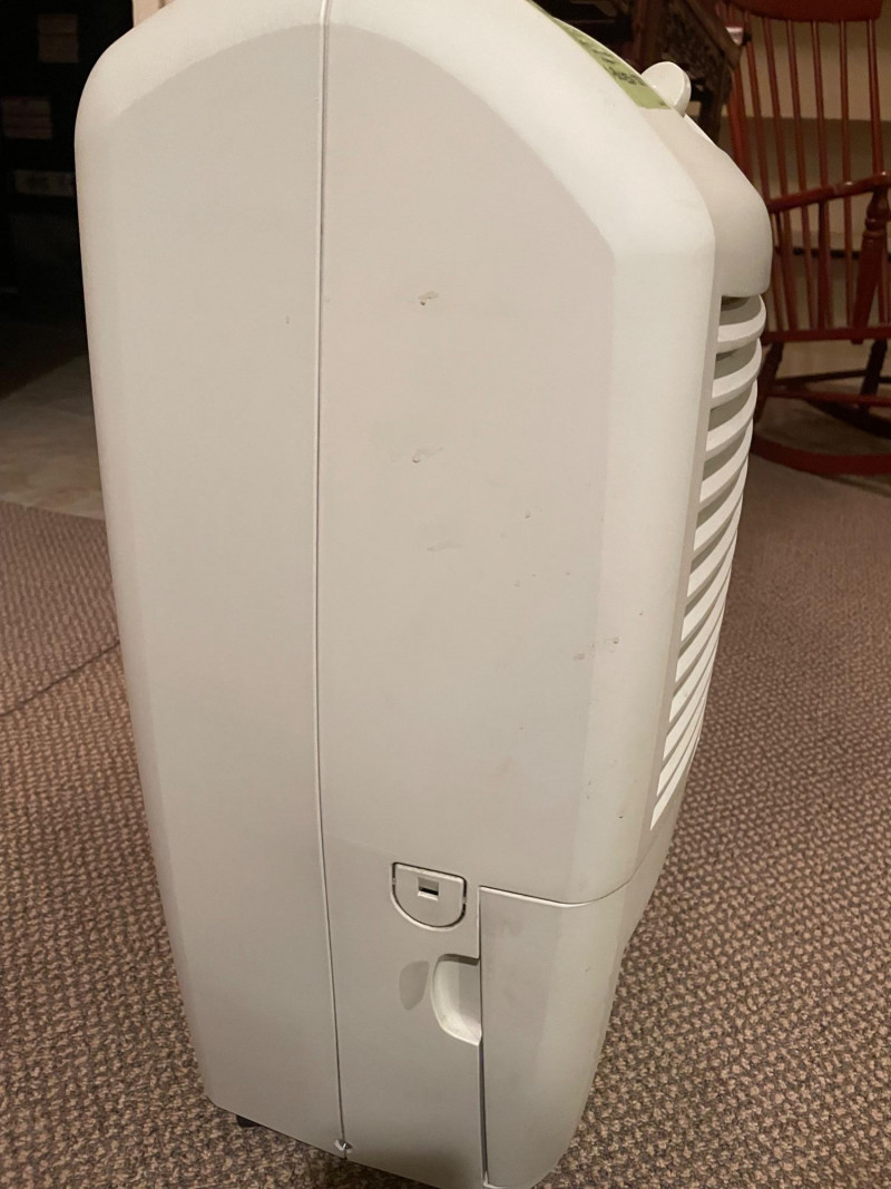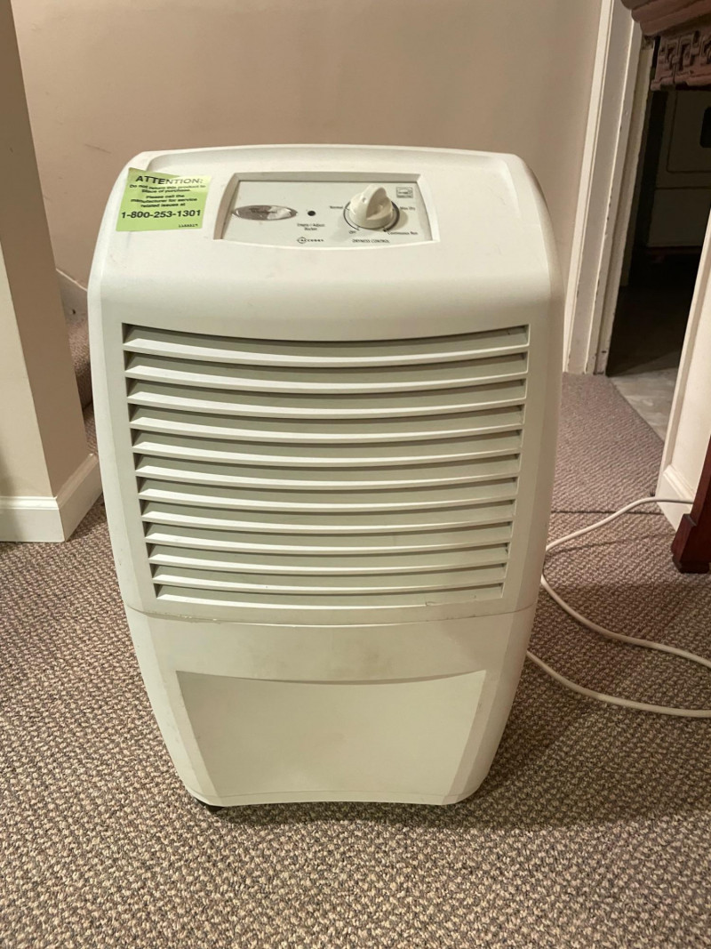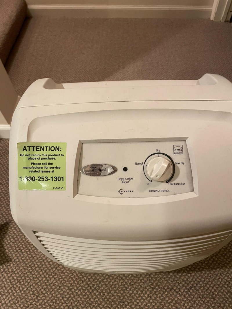 This Whirlpool dehumidifier features: Design: White exterior with front-facing vent panel Controls: Top-mounted rotary dial labeled “Dryness Control” and small display window Safety Label: Green sticker with support contact info Function: Helps prevent mold, mildew, and dampness by extracting moisture from the air Brand: Whirlpool Condition: Excellent; clean and functional