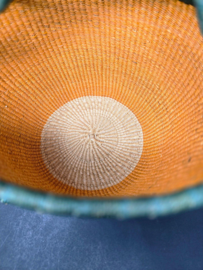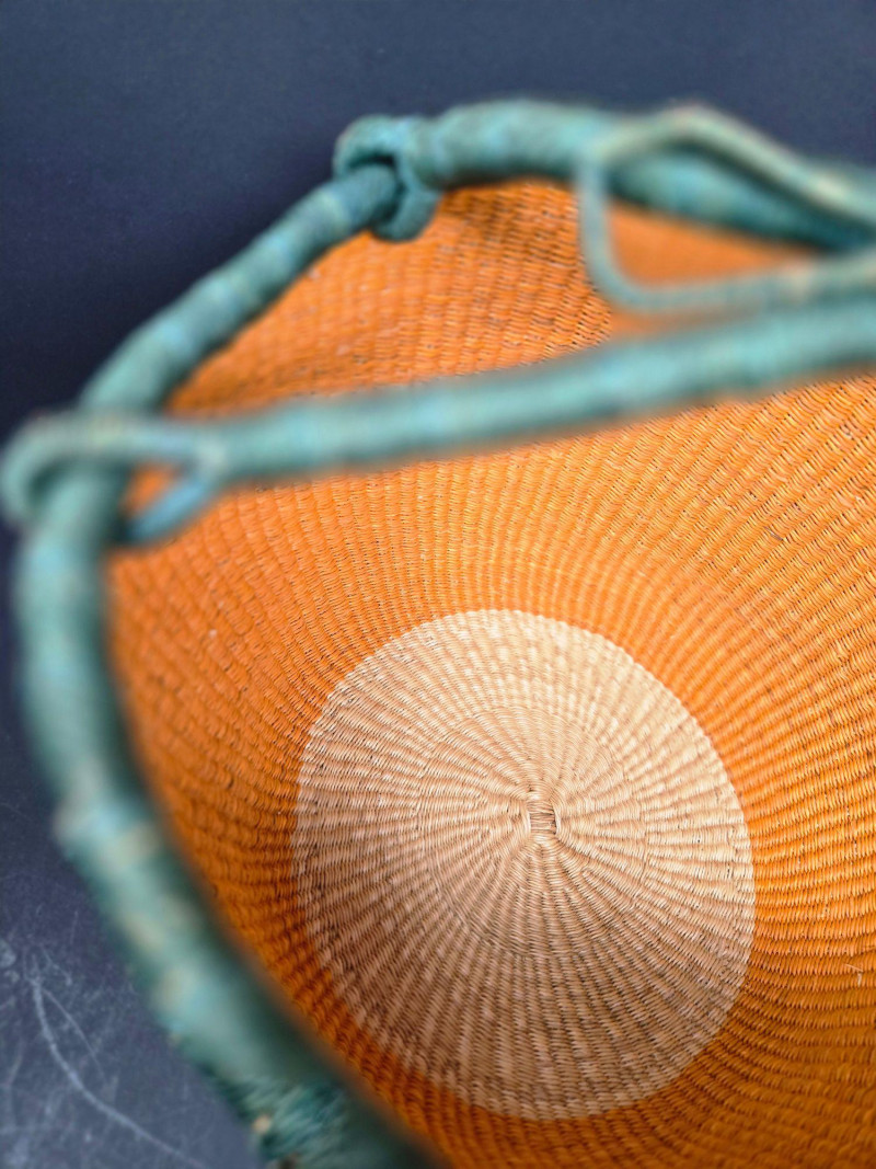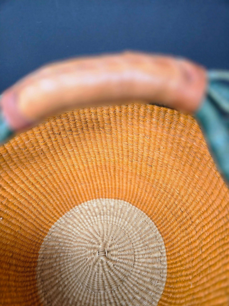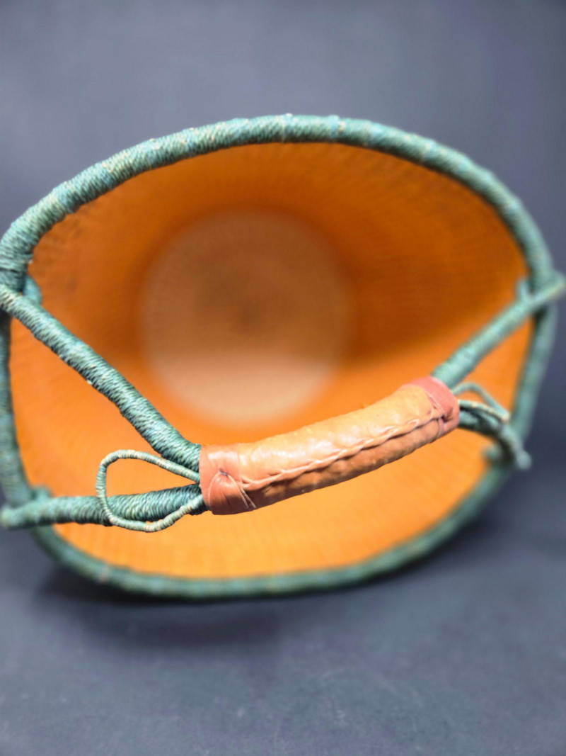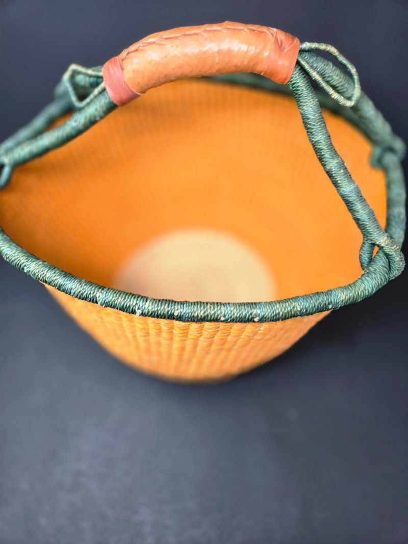 Handwoven African Bolga Market Basket, is a vibrant and functional piece of traditional Ghanaian craftsmanship. 16" across & 14"T Material: Woven from elephant grass, known for its durability and flexibility, with a tan interior and green exterior. Handle: Wrapped in stitched brown leather for comfort and strength, secured with green cord. Design: Circular shape with a wide opening, ideal for market shopping, storage, or decorative use. Origin: Crafted in the Bolgatanga region of Ghana, where basket weaving is a celebrated cultural art.
