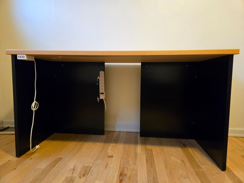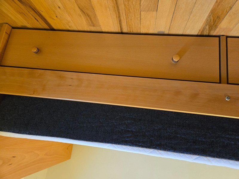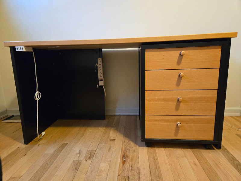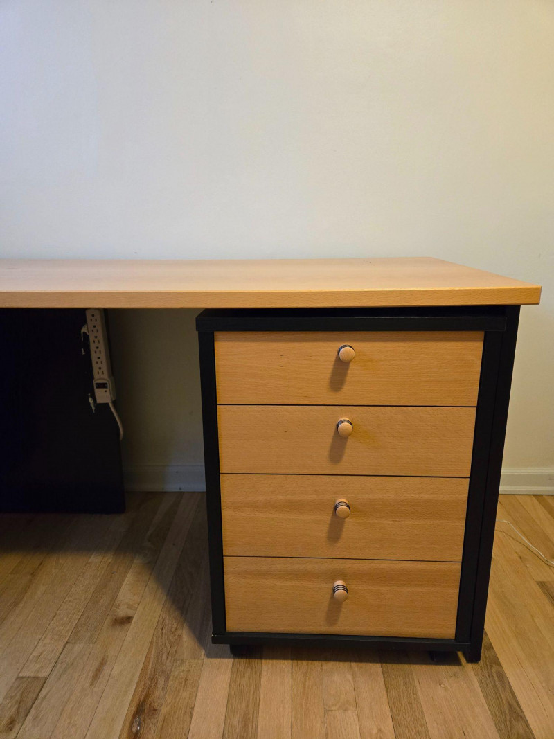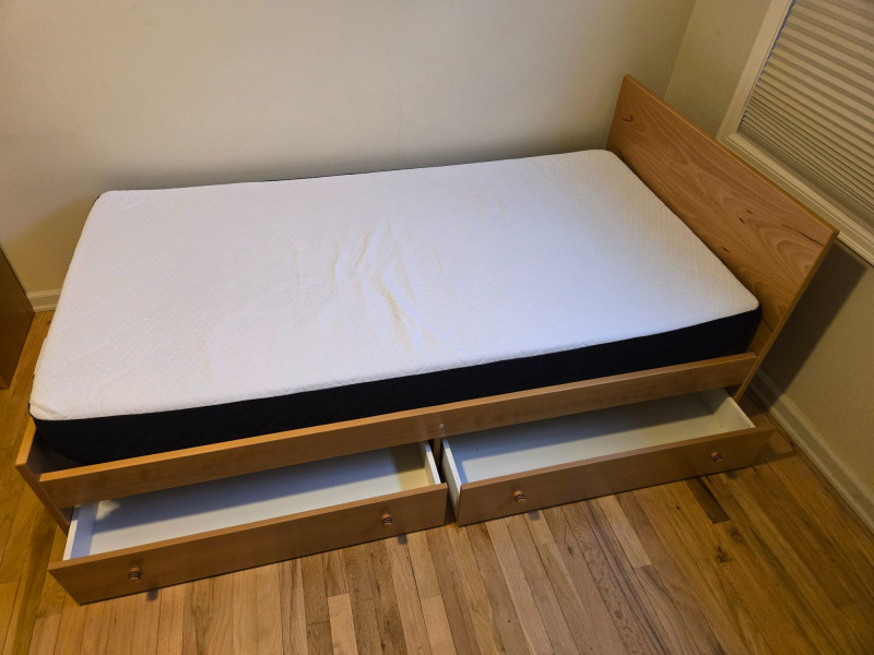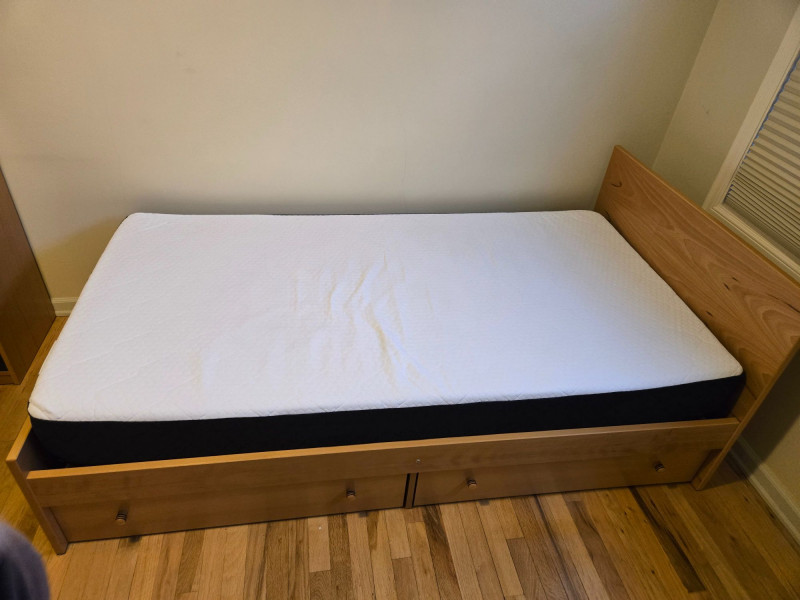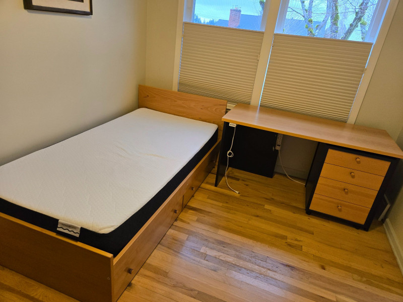 Twin Size Bed Frame with Nesting Drawers & Matching Desk, is a smart, space-saving duo ideal for student rooms, guest quarters, or compact living. Twin bed frame: Sleek wood construction with built-in storage drawers underneath—perfect for organizing linens, clothing, or personal items.75"l x 42"d x 30"t/headboard Matching desk: Light wood top with black frame and three integrated drawers, plus a mounted power strip and charging cable for tech-friendly functionality. 29"t x 25"d x 55"w Setting: Positioned near tall windows with pleated blinds, offering natural light and a clean, modern aesthetic. Dimensions: Bed approx. 75” x 40”; desk approx. 48” x 24” x 30” (estimated).