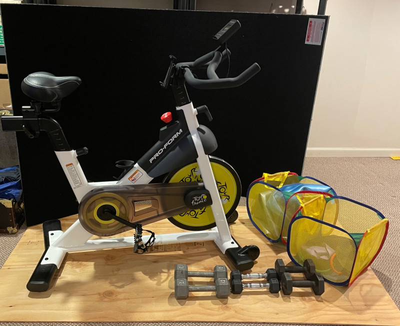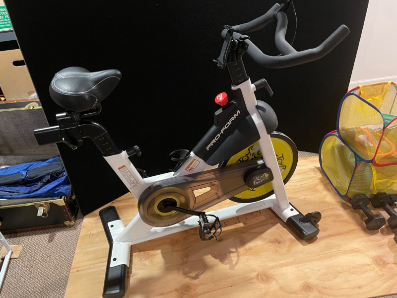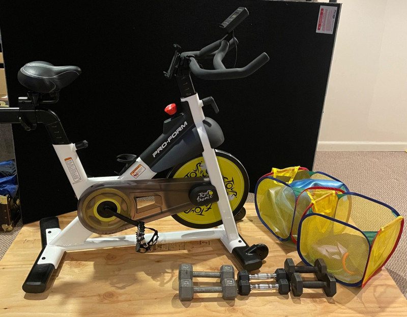 A practical, ready‑to‑use home workout bundle perfect for anyone looking to build or expand their fitness setup. This lot includes a Proform stationary bike, a large protective floor pad, and a selection of miscellaneous weights and accessories—ideal for cardio, strength training, and general conditioning. Proform Stationary Bike