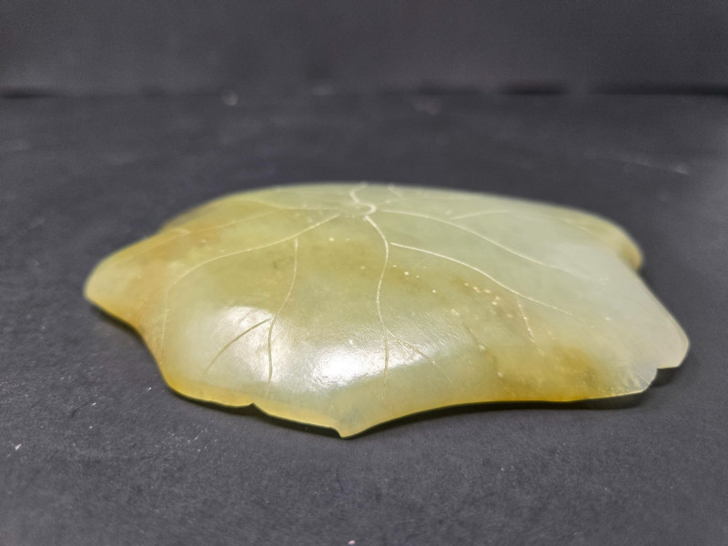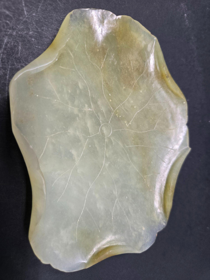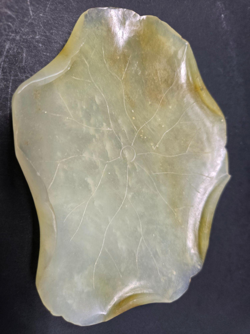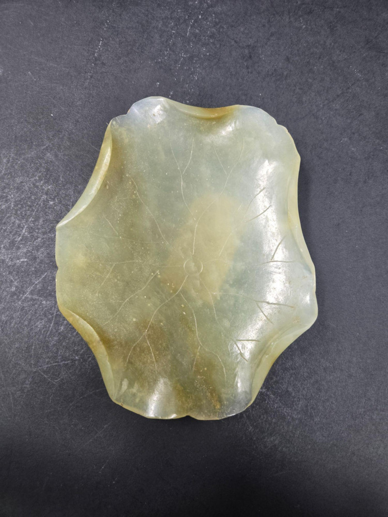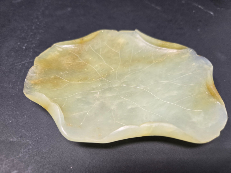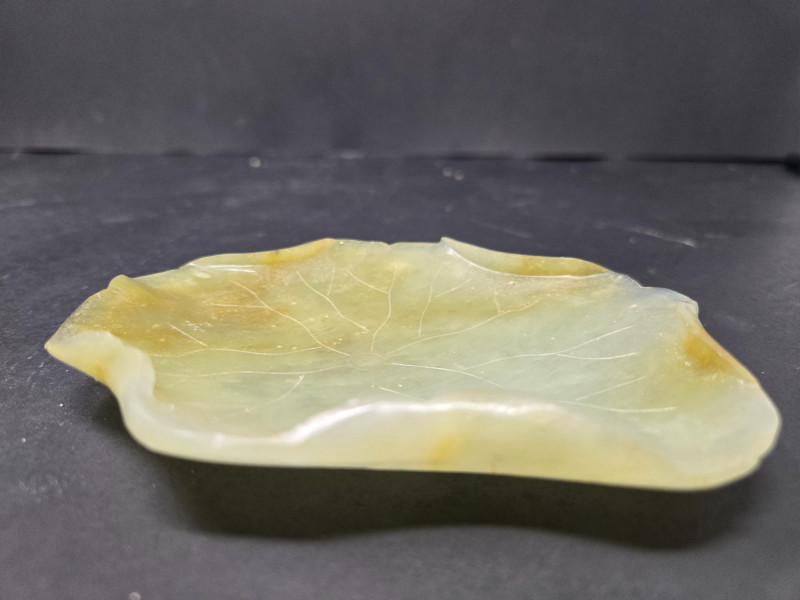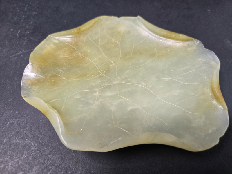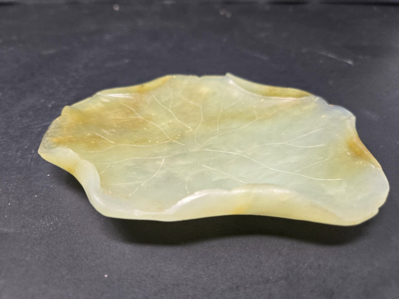 Vintage Chinese Soapstone Dish is a finely carved piece that blends natural beauty with cultural symbolism. Material: Soapstone—known for its smooth texture and subtle translucence, often used in traditional Chinese carving. Design: Shaped like a lotus leaf with delicate vein-like engravings radiating from the center. The undulating edges and organic form evoke serenity and natural elegance. Symbolism: The lotus is a revered motif in Chinese art, symbolizing purity, harmony, and spiritual awakening. Craftsmanship: Likely hand-carved, showcasing skilled artistry and attention to detail. 4" x 6"