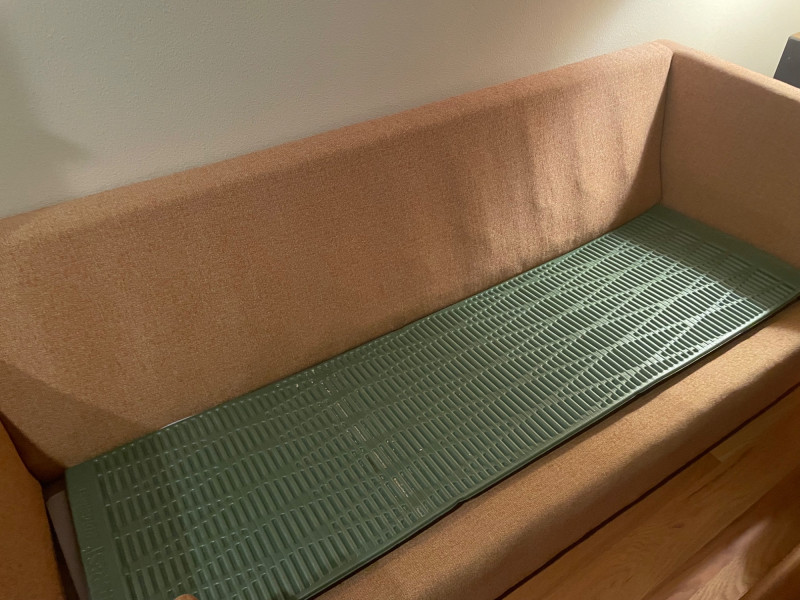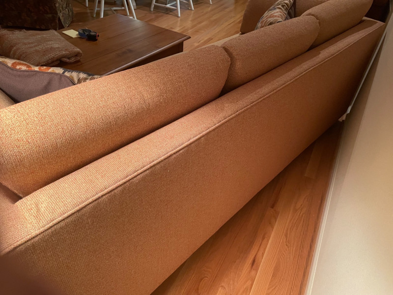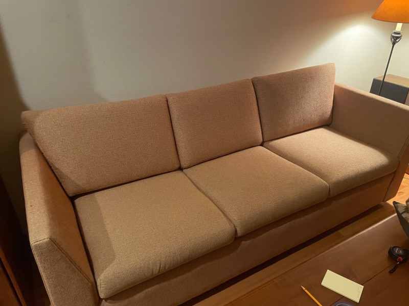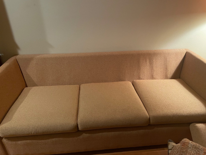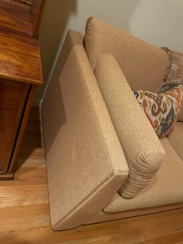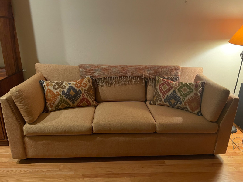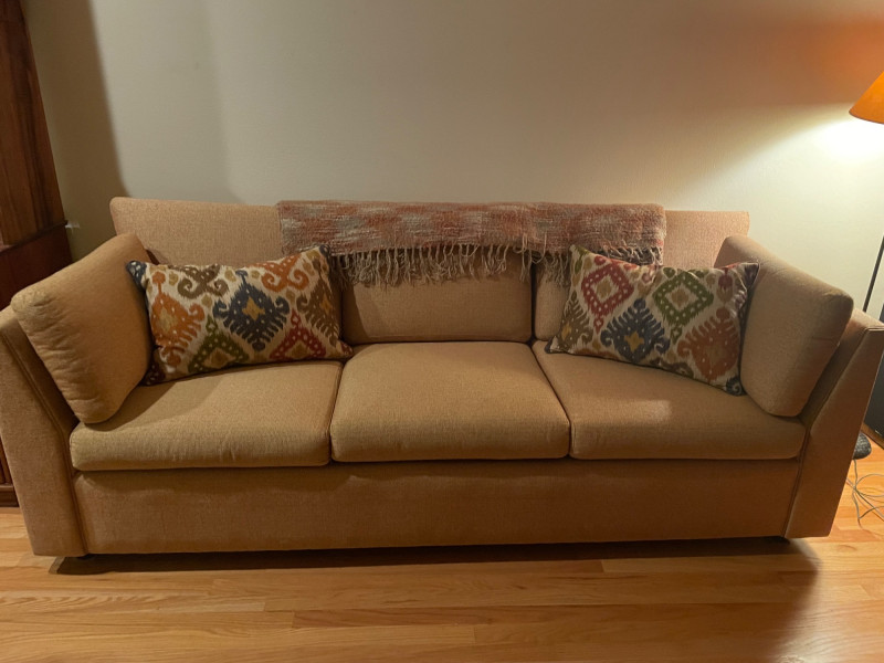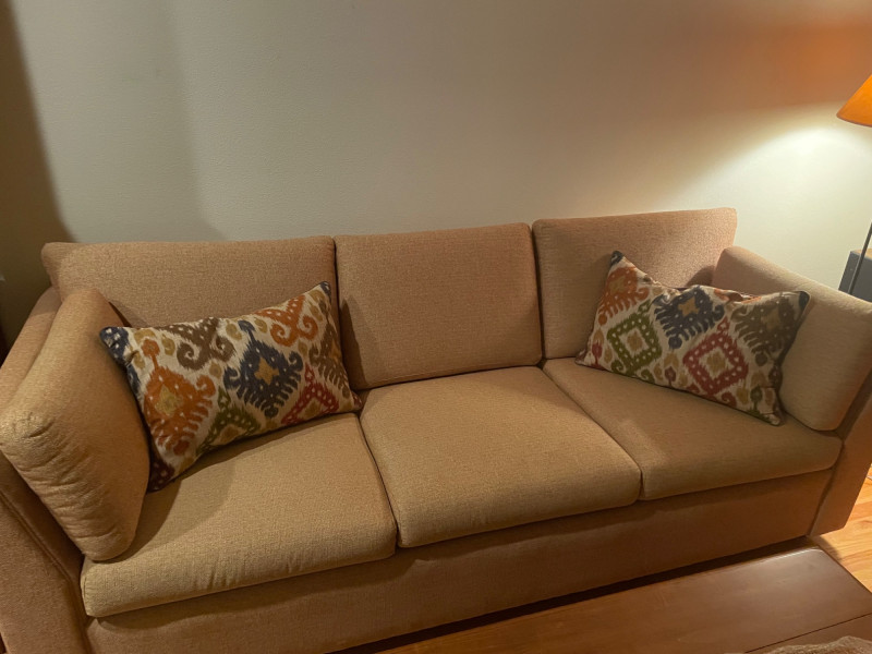 Couch Unknown Brand. 84” L x 35” D x 28” H 3 Seat cushion 23”D Floor to seat 18” 7’ Sand Color Couch with Decorative Pillows, is a warm and inviting centerpiece ideal for a relaxed living space. This three-seat sofa features: Neutral sand-toned upholstery: Soft and versatile, perfect for blending with both earthy and vibrant palettes. Decorative pillows: Two patterned cushions in red, green, blue, and beige tones add a pop of color and symmetry. Textured throw blanket: Draped over the backrest in shades of brown and beige, enhancing the cozy aesthetic. Dimensions: Approximately 84” long, offering generous seating with plush armrest and seat cushions.