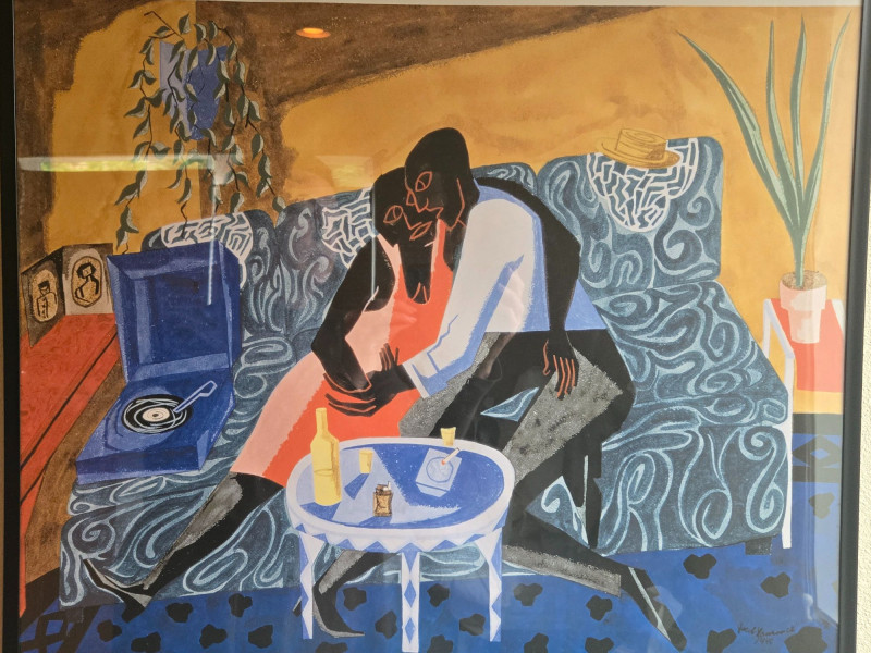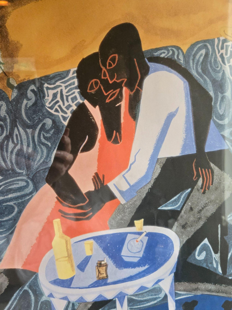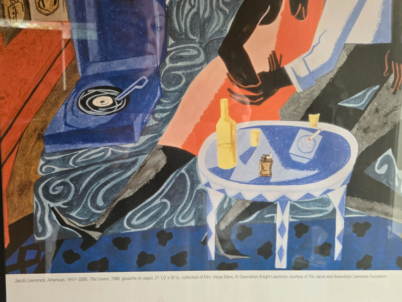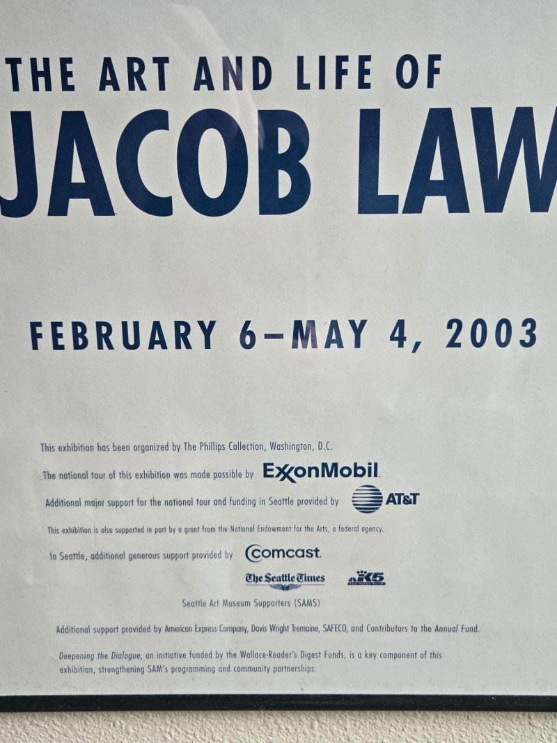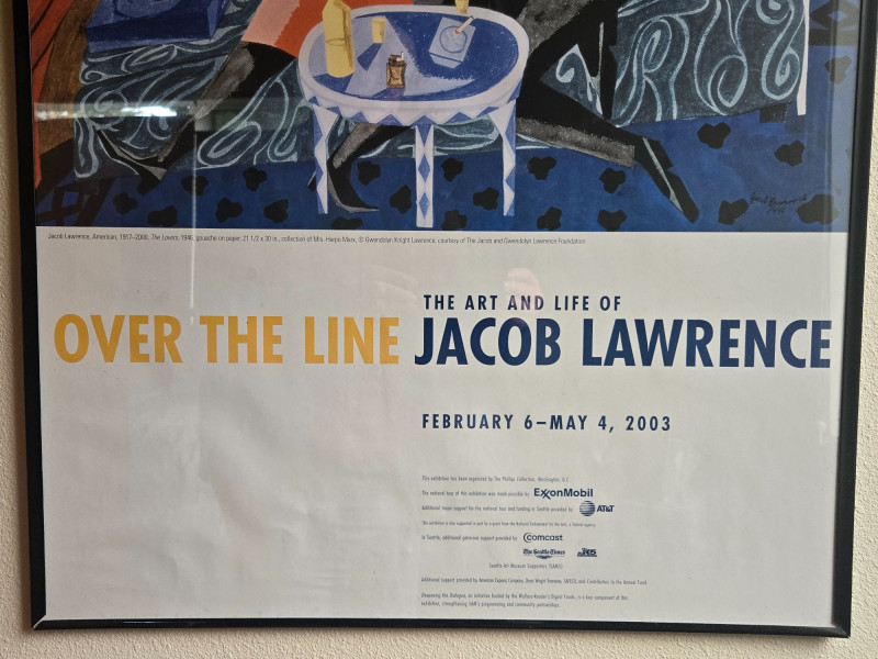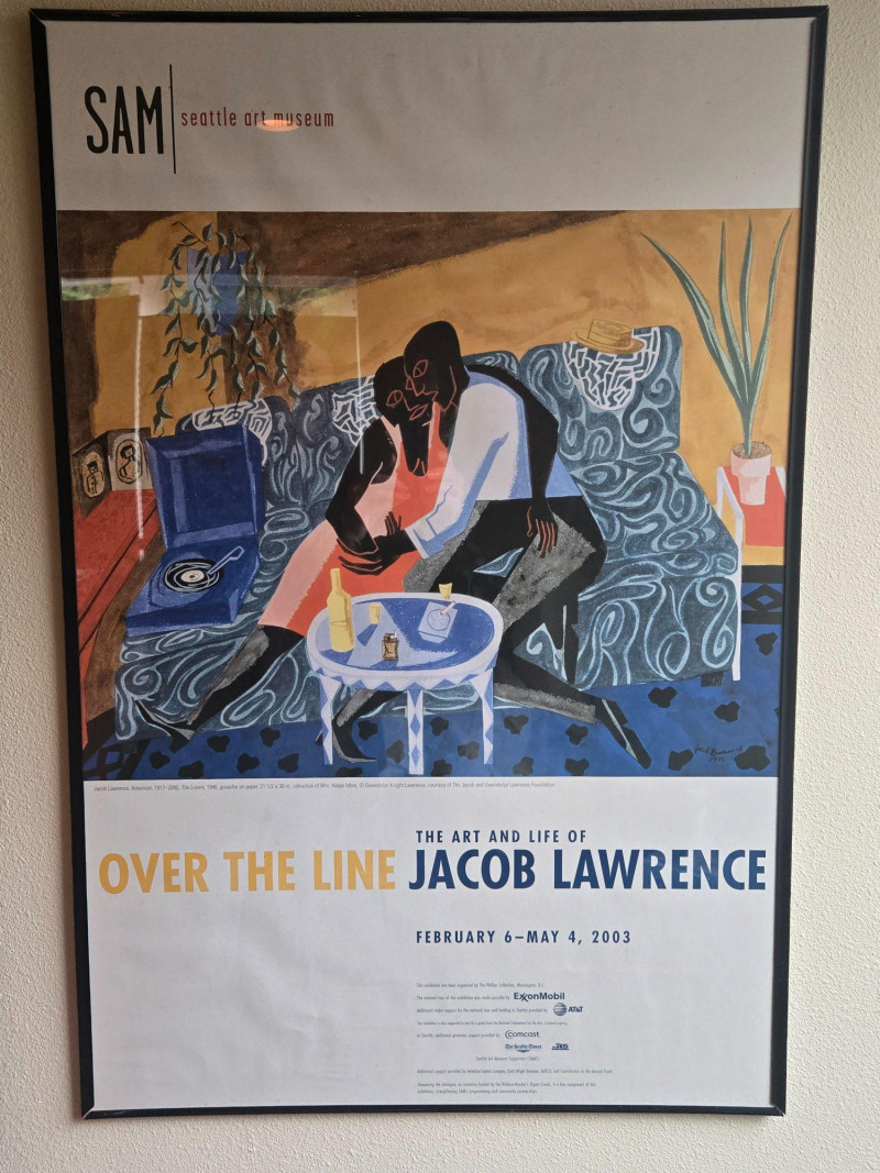 SAM/Jacob Lawrence Exhibition Print, is a framed poster from the 2003 Seattle Art Museum retrospective Over the Line: The Art and Life of Jacob Lawrence. This piece celebrates one of America’s most influential modern painters, known for his vivid portrayals of African-American life and history. Artwork: Depicts two figures seated on a patterned couch in a domestic setting, surrounded by a record player, potted plant, and table with bottles—evoking warmth, intimacy, and rhythm. Exhibition Details:
