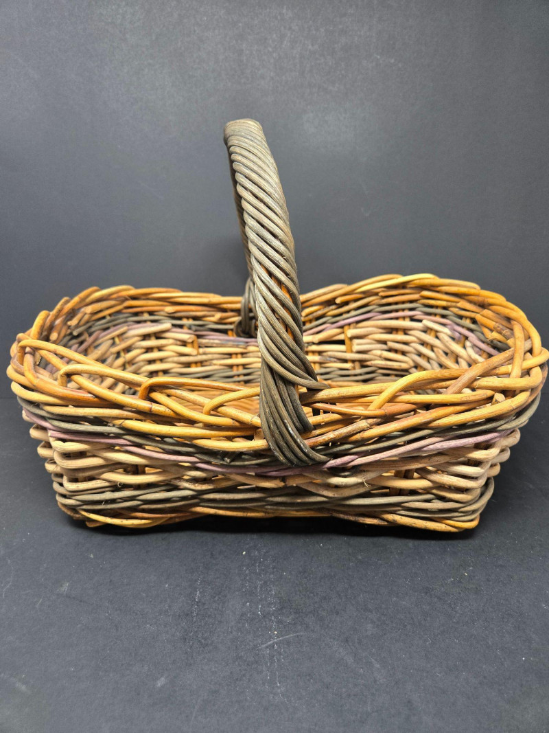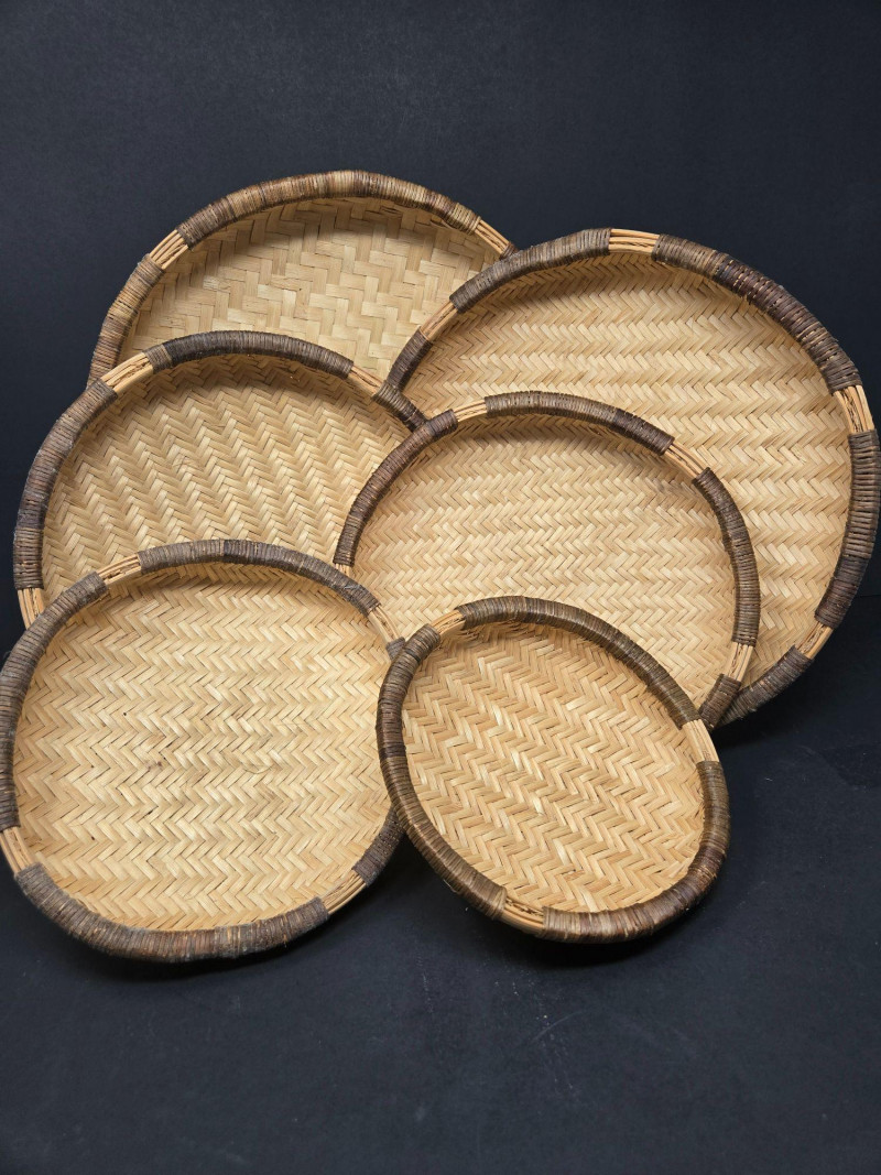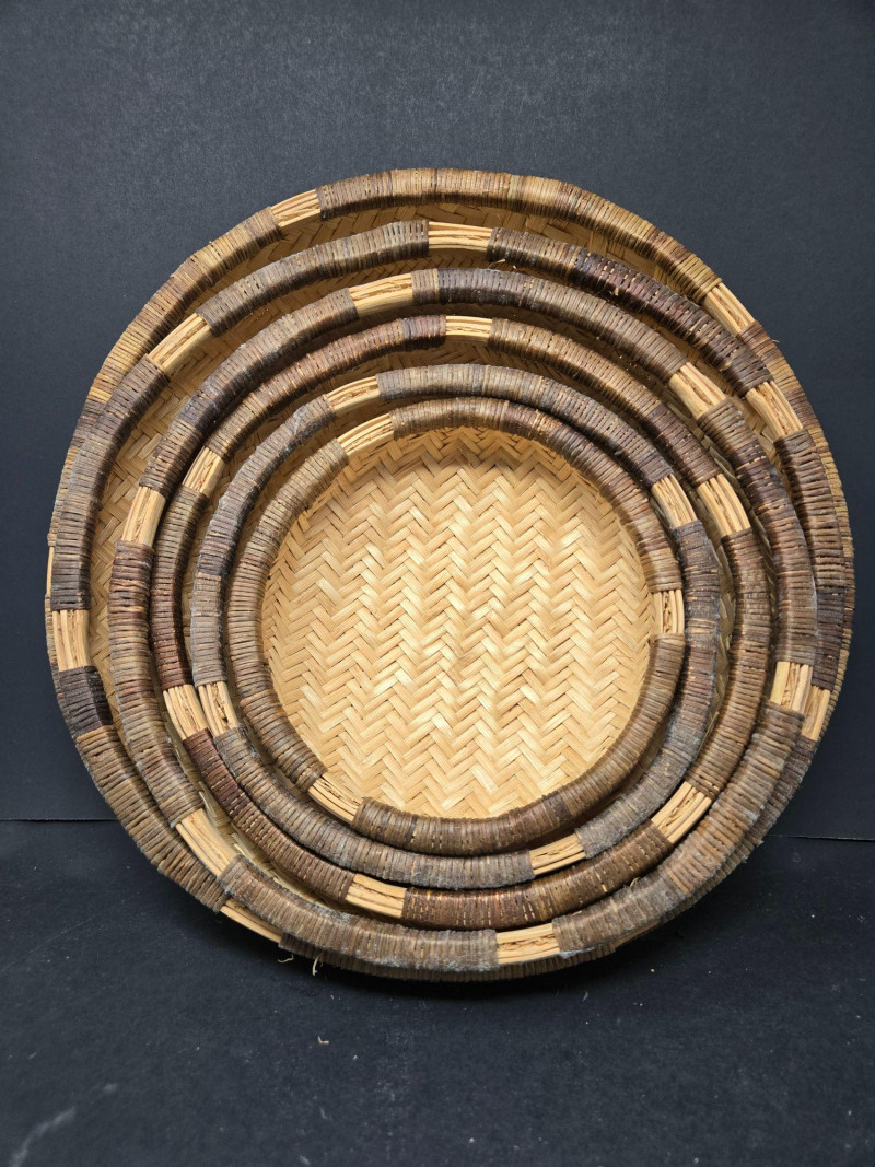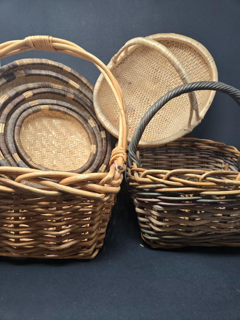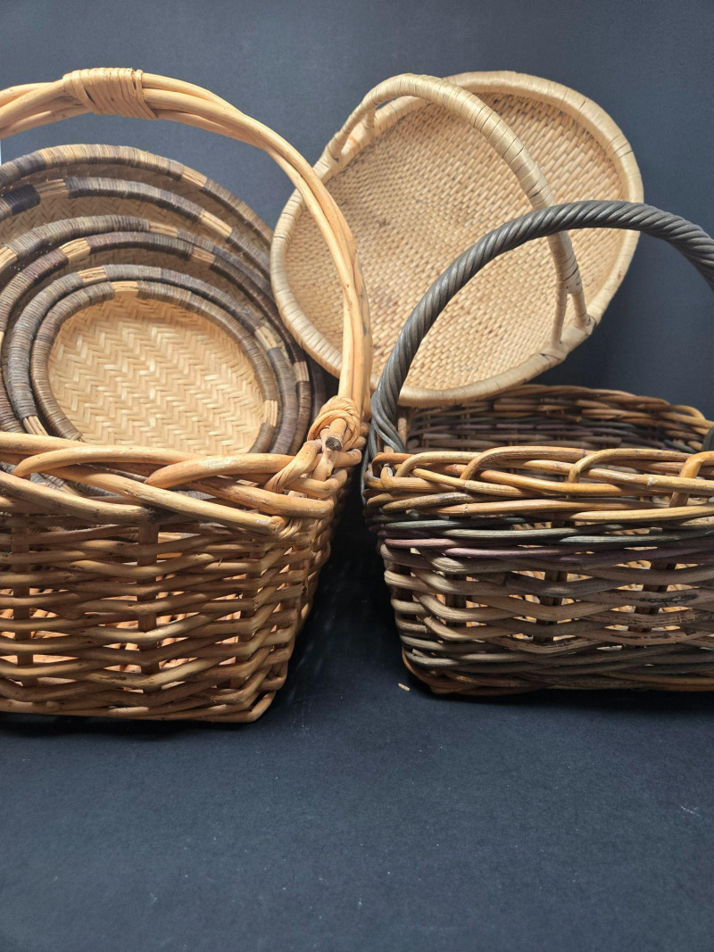 Nesters 7-13 1/2" Lg oblong 15"w x 13"d x18"t (to top of handle) Sm oblond 15" x 11" x 10 1/2t Oval 13" x 10 1/2" 9"t Collection of 9 Woven Baskets, is a versatile and visually appealing set ideal for storage, display, or staging. 6 Nesting Baskets: Round woven trays with varied light and dark patterns, stackable for compact storage or layered presentation. 2 Oblong Baskets: Rectangular with handles, perfect for organizing linens, pantry items, or crafting supplies. 1 Oval Basket: Smooth curves and a wide opening make it ideal for fruit, mail, or decorative arrangements. Crafted from natural fibers like rattan or wicker, these baskets showcase traditional weaving techniques and earthy charm.