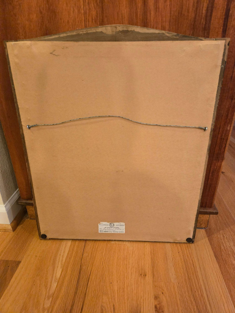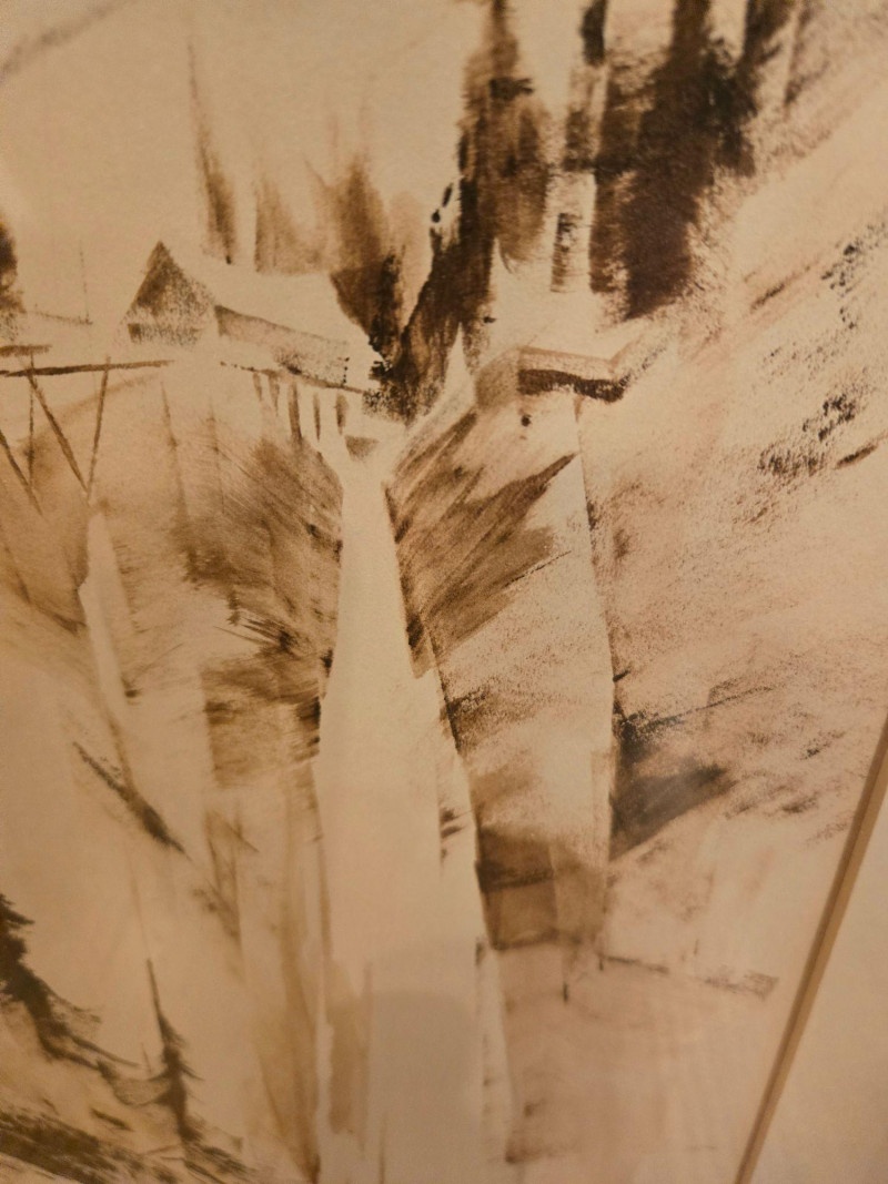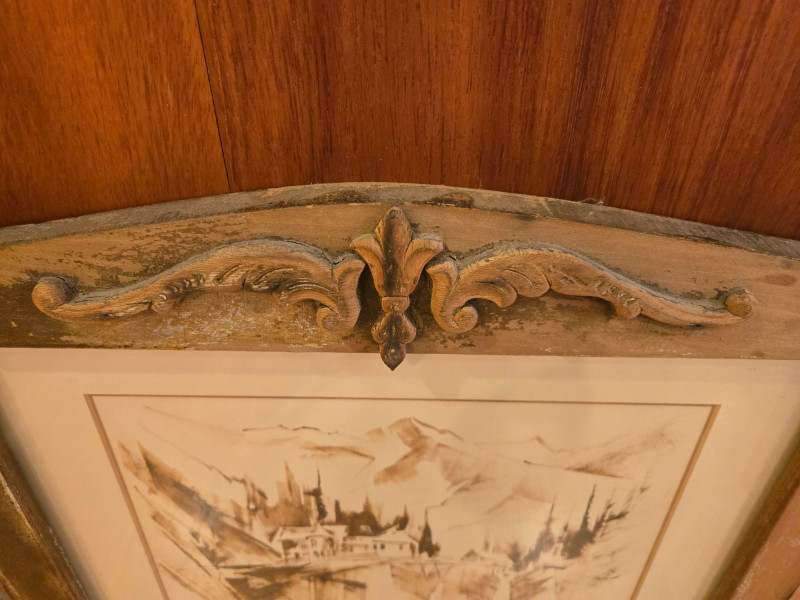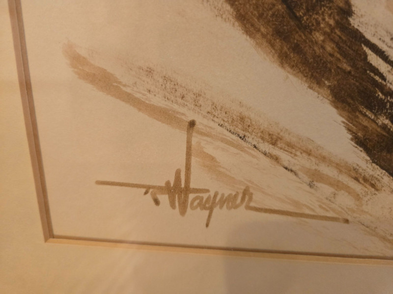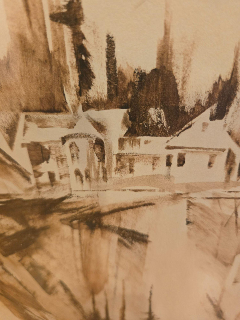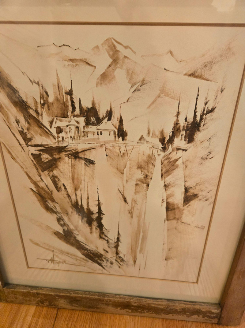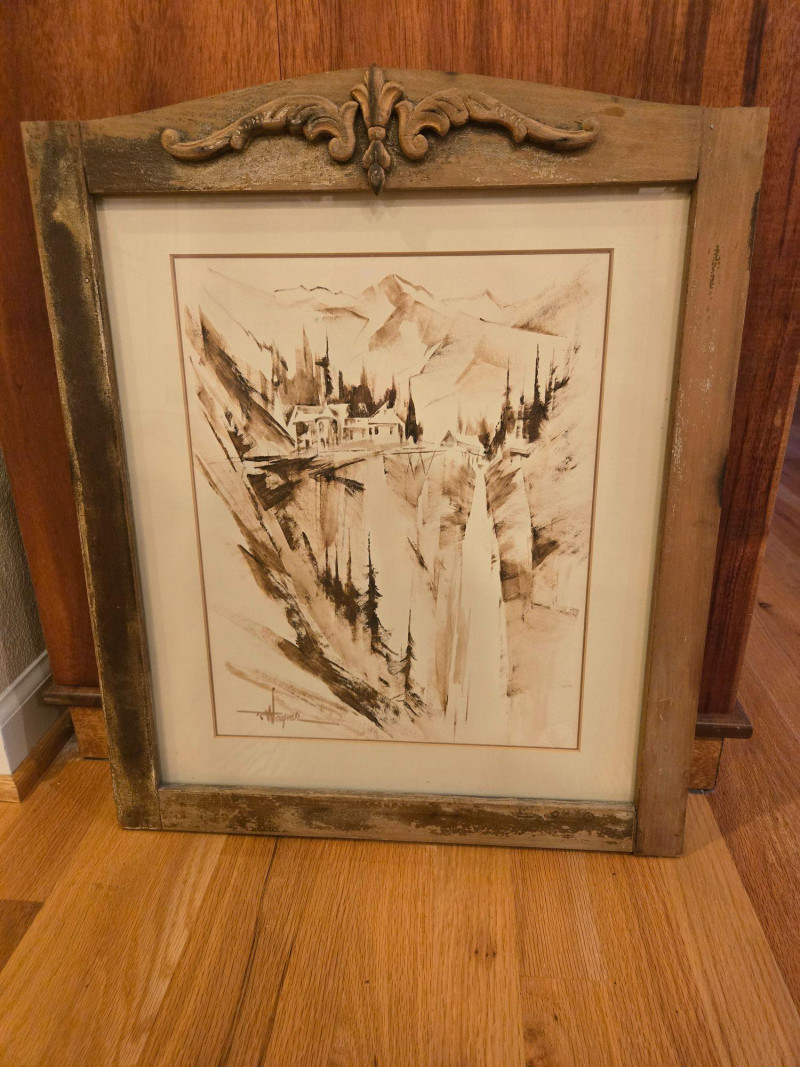 "Bridalveil Falls" Acrylic, Naples Florida, is a framed landscape painting that blends expressive brushwork with a serene, sepia-toned palette. Medium: Acrylic on canvas, offering rich texture and dynamic depth. Subject: A stylized view of Bridalveil Falls surrounded by tall pines, rustic buildings, and a reflective body of water—evoking tranquility and natural grandeur. Style: Monochromatic tones with abstract, gestural strokes that suggest movement and atmosphere. Frame: Ornate carved wood with a rustic finish, enhancing the nostalgic and earthy feel. Signature: Signed by the artist in the lower left corner (signature not fully legible).