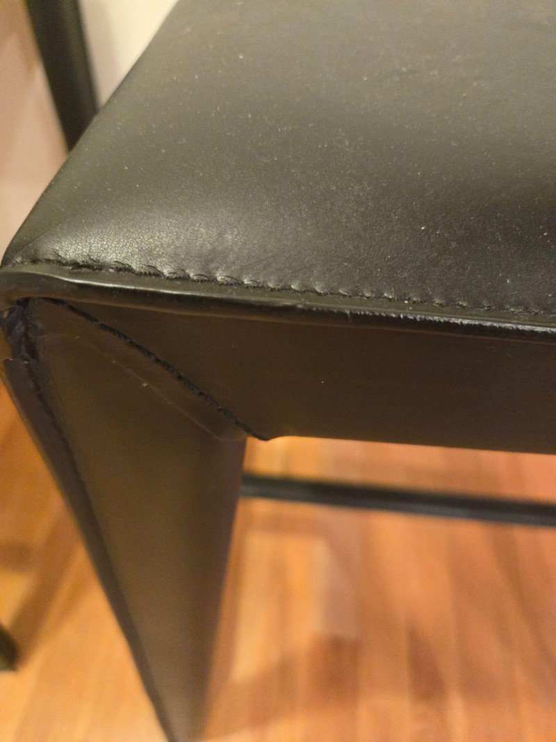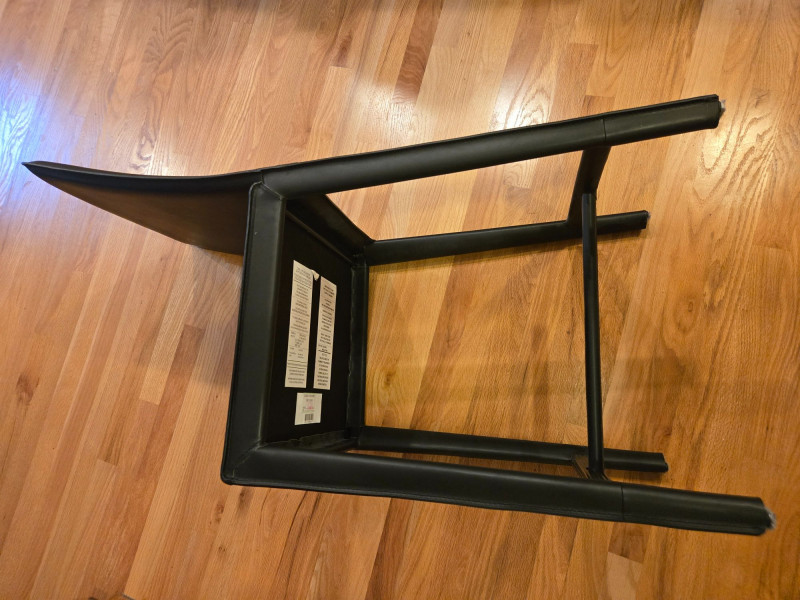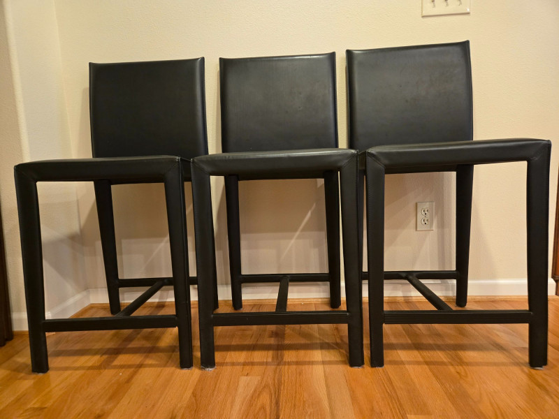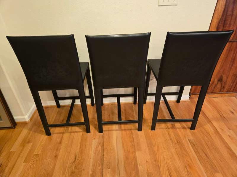 seat 17 1/2" x 15 1/2" floor to seat 24" floor to top of back 39" Trio of Firm Black Leather Bar Chairs offers sleek comfort and modern utility for kitchen islands, home bars, or casual dining spaces. Material: Black leather-like upholstery with a smooth, durable finish. Design: Square seat and backrest, straight legs with footrests for added support. Quantity: Set of three identical chairs—ideal for symmetrical arrangements or grouped seating. Condition: Like new, with firm cushioning and clean lines that suit contemporary interiors.