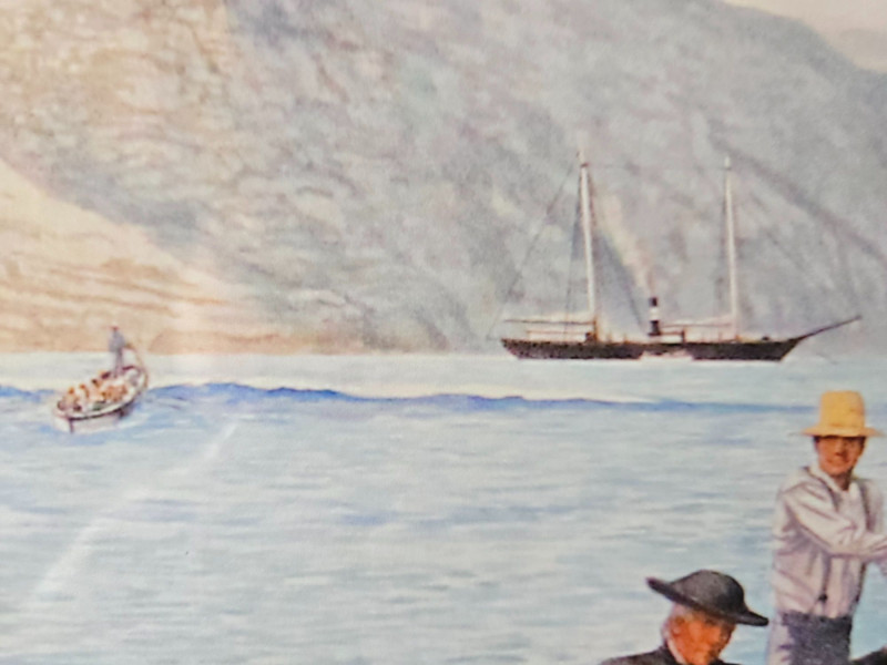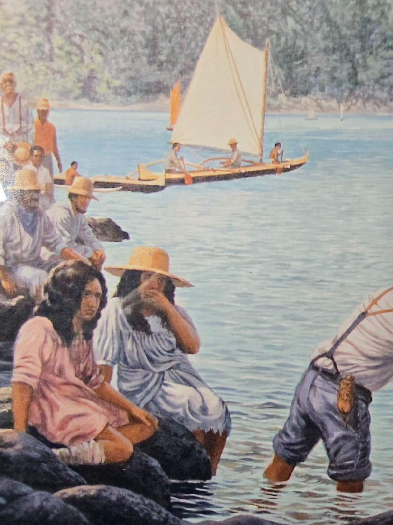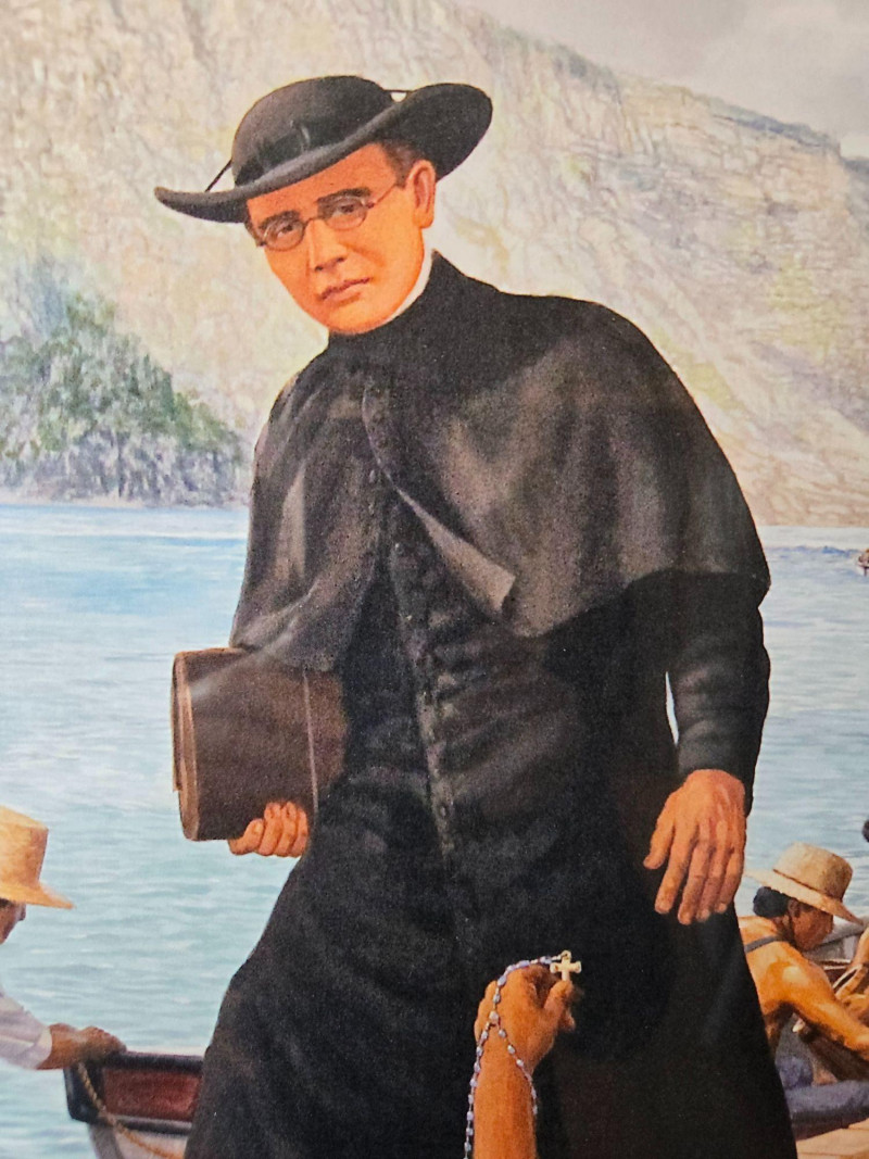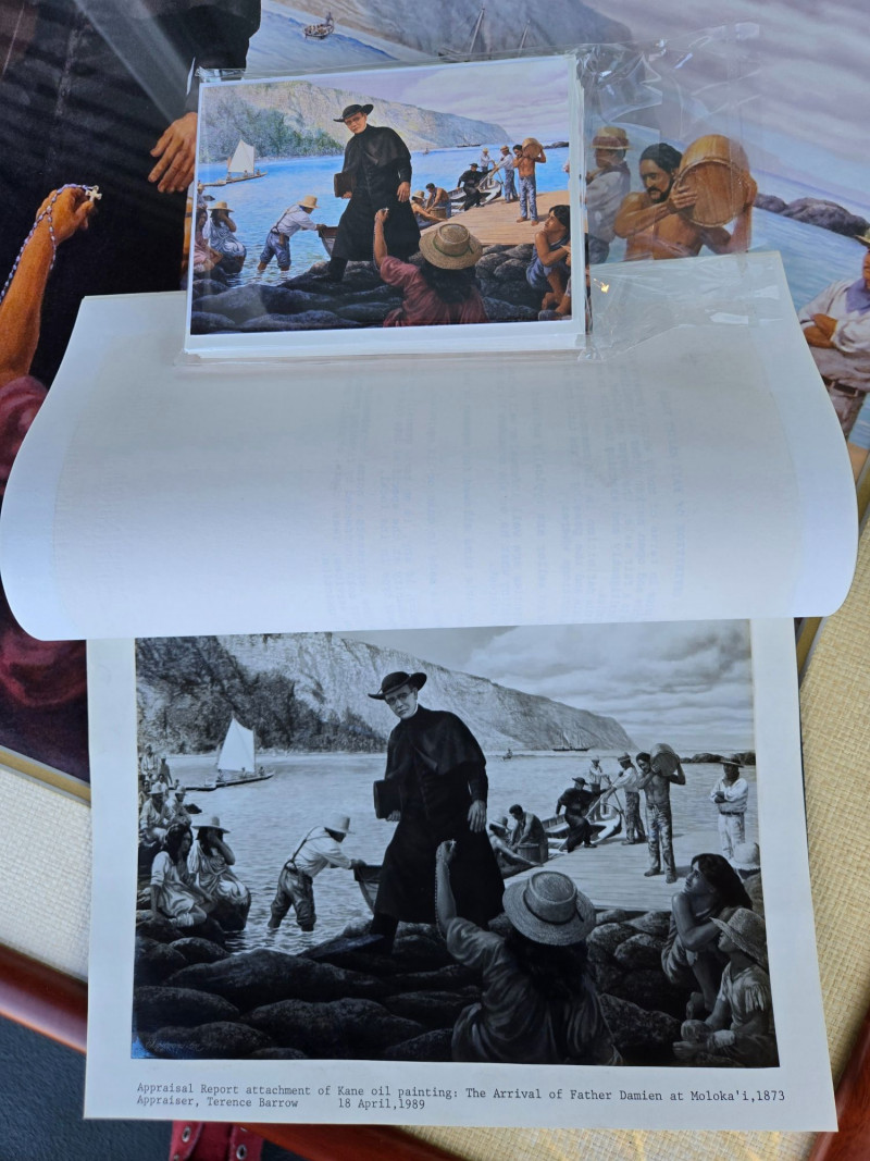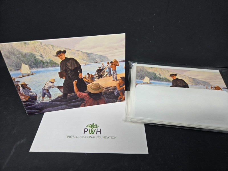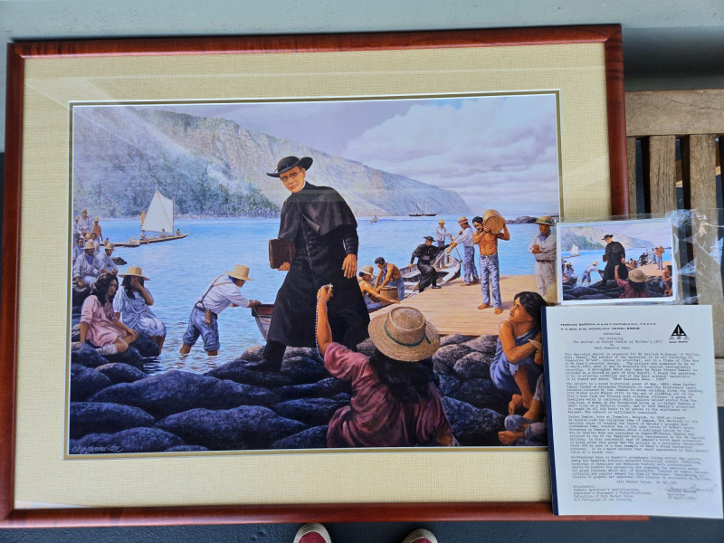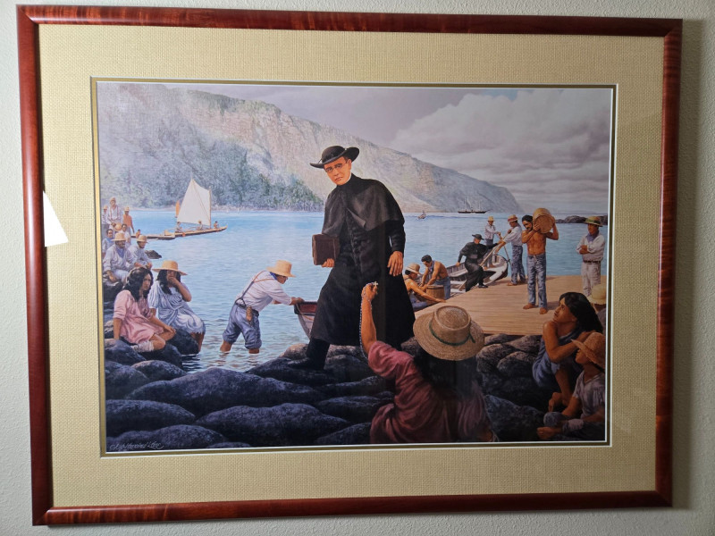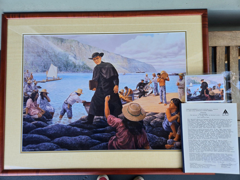 Herb Kawainui Kāne depicts the arrival of Father Damien at the Kalaupapa leper colony on the Hawaiian island of Molokai in 1873 Father Damien, born Joseph De Veuster in Belgium, volunteered to serve the isolated community after a call from his bishop. He dedicated his life to the physical and spiritual care of the residents, who had been forcibly exiled due to leprosy. He built homes, churches, and coffins for the deceased, treating the people with dignity and respect. Father Damien contracted the disease himself and died in 1889. He was canonized as a saint by the Catholic Church in 2009 and is known as the "Apostle to the Lepers" Description