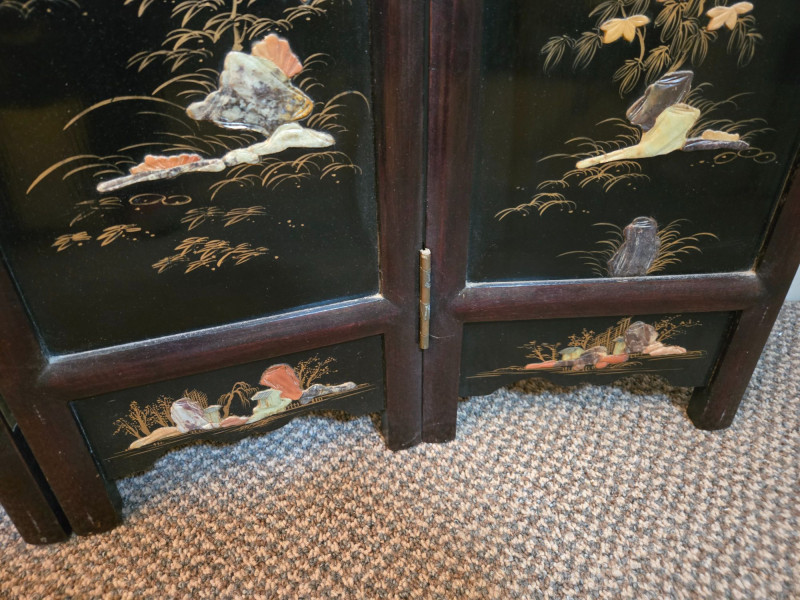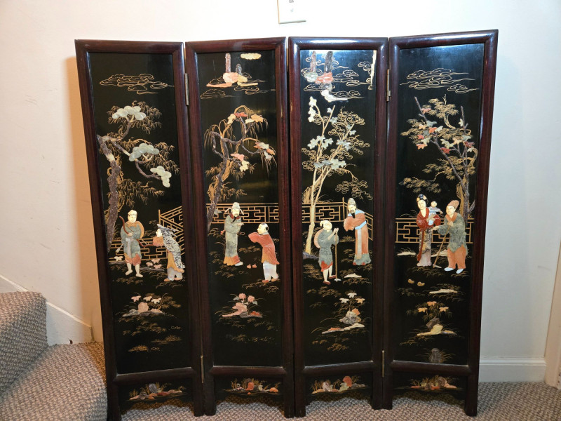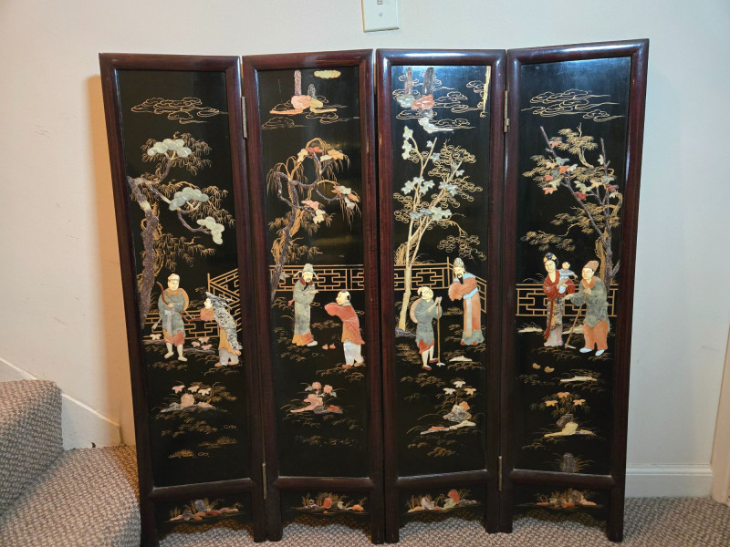40"w x 40t x 1"d Asian Panels is a stunning four-panel folding screen that blends traditional artistry with functional elegance. Four-Panel Asian Folding Screen