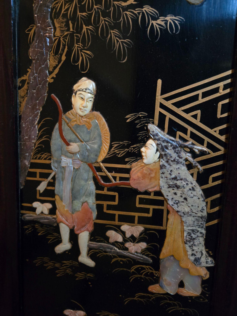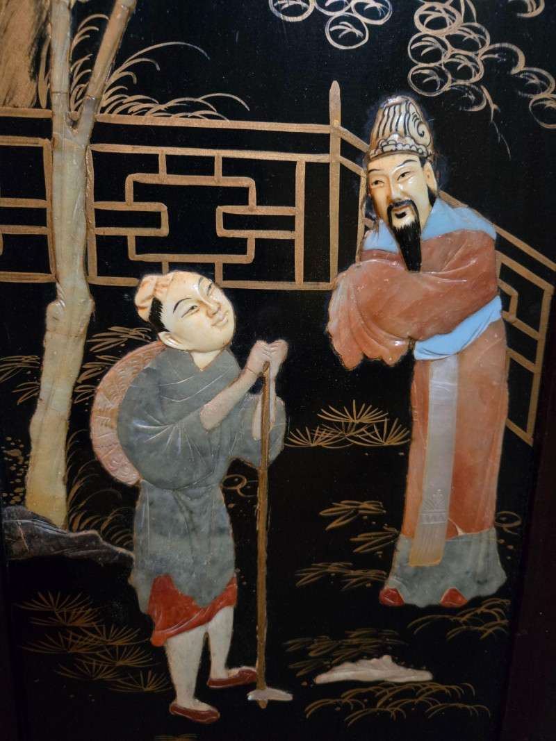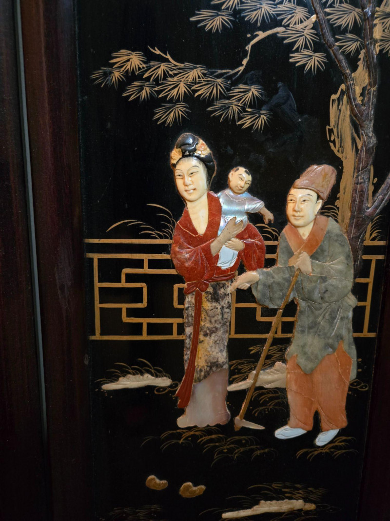 Hand-painted lacquer panels featuring garden scenes with figures, birds, and architectural motifs Description