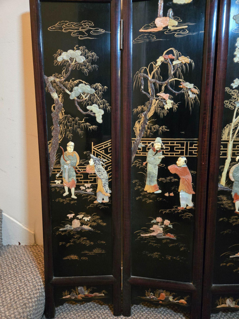 This decorative screen showcases intricate illustrations in the classic Asian style, likely Chinese, rendered in gold, red, and white on a black lacquered surface. Each panel depicts figures in a serene garden setting, surrounded by stylized trees, birds, clouds, and latticework. Medium: Lacquered wood with hand-painted detail Palette: Gold, red, white, and black Imagery: Garden scenes with human figures, birds, and nature elements Function: Freestanding folding screen for room division or decorative accent Condition: Excellent; no visible damage