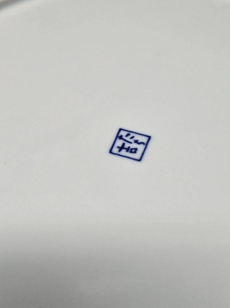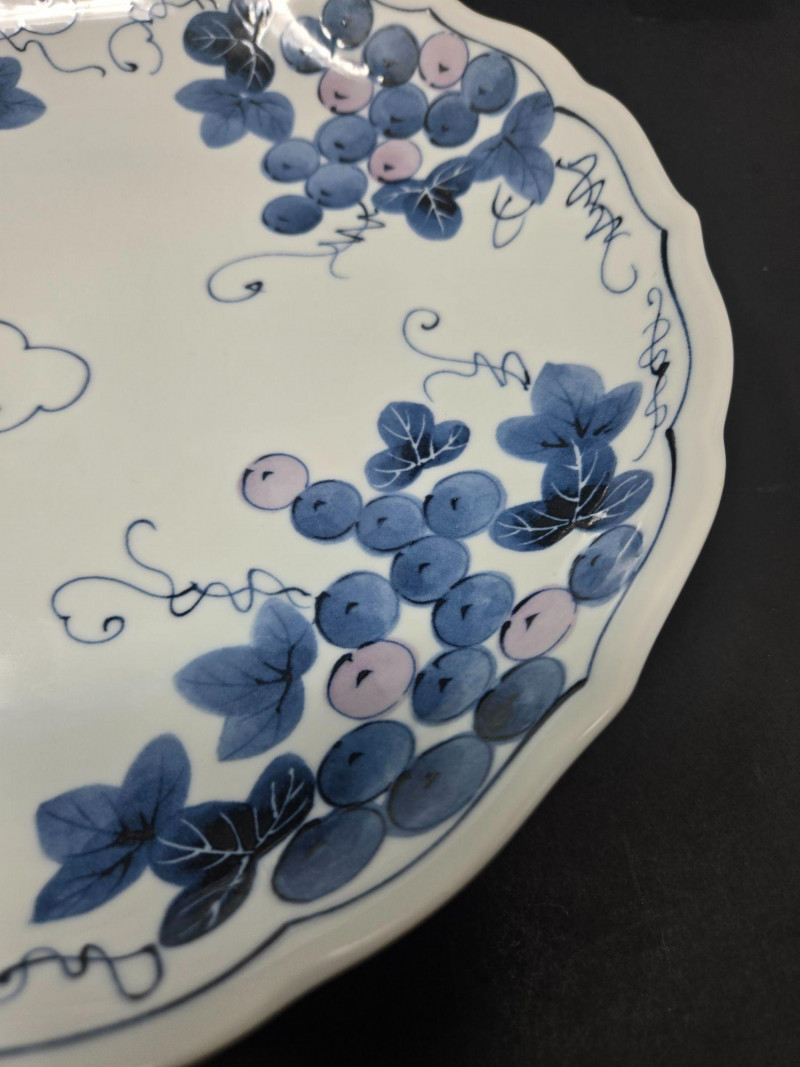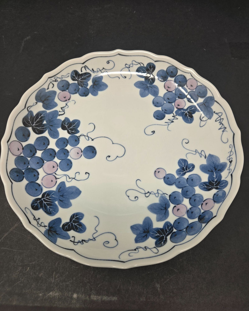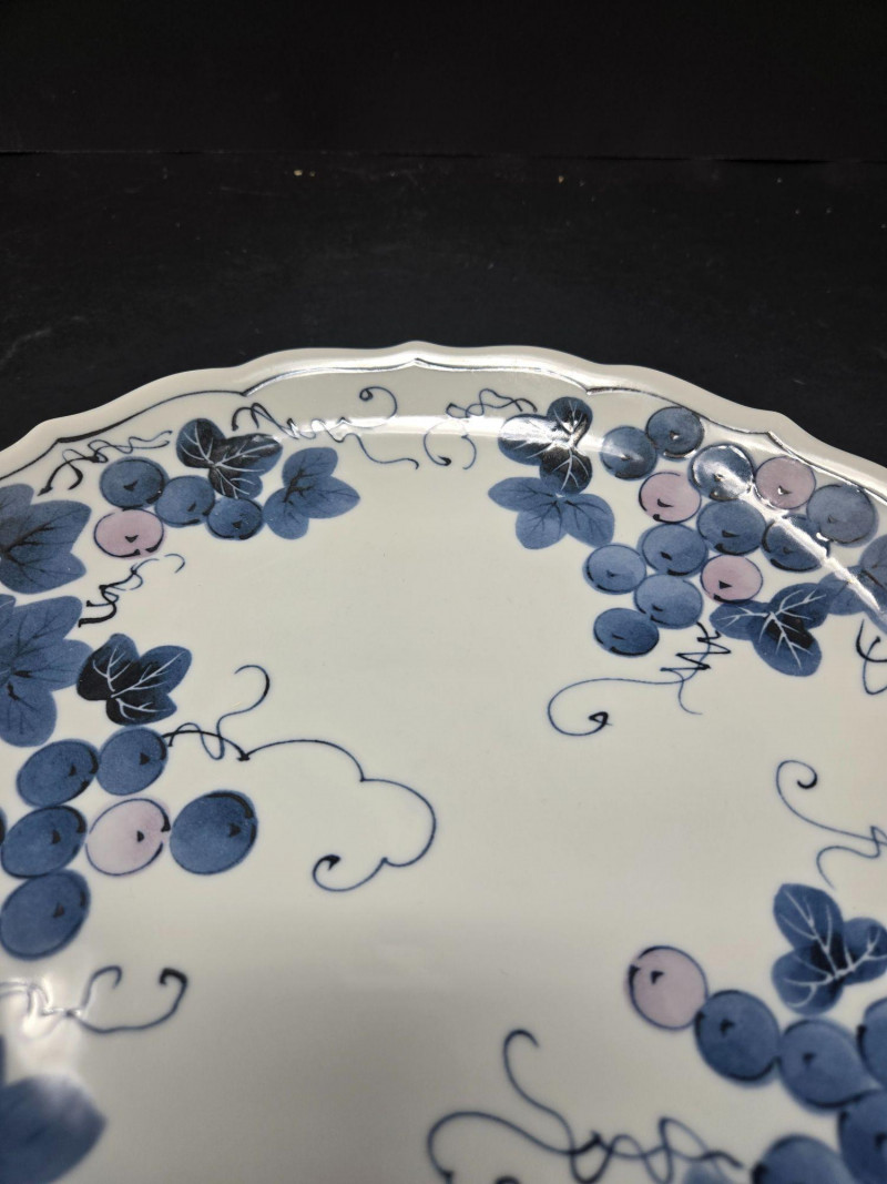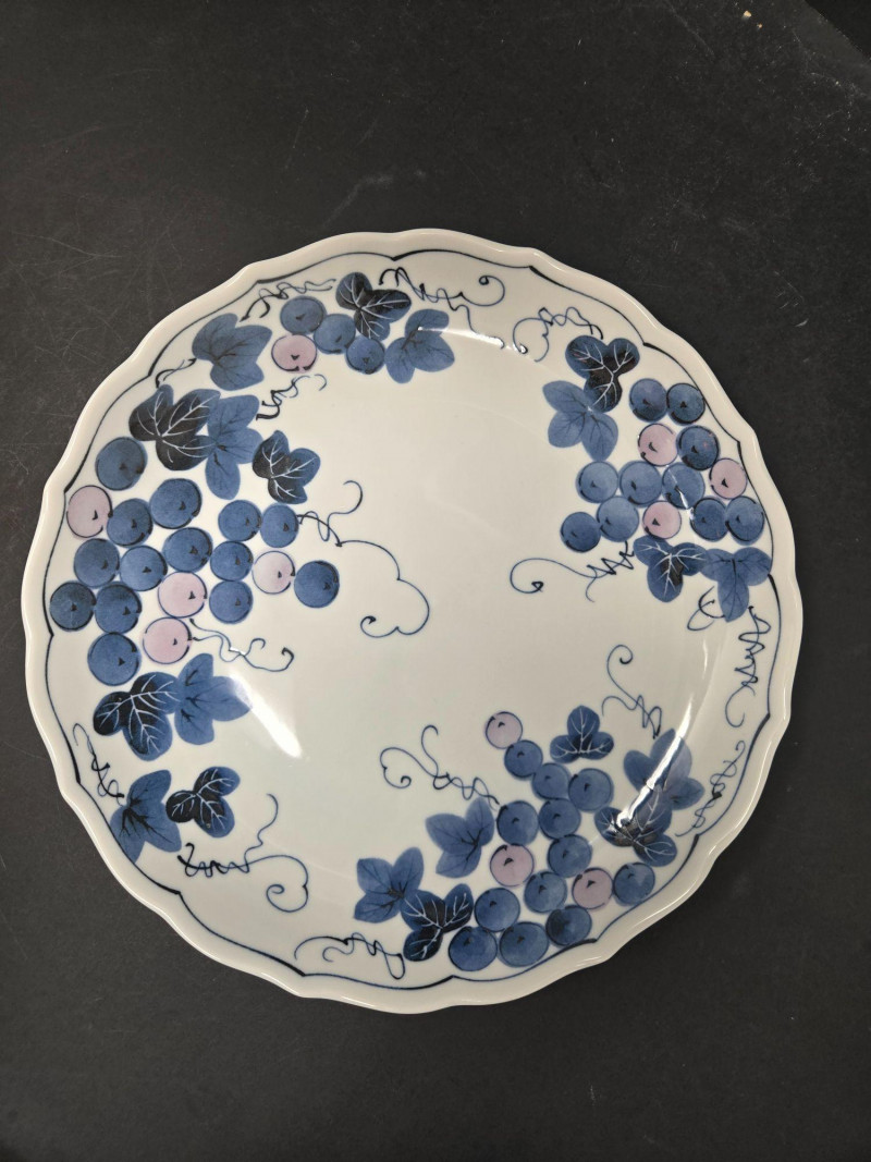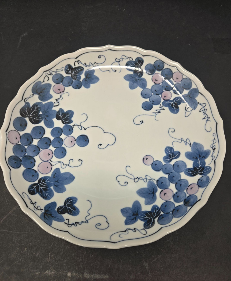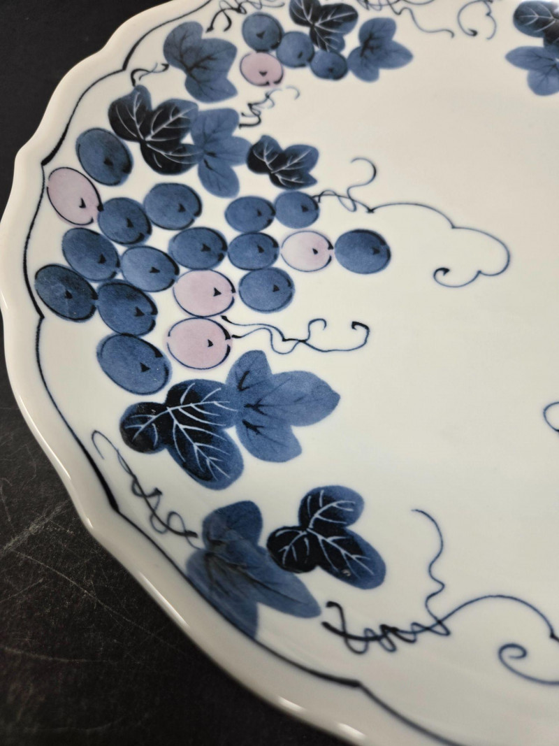This decorative plate features a hand-painted grapevine design rendered in soft shades of blue and light purple. The scalloped edge adds refinement, while the curling tendrils and clustered grapes evoke movement and natural abundance. The artwork is arranged in four balanced clusters around the rim, leaving the center open for visual contrast. Material: Glazed ceramic Design: Grape clusters and leaves with dynamic vinework Palette: Blue, lavender, and soft gray on white ceramic Style: Asian-inspired botanical motif Condition: Excellent; no chips or cracks visible