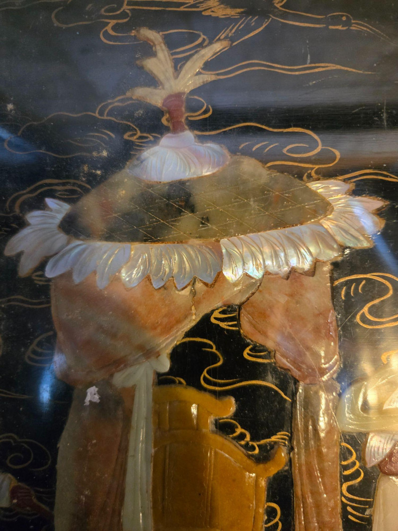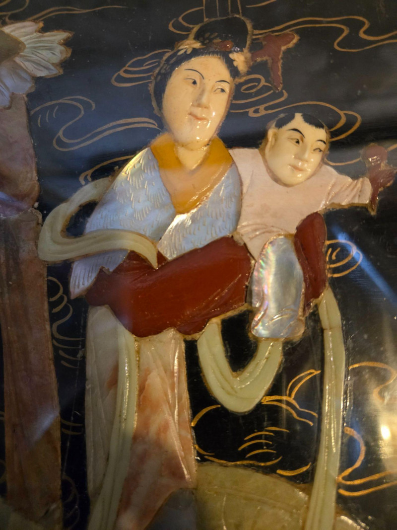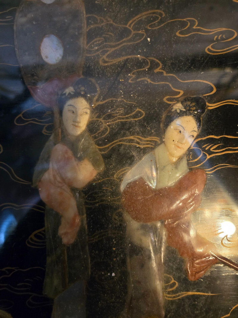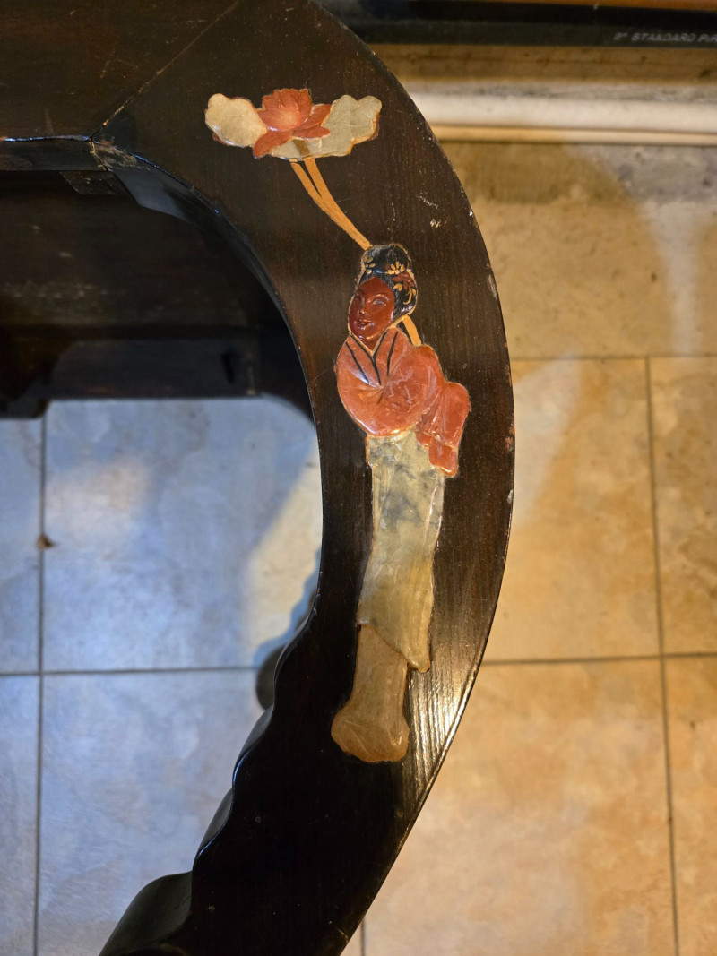 This decorative coffee table features a stunning embossed and inlaid surface depicting a traditional East Asian garden scene. Figures in ceremonial attire are shown walking, conversing, and holding children amid stylized trees, birds, clouds, and a red sun. The background includes a pavilion and lattice fence, adding depth and architectural interest. Material: Wood with inlaid and embossed detailing Palette: Rich tones of gold, red, and white on a dark lacquered base Design: Four-sided table with floral and ornamental inlays along the legs and sides Condition: Excellent; no visible damage to surface or structure