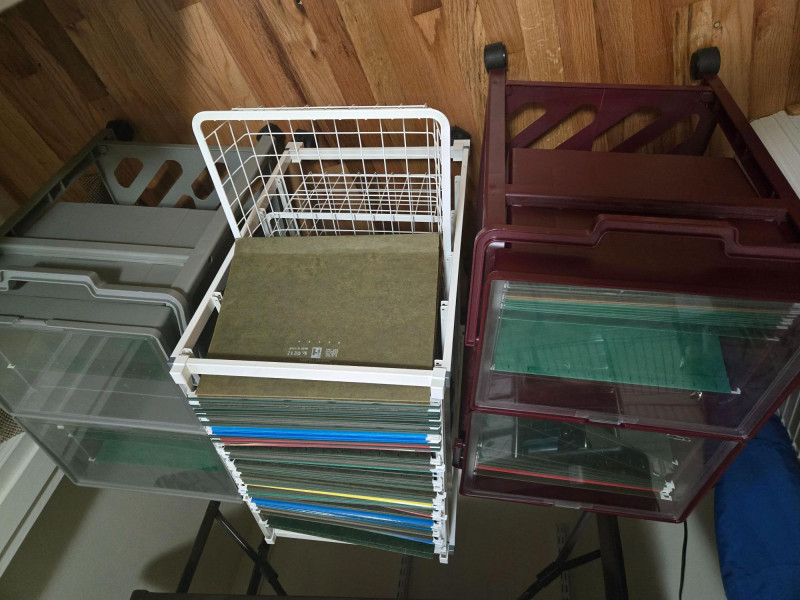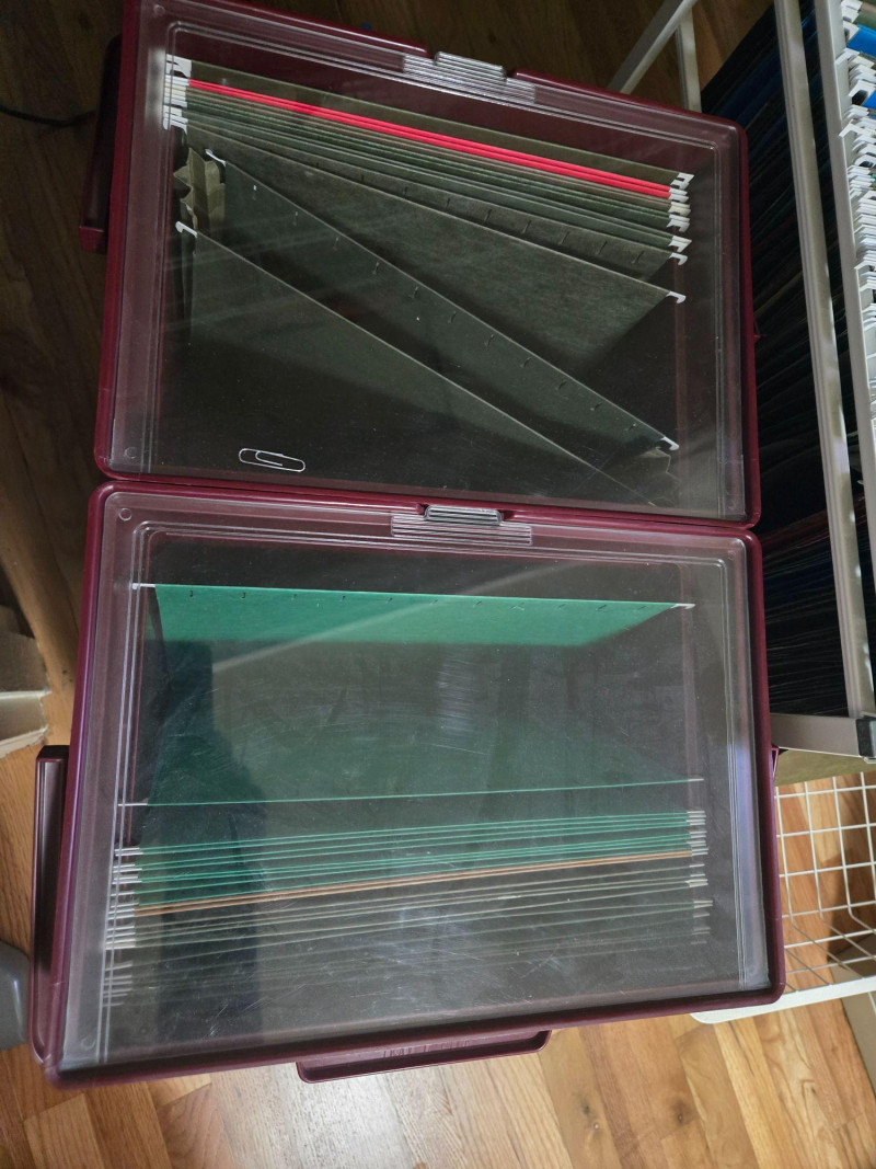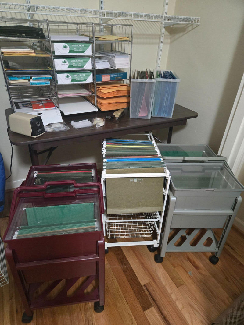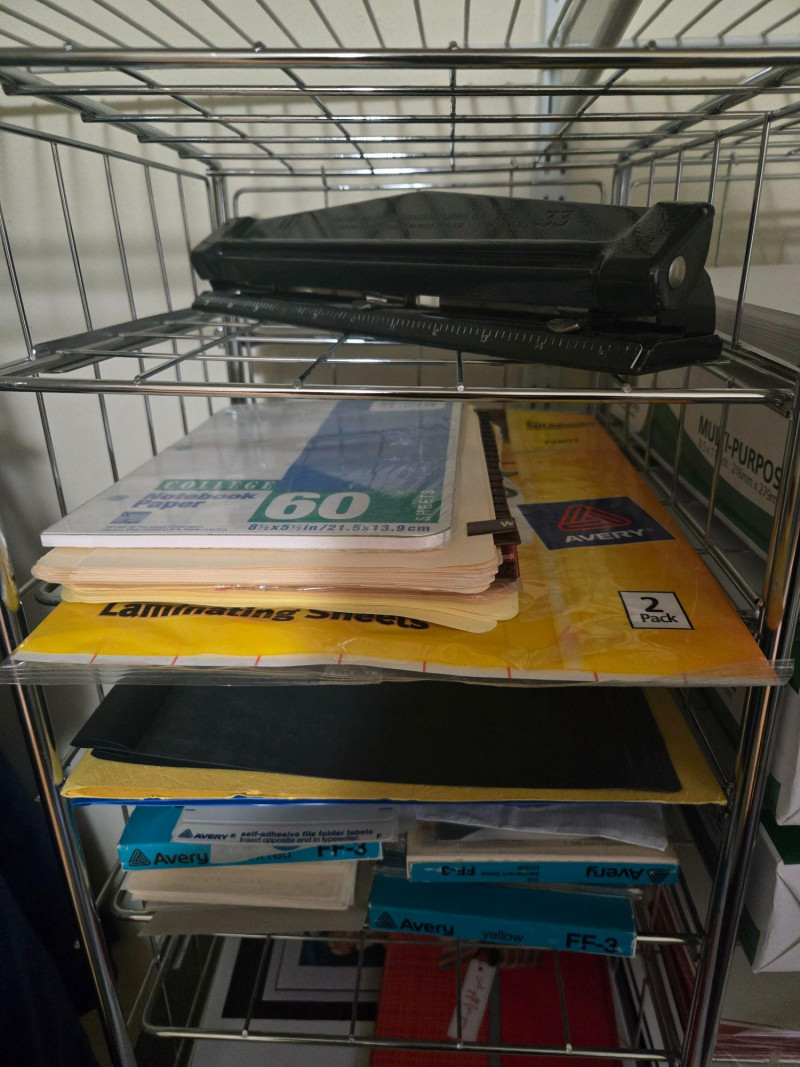This lot includes a variety of practical office tools and storage solutions ideal for home offices, small businesses, or organizational projects. The collection features: Three mobile file carts (maroon, white, and gray) with hanging folders and transparent lids Wire shelving units with labeled boxes, envelopes, and stacked paper Plastic bins filled with colored file folders Additional supplies including a tape dispenser, stapler, and pencil sharpener All items in good working condition