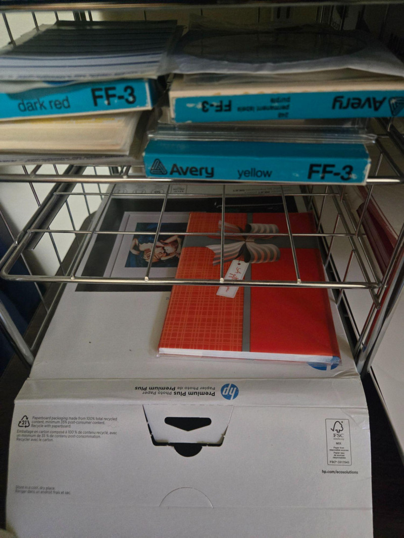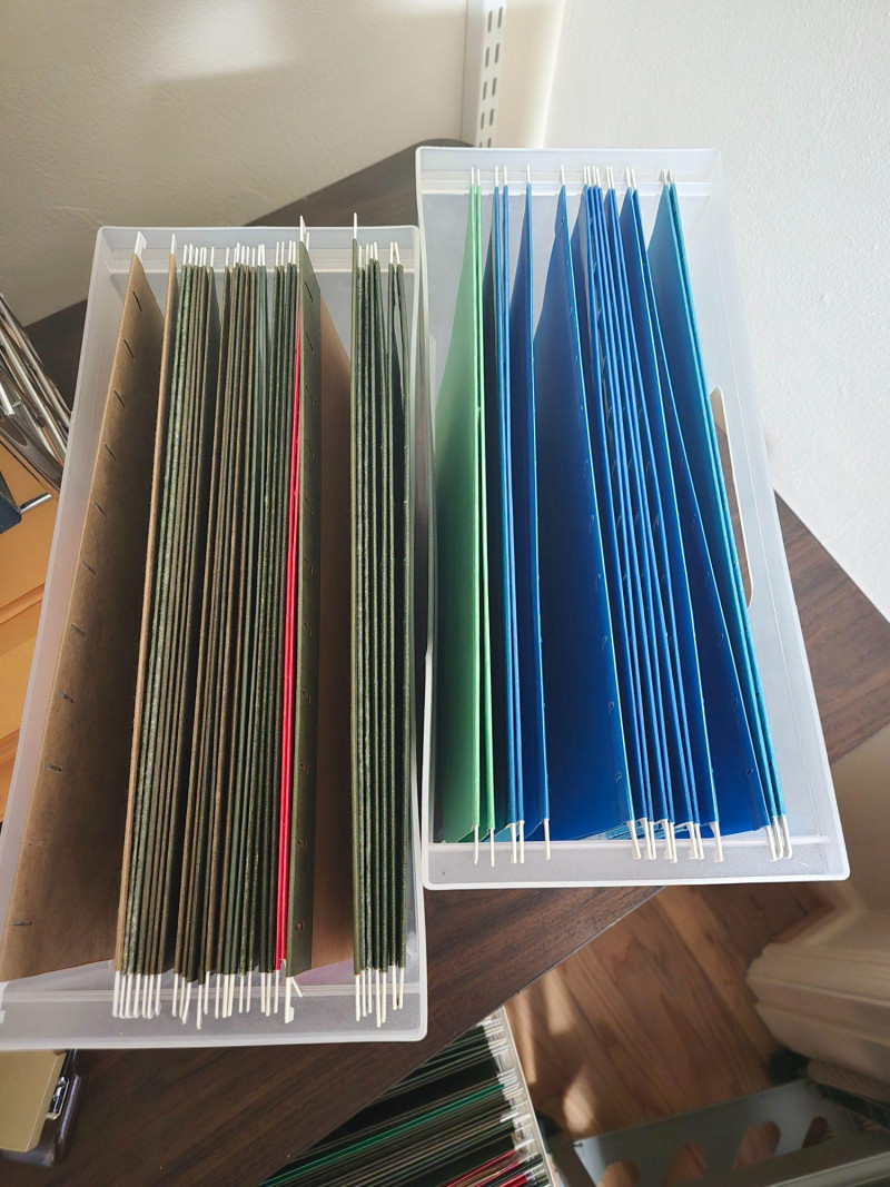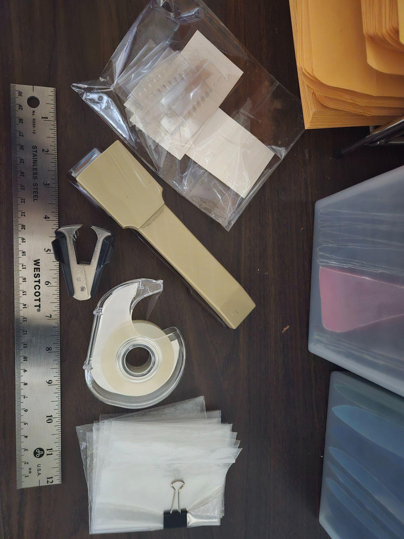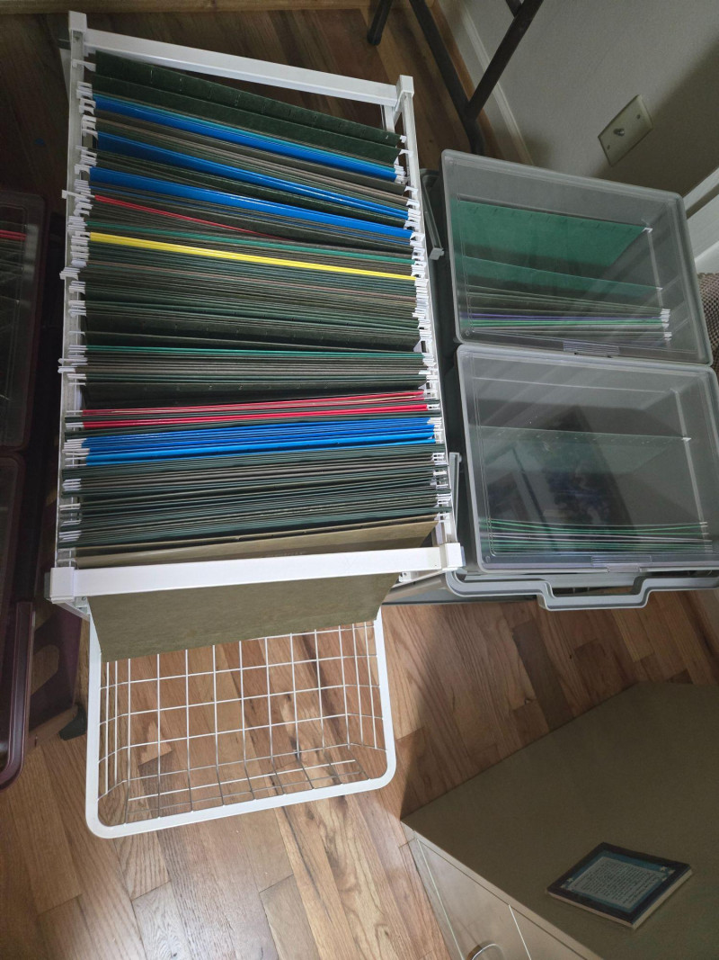 This lot includes a variety of practical office tools and storage solutions ideal for home offices, small businesses, or organizational projects. The collection features: Three mobile file carts (maroon, white, and gray) with hanging folders and transparent lids Wire shelving units with labeled boxes, envelopes, and stacked paper Plastic bins filled with colored file folders Additional supplies including a tape dispenser, stapler, and pencil sharpener All items in good working condition