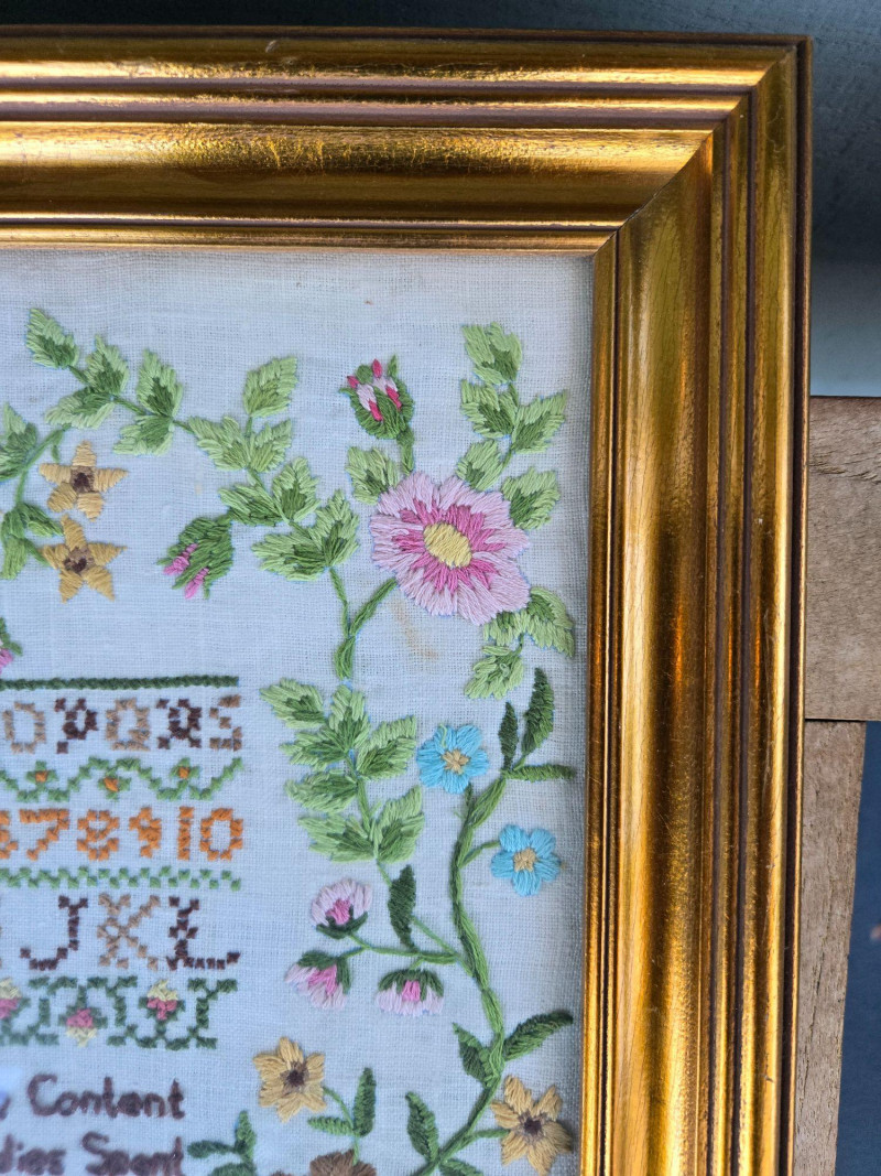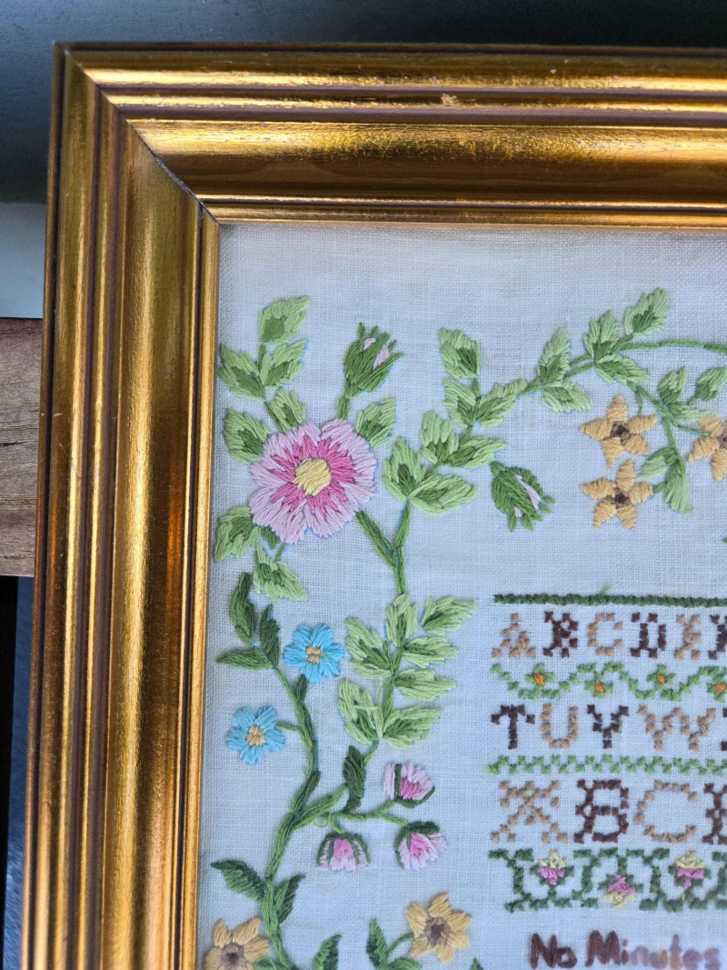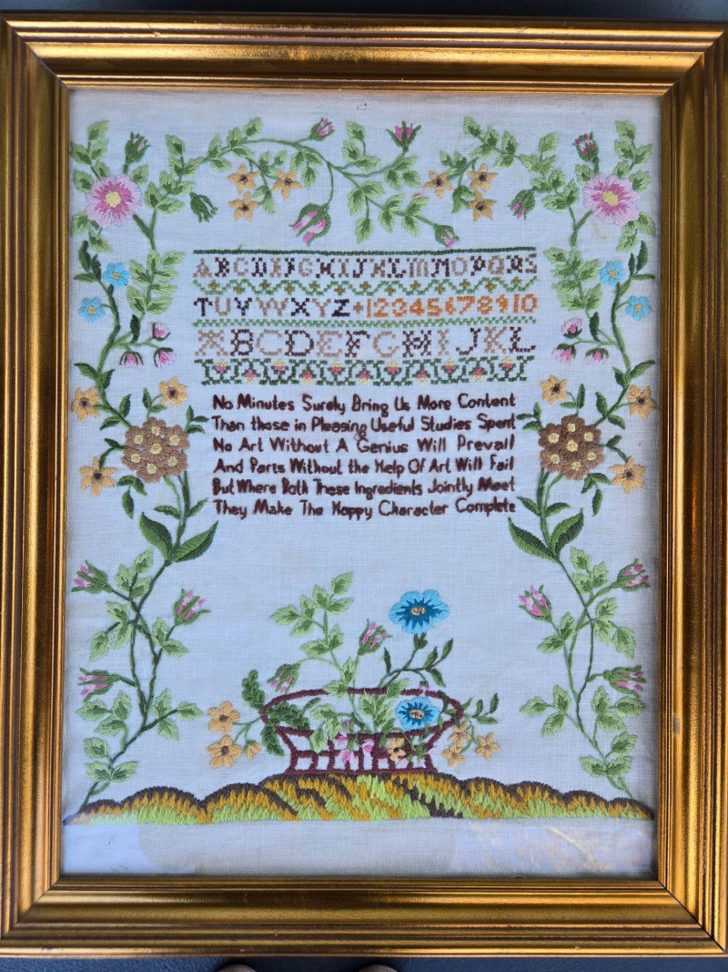 This handstitched sampler includes multiple rows of embroidered alphabets and numbers in varied styles and colors, framed by decorative floral borders. The lower section features a poetic verse stitched in dark thread, surrounded by floral motifs and a central basket design. The entire piece is mounted in a gold-toned frame. Medium: Embroidery on fabric Design: Alphabets, numbers, floral borders, poetic verse Verse excerpt: