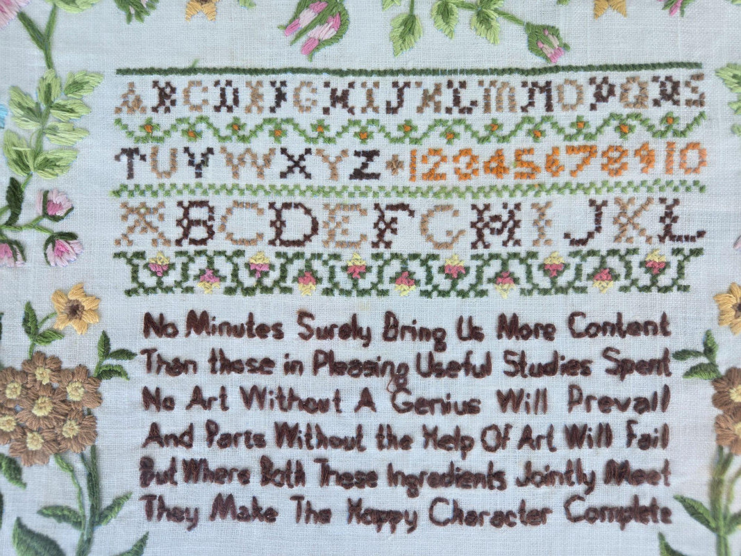 Vintage embroidery featuring alphabets, numbers, floral motifs, and a poetic reflection on learning Description
