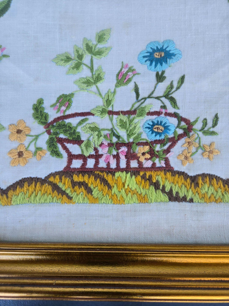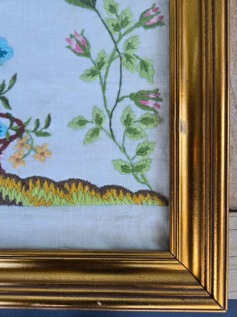 “No Minutes Surely Bring Us More Content / Than those in Pleasing Useful Studies Spent…” Frame: Gold-tone, glass-front Condition: Excellent; clean stitching and well-preserved presentation