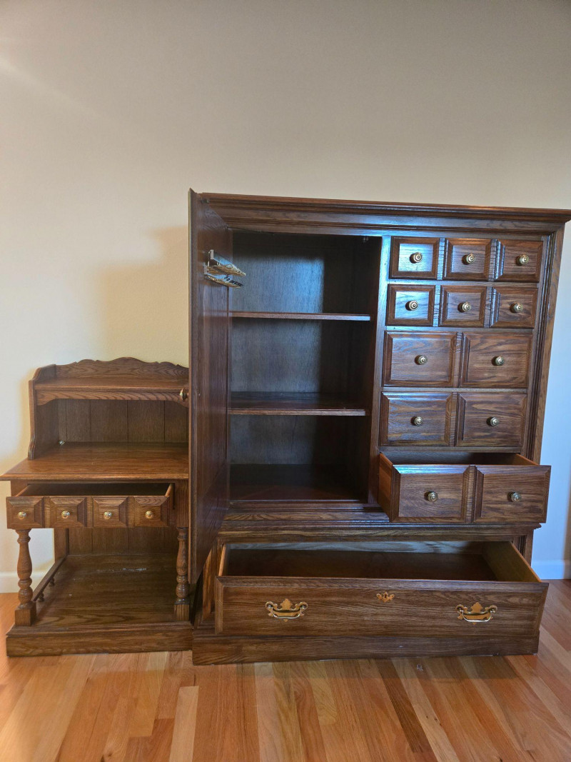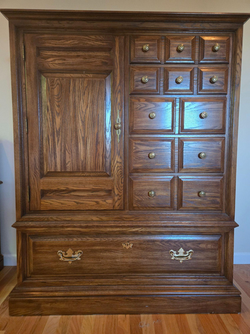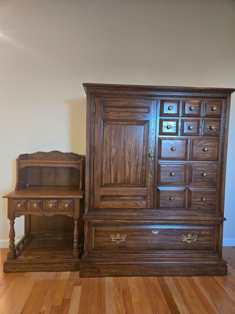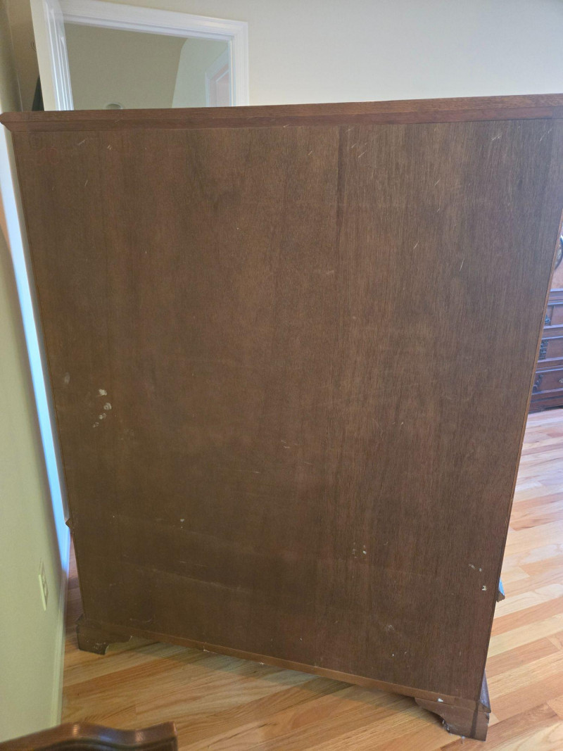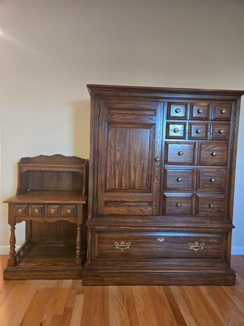 This matched set includes a tall Colonial-style highboy dresser and coordinating nightstand, both featuring a warm, dark wood tone and traditional design elements. The highboy offers multiple drawers and a central cabinet with recessed paneling, while the nightstand includes three small drawers with turned legs and scalloped detailing. Highboy Dresser: Central cabinet door flanked by a grid of drawers, large bottom drawer with ornate brass pulls Nightstand: Three drawers, scalloped backboard, turned legs, brass knobs Style: Colonial revival with vintage craftsmanship and decorative accents Condition: Excellent; structurally sound with no visible damage