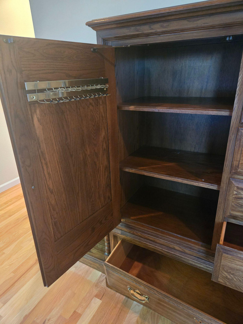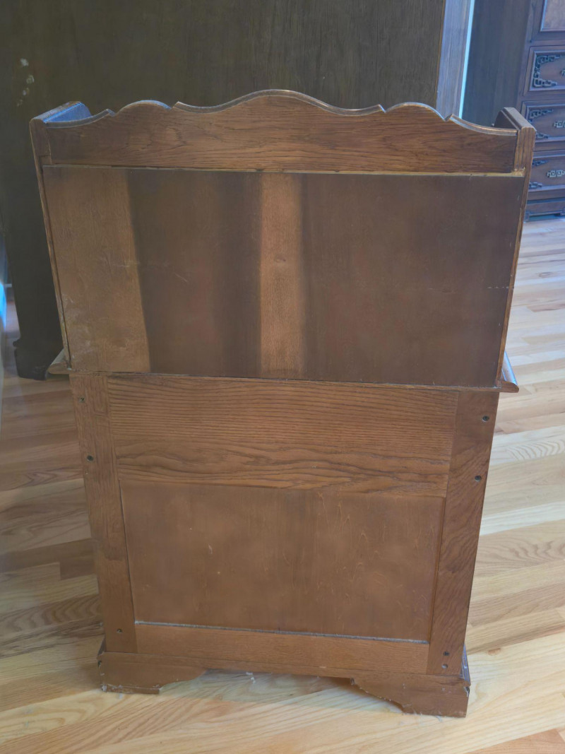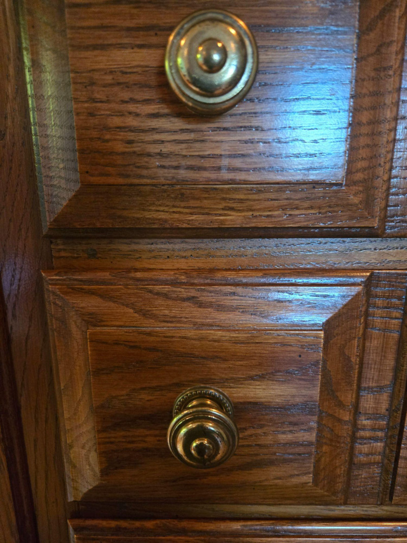 Rich wood finish with classic brass hardware and vintage charm Description