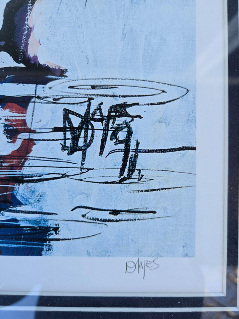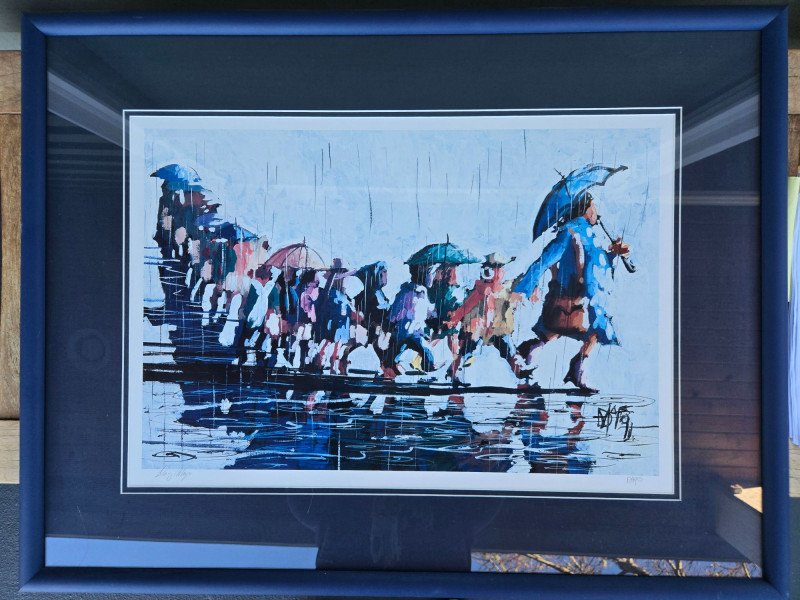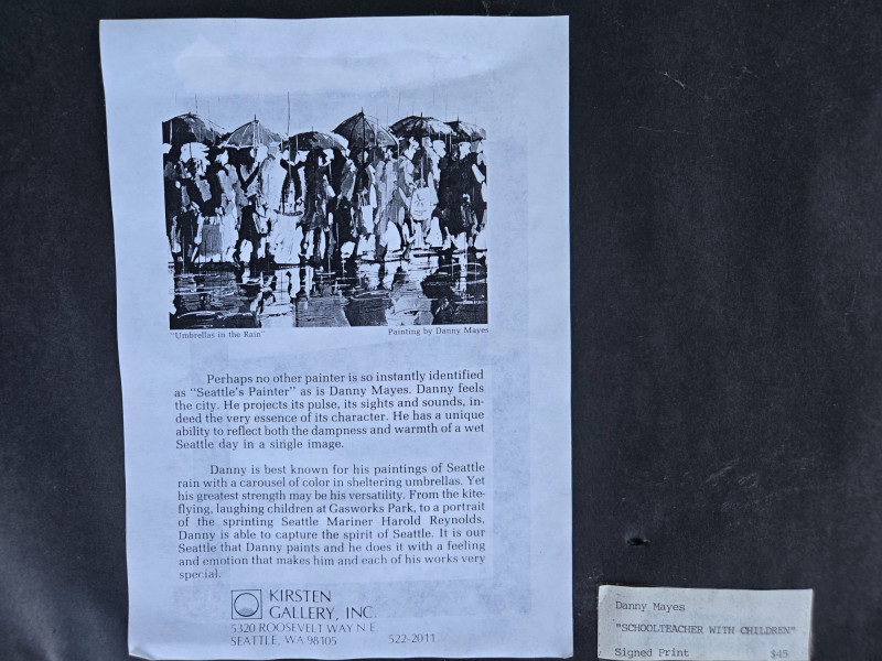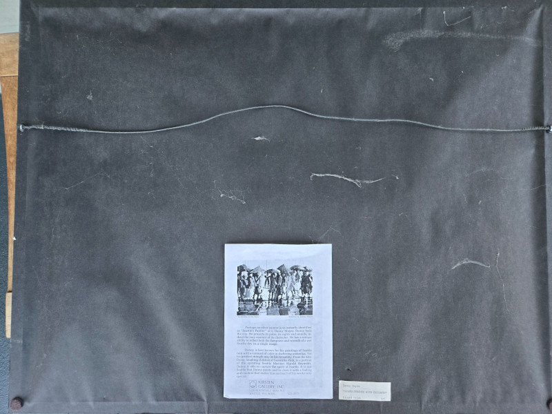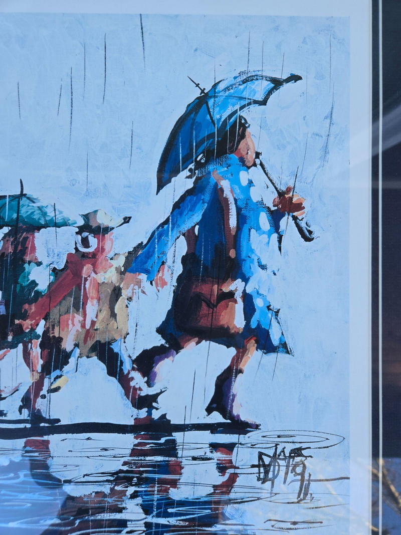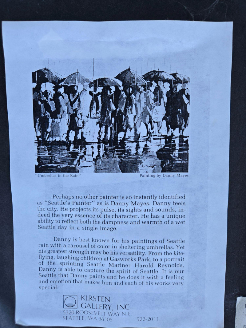This dynamic composition by Danny Mayes—known locally as “Seattle’s Painter”—depicts a group of figures walking through rain-soaked streets, umbrellas raised against vertical streaks of falling rain. Reflections shimmer on the wet ground, and bold brushstrokes convey both motion and mood. The figures are dressed in colorful attire, adding warmth to the otherwise gray setting. Artist: Danny Mayes Title: Umbrellas in the Rain Medium: Acrylic or mixed media on canvas (framed) Style: Urban impressionism with expressive brushwork Signature: Signed lower right Condition: Excellent; professionally framed and ready to hang