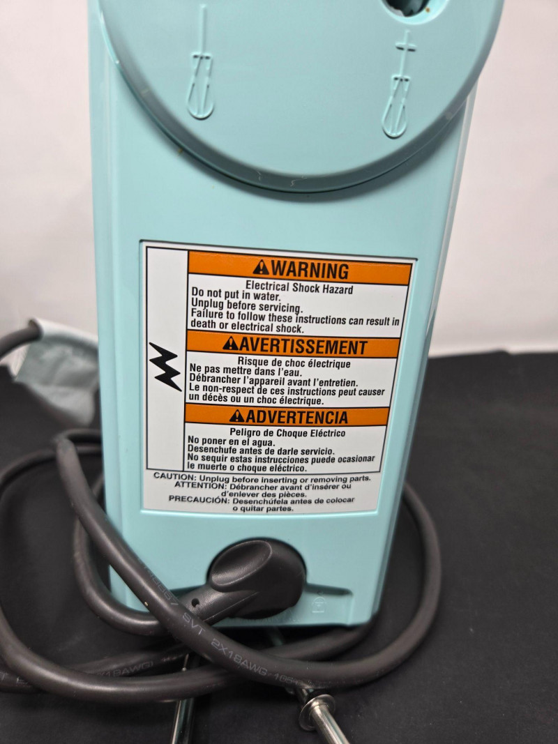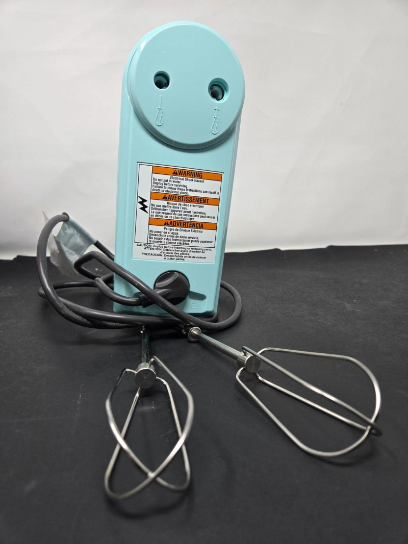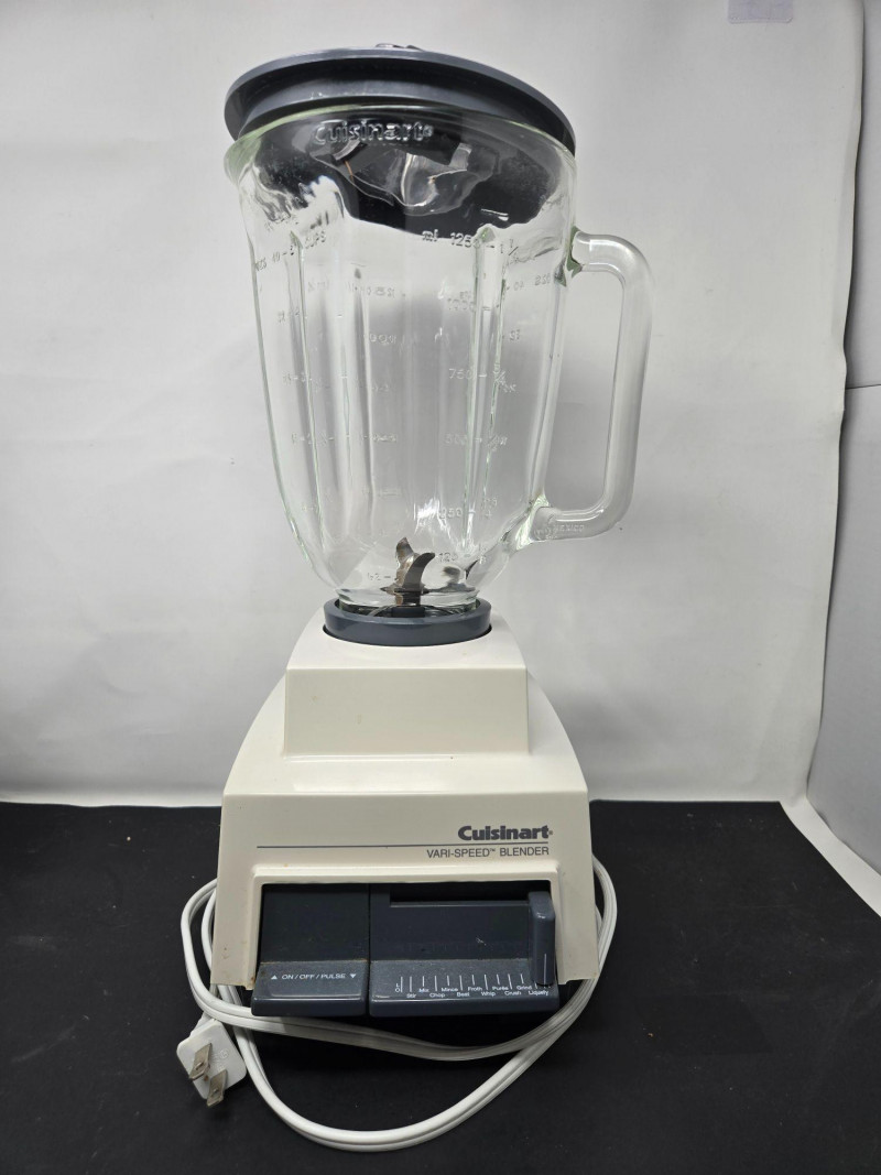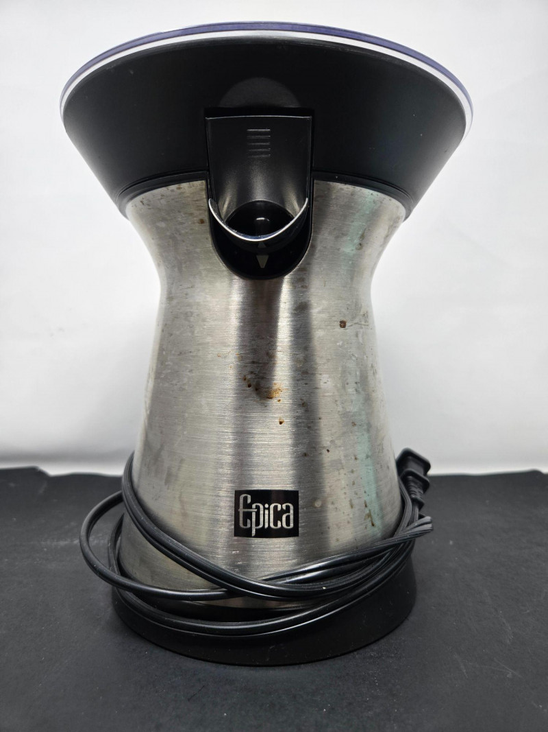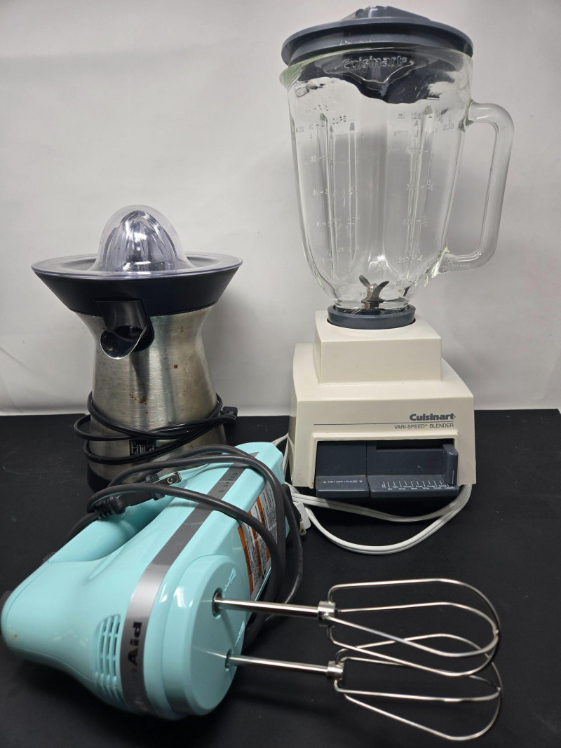 This lot includes three essential kitchen tools: KitchenAid Hand Mixer – Turquoise finish with dual beaters and wraparound cord; compact and powerful for baking tasks Cuisinart Vari-Speed Blender – White base with glass pitcher and sliding speed control; ideal for smoothies, soups, and sauces Epica Citrus Juicer – Stainless steel base with clear top; designed for efficient juice extraction from lemons, limes, and oranges All items are in excellent condition and appear gently used.