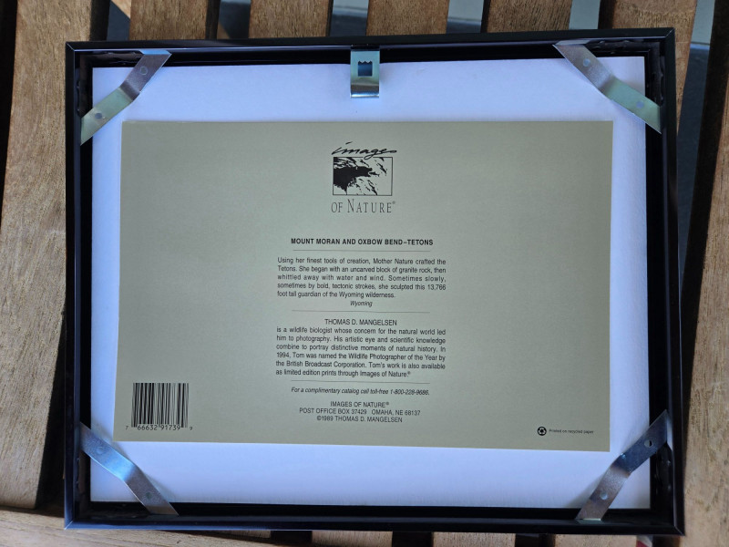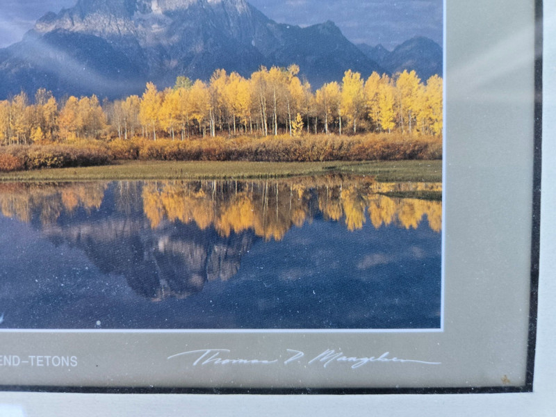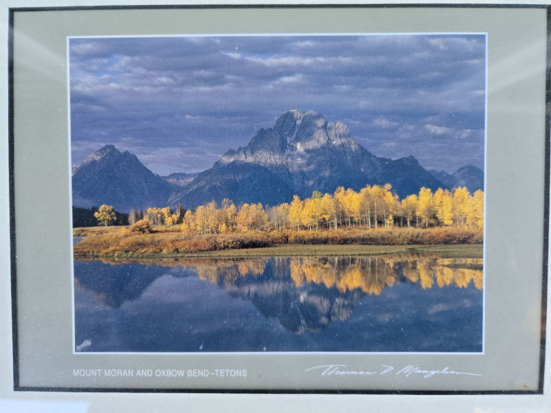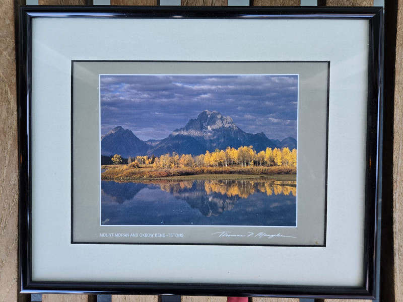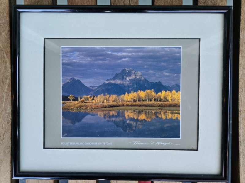 This professionally framed photograph showcases Mount Moran rising above Oxbow Bend in Grand Teton National Park. The composition features a dramatic sky, golden foliage, and a glassy water reflection, all rendered in vivid detail and rich color. The print is signed by renowned nature photographer Thomas D. Mangelsen and titled at the bottom of the image. Title: Mount Moran & Oxbow Bend – Tetons Artist: Thomas D. Mangelsen Medium: Photographic print Frame: Black with light gray mat Condition: Excellent; ready to hang