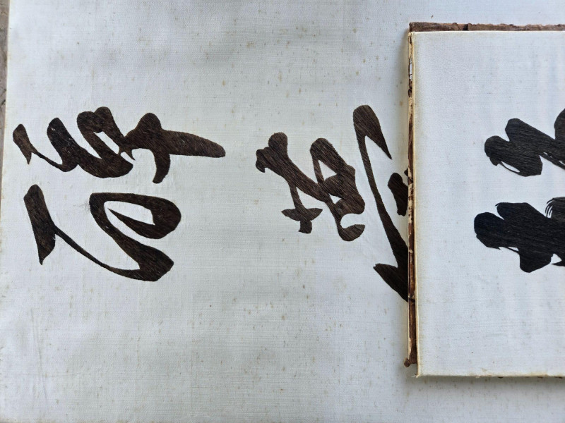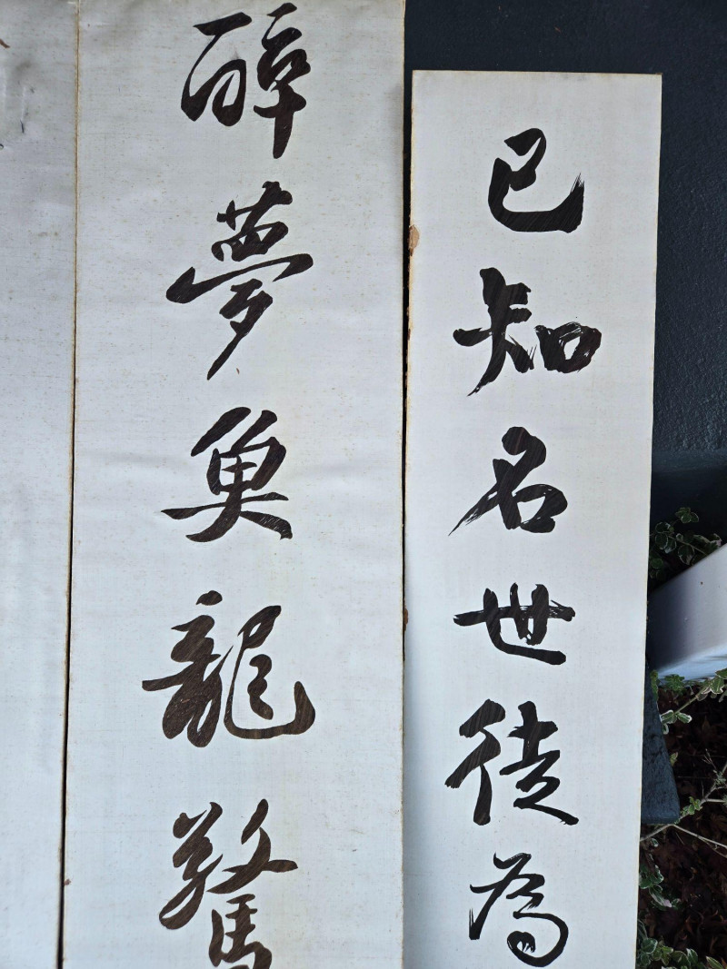 Vertical ink-on-paper compositions showcasing poetic and philosophical phrases in traditional script Description