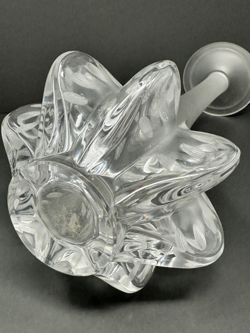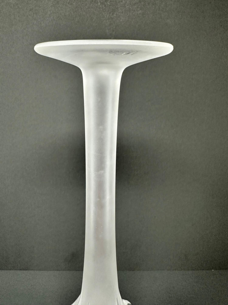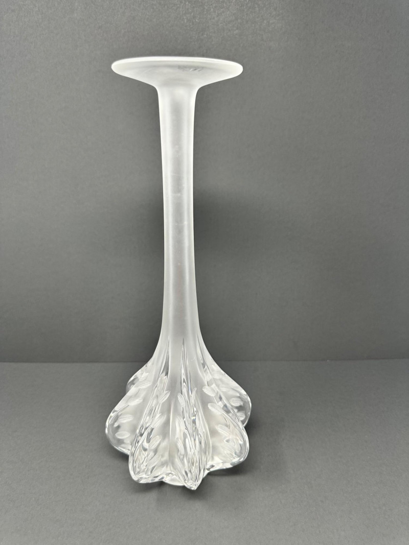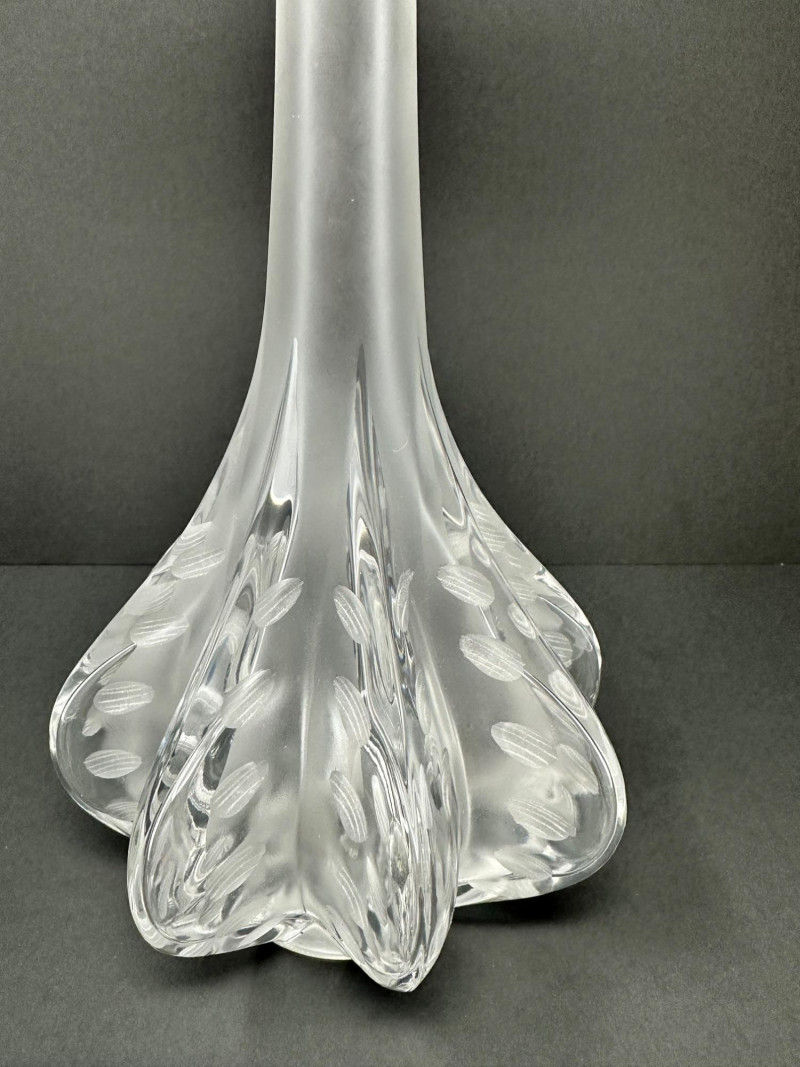 The Lalique “Claude” vase is a striking example of French Art Deco revival, crafted in clear and frosted crystal with elegant vertical fluting and a gently flared rim. Designed with understated sophistication, its clean lines and subtle texture evoke classic Lalique styling—balancing modern minimalism with timeless refinement. Signed by Lalique France, 13.5 T x 5.5 W