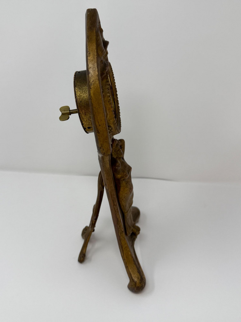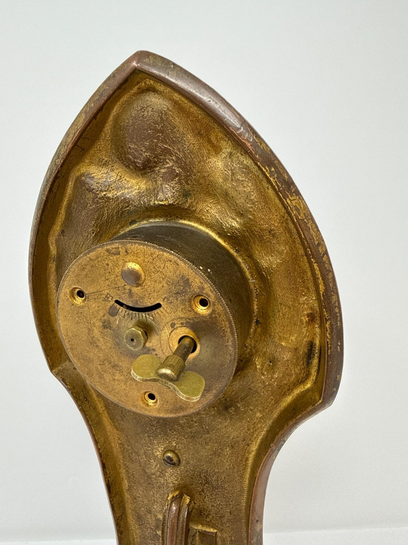 An ornate antique Ansonia mantle clock crafted in cast metal with a rich bronze-toned finish, showcasing the brand’s signature blend of elegance and craftsmanship. The clock features a pointed arch silhouette adorned with intricate floral and foliate reliefs, framing a circular dial with Roman numerals and an inner ring of Arabic numerals for 24-hour timekeeping. Below the dial, a sculptural figure of a woman in flowing robes stands in graceful repose, embodying the Art Nouveau aesthetic. Dating to the late 19th or early 20th century. 10.5 T x 4.25 W