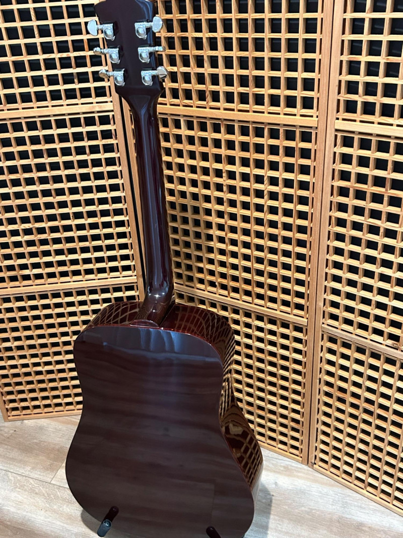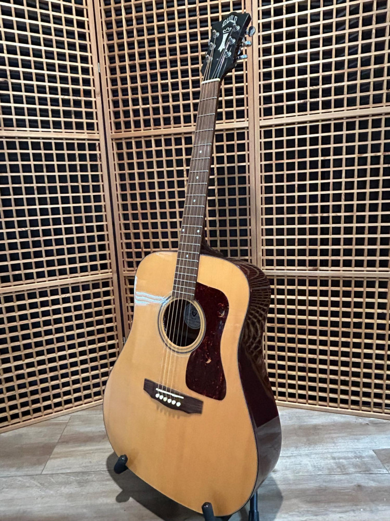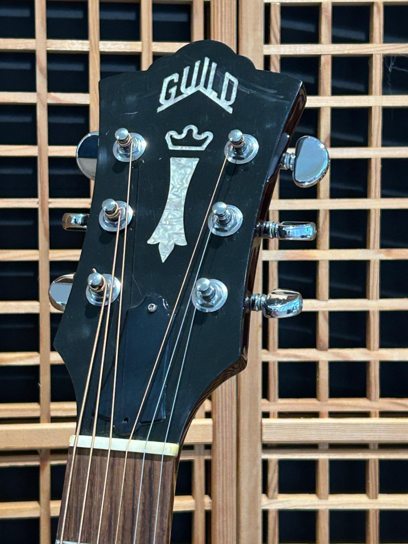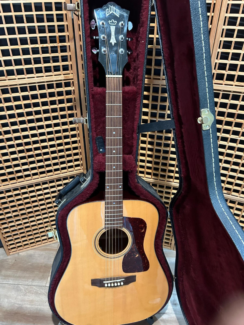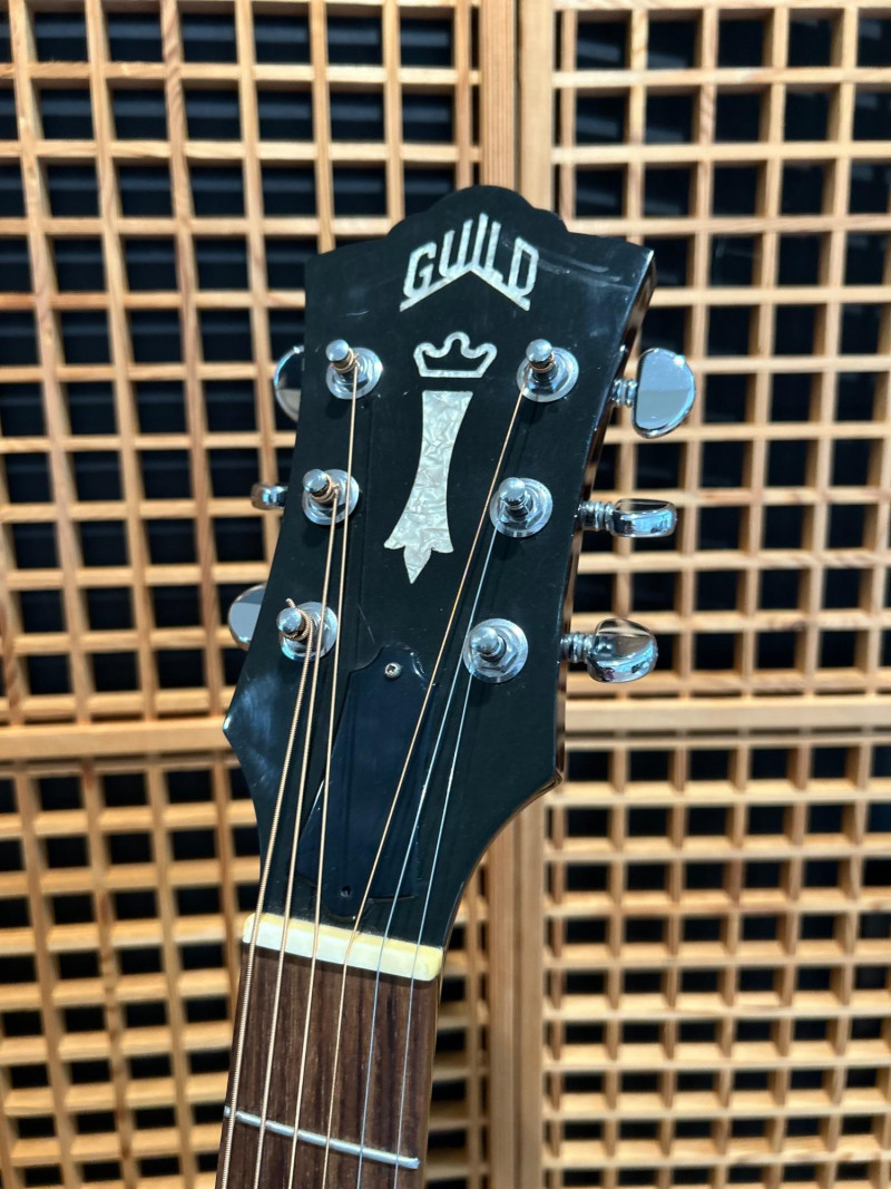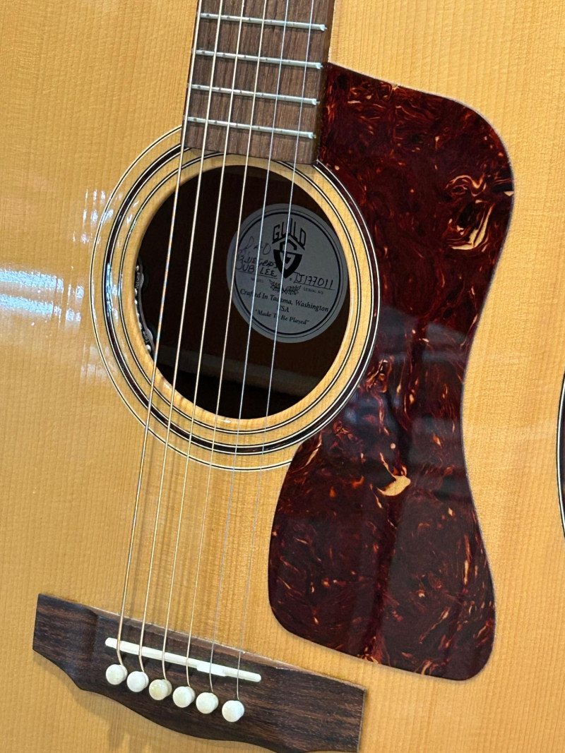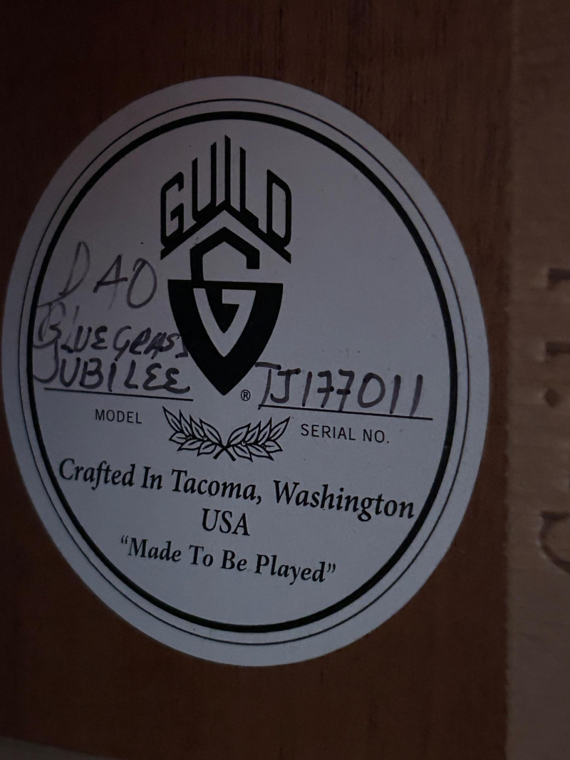 This auction features a 2006 Guild D-40 “Bluegrass Jubilee” acoustic guitar, a classic American-made dreadnought celebrated for its strong projection, balanced tone, and unmistakable Guild character. Designed with bluegrass and flat-picking players in mind, the D-40 delivers a powerful low end with clear, ringing highs—ideal for both ensemble and solo playing. An aftermarket electric pickup has been installed tastefully, hidden from view (with no harm to the body), with volume and tone controls located inside of the sound hole on the left hand side. Crafted in Tacoma, Washington, USA, this guitar retains its original interior label marked “Made To Be Played,” a fitting motto for one of Guild’s most respected models. The guitar features a natural spruce top paired with richly stained back and sides, a rosewood fingerboard with dot inlays, and a distinctive Guild headstock with decorative inlay. Chrome Grover tuners are fitted, and the guitar is accompanied by its original fitted hard shell case, complete with plush interior and Guild badge. Brand: Guild Guitars Model: D-40 “Bluegrass Jubilee” Type: Acoustic Dreadnought Guitar Made In: Tacoma, Washington, USA Serial Number: TJ177011 (as shown on interior label) Top: Natural finished spruce Back & Sides: Dark stained wood Neck: Mahogany Fingerboard: Rosewood with dot inlays Tuners: Grover chrome machine heads Pickguard: Tortoise-style Case: Original Guild hard shell case includedDetails: