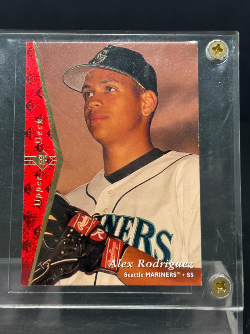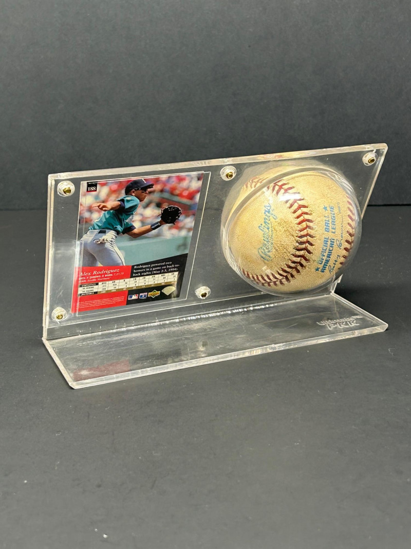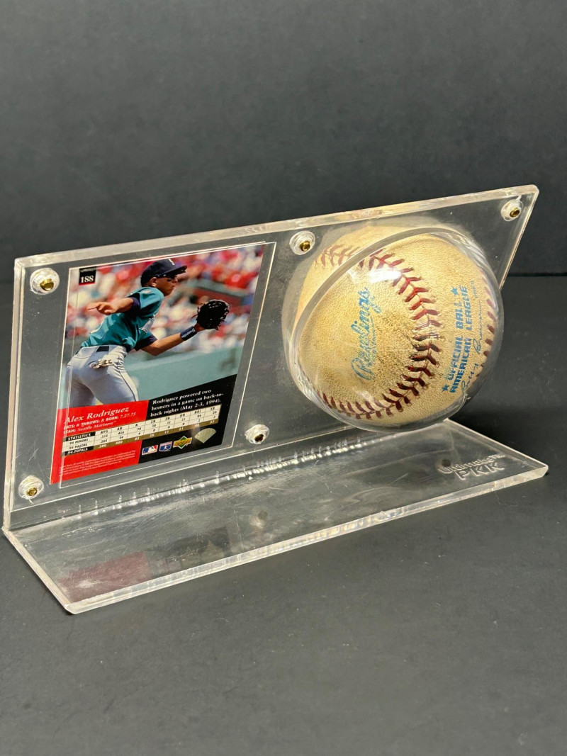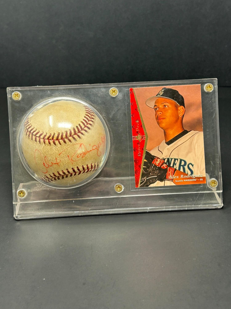 A striking early-career collectible featuring Alex Rodriguez during his Seattle Mariners era. This display pairs a hand-signed official American League baseball with an Upper Deck SP Alex Rodriguez card, professionally housed together in a clear acrylic presentation case. The baseball shows strong surface wear and natural aging consistent with game or handling use, adding character and authenticity to the piece. The red-ink signature remains clearly visible through the protective dome. An excellent display item for Mariners fans, A-Rod collectors, or anyone seeking a bold piece of 1990s MLB memorabilia. Athlete: Alex Rodriguez Team Era: Seattle Mariners Autograph: Hand-signed baseball (red ink) Baseball Type: Official American League baseball (league stamp visible) Card: Upper Deck SP Alex Rodriguez card (included in display) Display Case: Clear acrylic case with domed baseball compartment and card mount Presentation: Ready for shelf or case displayItem Details: