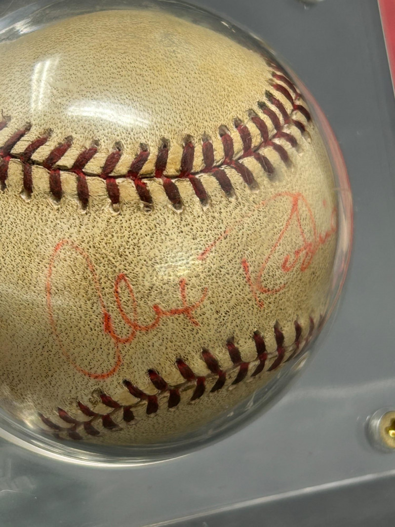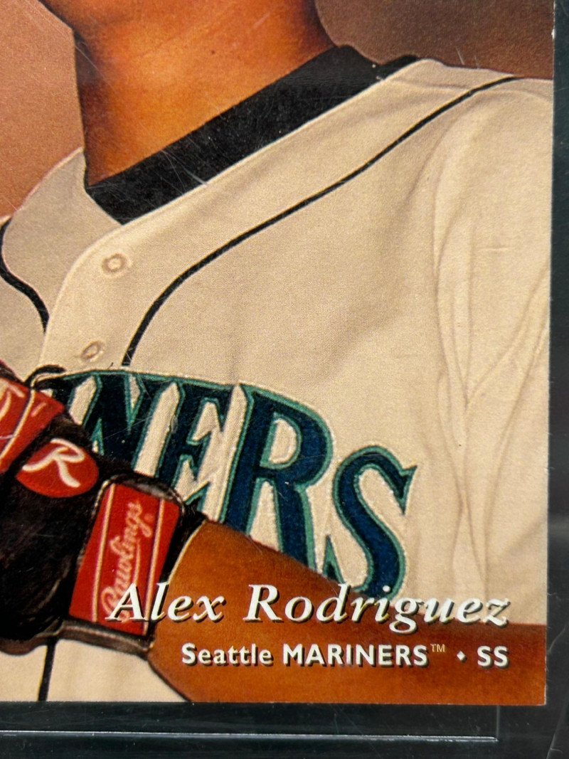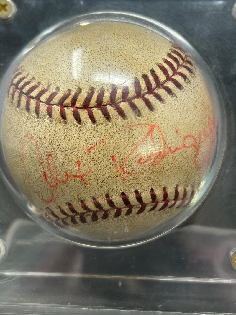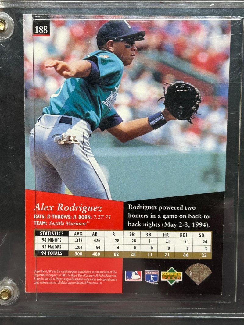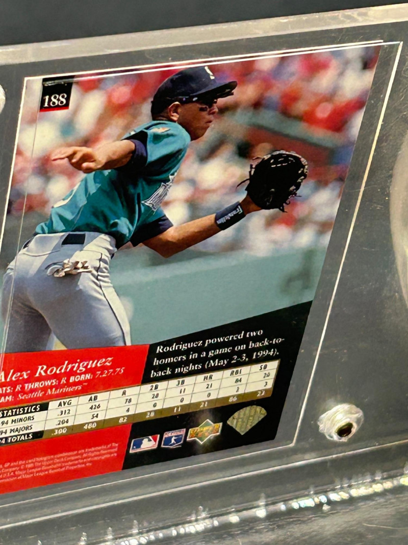 A striking early-career collectible featuring Alex Rodriguez during his Seattle Mariners era. This display pairs a hand-signed official American League baseball with an Upper Deck SP Alex Rodriguez card, professionally housed together in a clear acrylic presentation case. The baseball shows strong surface wear and natural aging consistent with game or handling use, adding character and authenticity to the piece. The red-ink signature remains clearly visible through the protective dome. An excellent display item for Mariners fans, A-Rod collectors, or anyone seeking a bold piece of 1990s MLB memorabilia. Athlete: Alex Rodriguez Team Era: Seattle Mariners Autograph: Hand-signed baseball (red ink) Baseball Type: Official American League baseball (league stamp visible) Card: Upper Deck SP Alex Rodriguez card (included in display) Display Case: Clear acrylic case with domed baseball compartment and card mount Presentation: Ready for shelf or case displayItem Details: