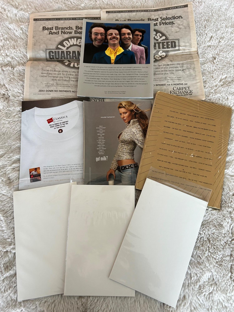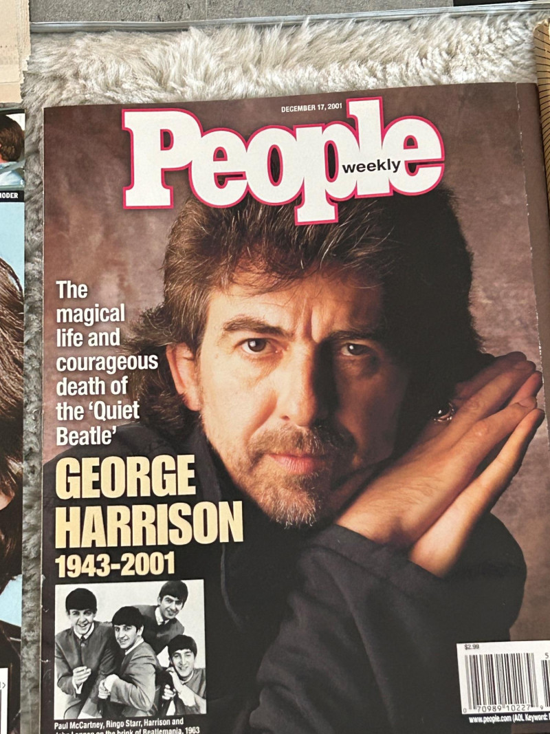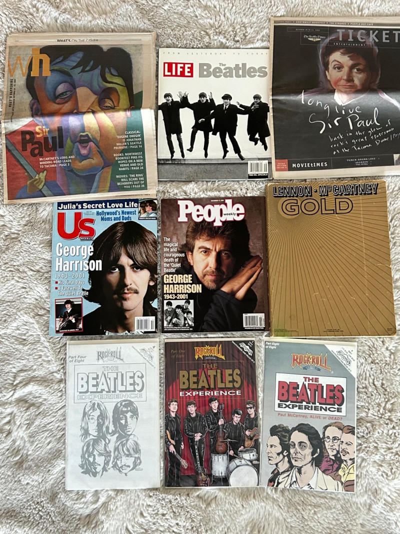 A curated lot of Beatles-related magazines and print memorabilia, featuring coverage of The Beatles with strong focus on Paul McCartney and George Harrison. This collection includes memorial issues, feature magazines, comic-style publications, and music publishing ephemera from the late 20th century to early 2000s. A great grouping for collectors of Beatles history, rock journalism, and pop-culture print media. Category: Beatles magazines & print memorabilia Included (as shown): LIFE magazine – The Beatles special issue People Weekly – George Harrison memorial issue (1943–2001) US Weekly – George Harrison memorial issue (1943–2001) Rock ’n’ Roll Comics: The Beatles Experience (multiple issues, parts of an 8-issue series) Lennon–McCartney Gold songbook Newspaper / entertainment inserts featuring Paul McCartney Format: Magazines, comic-style publications, songbook, newspaper inserts Condition: Mixed vintage condition; light edge wear and creasing consistent with age (see photos) Era: Late 20th century–early 2000sItem Details:
