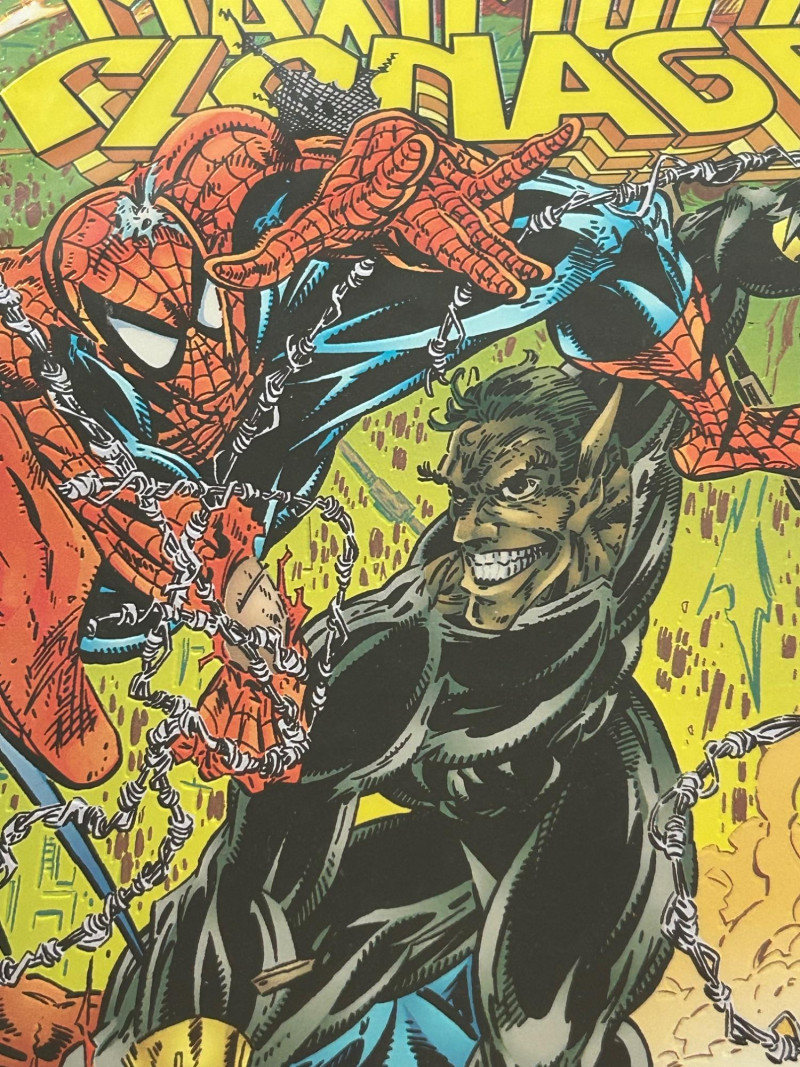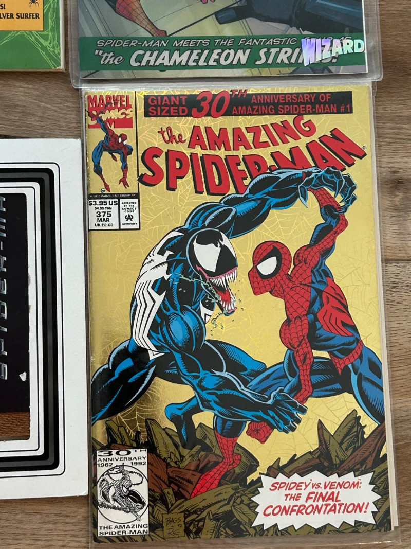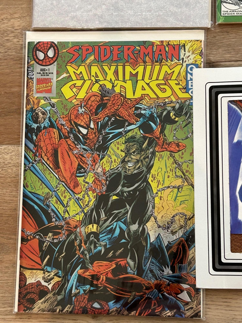 Offered is a multi-piece Spider-Man collectible lot anchored by Marvel’s iconic 30th Anniversary (1962–1992) hologram comics—a hallmark of early-1990s comic collecting. The set features giant-sized hologram issues from The Amazing Spider-Man, The Spectacular Spider-Man, and Web of Spider-Man, plus a Spider-Man: Maximum Clonage issue and a bonus Spider-Man “Leaping” art print by Funko Enterprises. These issues showcase fan-favorite characters including Venom, Carnage, and classic villains, with bold hologram windows and anniversary branding. Several items remain in protective sleeves. A strong nostalgic group for collectors or display. The Amazing Spider-Man #365 – Super-Sized 30th Anniversary Hologram Issue #375 – Spider-Man vs. Venom: The Final Confrontation! (30th Anniversary) The Spectacular Spider-Man #189 – 30th Anniversary Hologram Issue Web of Spider-Man #90 – 30th Anniversary Hologram Issue Spider-Man: Maximum Clonage #1 Wizard Ace Edition – The Amazing Spider-Man Spider-Man Meets the Fantastic Four: “The Chameleon Strikes” Bonus Item Spider-Man “Leaping” art print by Funko Enterprises (marked #2526) Publisher: Marvel Comics Era: Early 1990s (30th Anniversary of Spider-Man) Formats: Giant-Sized anniversary issues; standard comic format; bonus art print Features: Hologram covers, anniversary logos, Venom/Carnage appearances, crossover contentSet Includes: