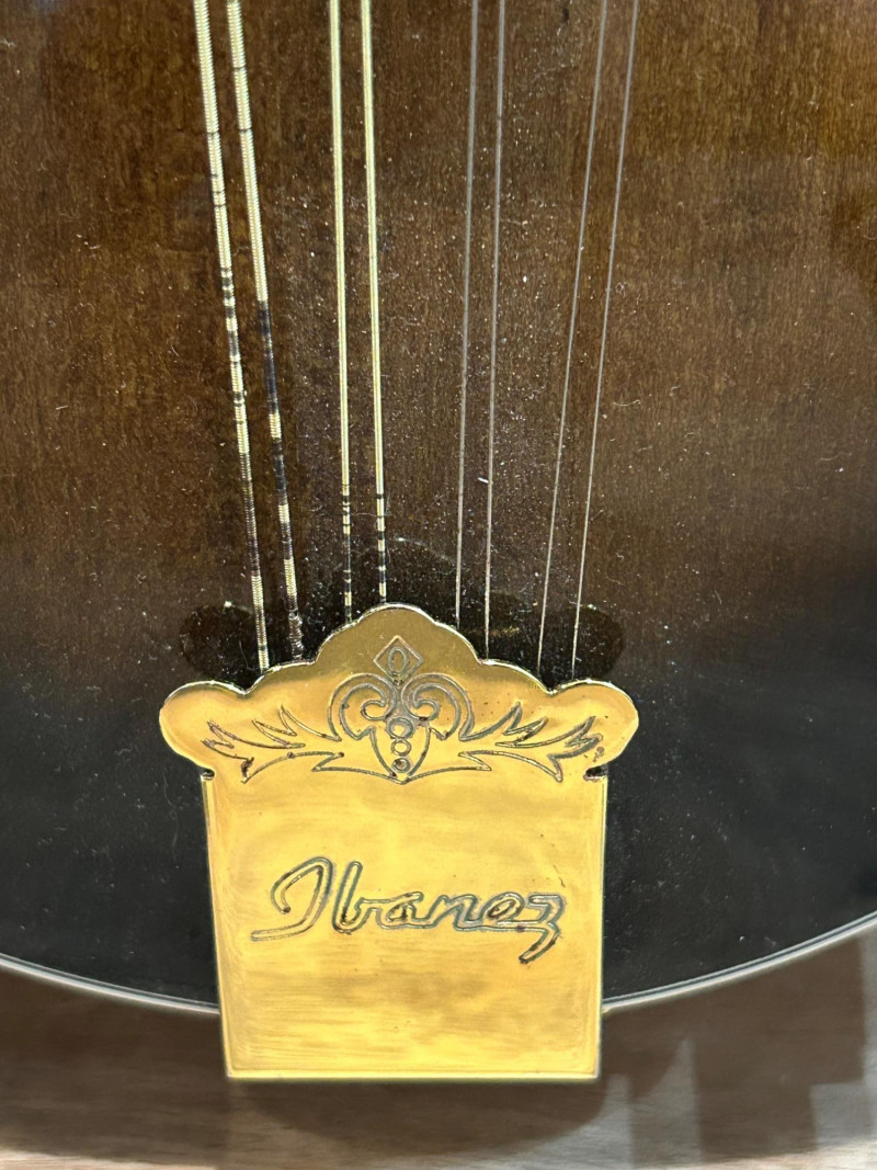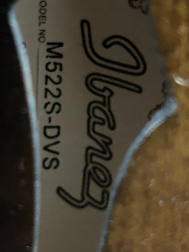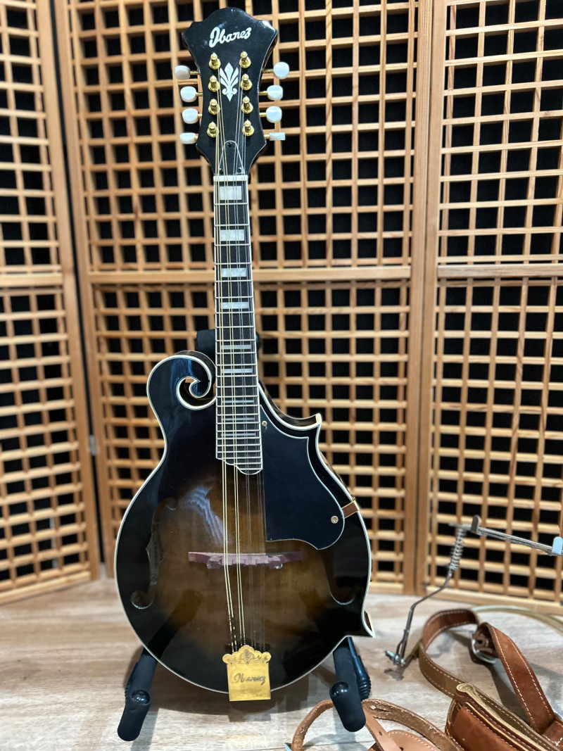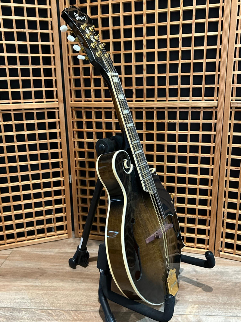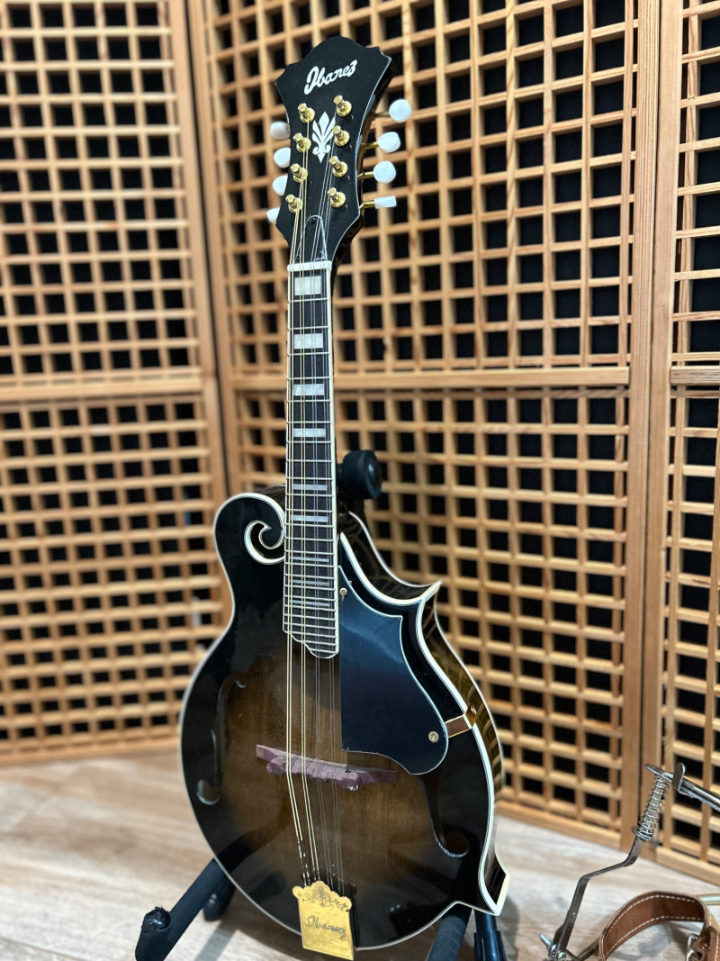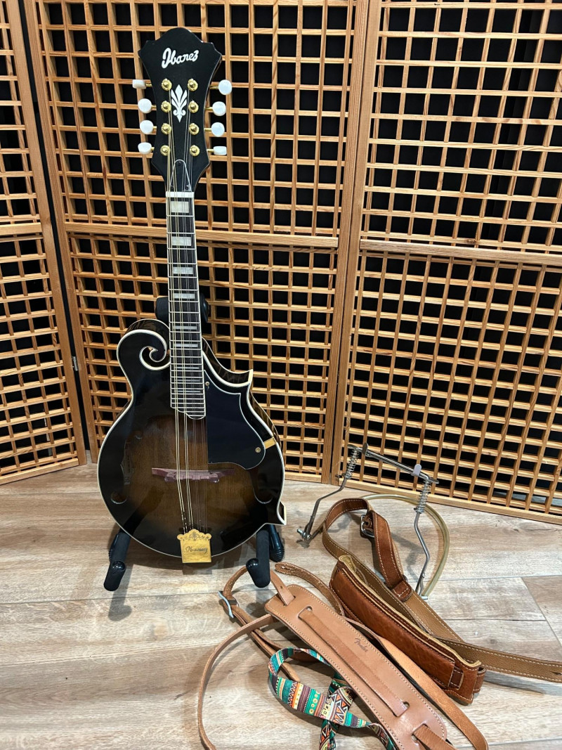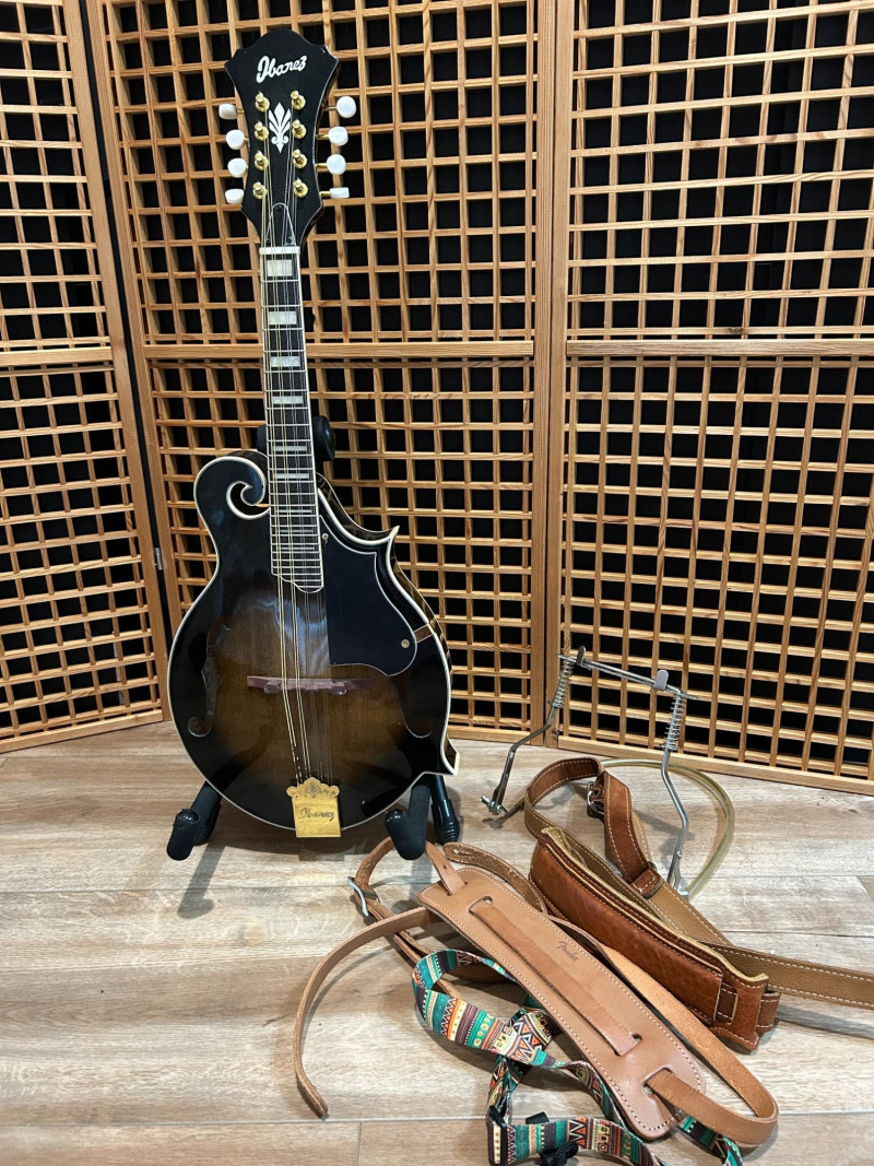 Offered is an Ibanez F-style mandolin, model M522S-DVS, finished in a dark violin sunburst. The instrument features classic F-style scroll construction, elegant binding, and gold-tone hardware. The Ibanez logo is present on both the headstock and tailpiece, and the interior label clearly shows the model designation and serial number. This mandolin is accompanied by a soft padded gig bag and multiple accessories, including leather and woven strapsand a metal support/stand attachment, all shown in the photos. Overall presentation is attractive and complete, making this a solid option for players or collectors looking for a ready-to-use mandolin setup. Brand: Ibanez Model: M522S-DVS Instrument Type: F-Style Mandolin Finish: Dark Violin Sunburst Strings: 8-string configuration (standard mandolin setup) Headstock: Ibanez logo, decorative inlay, gold-tone tuners with white buttons Tailpiece: Ibanez branded, gold-tone Body Features: Scroll body, f-holes, bound edges Country of Manufacture: Made in China (per interior label) Padded soft gig bag Multiple straps (leather and woven) Metal stand/support accessoryItem Details: