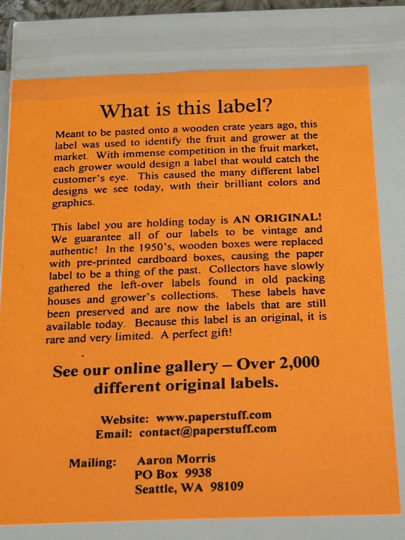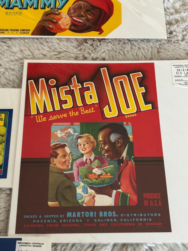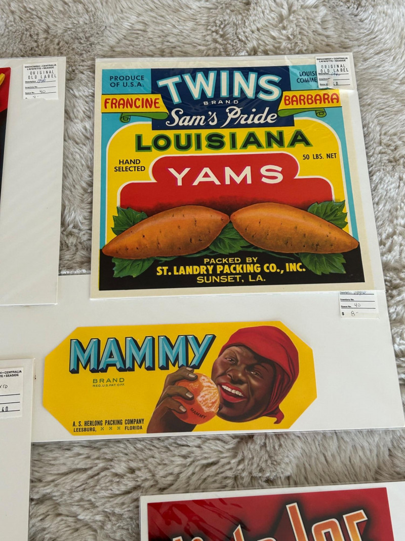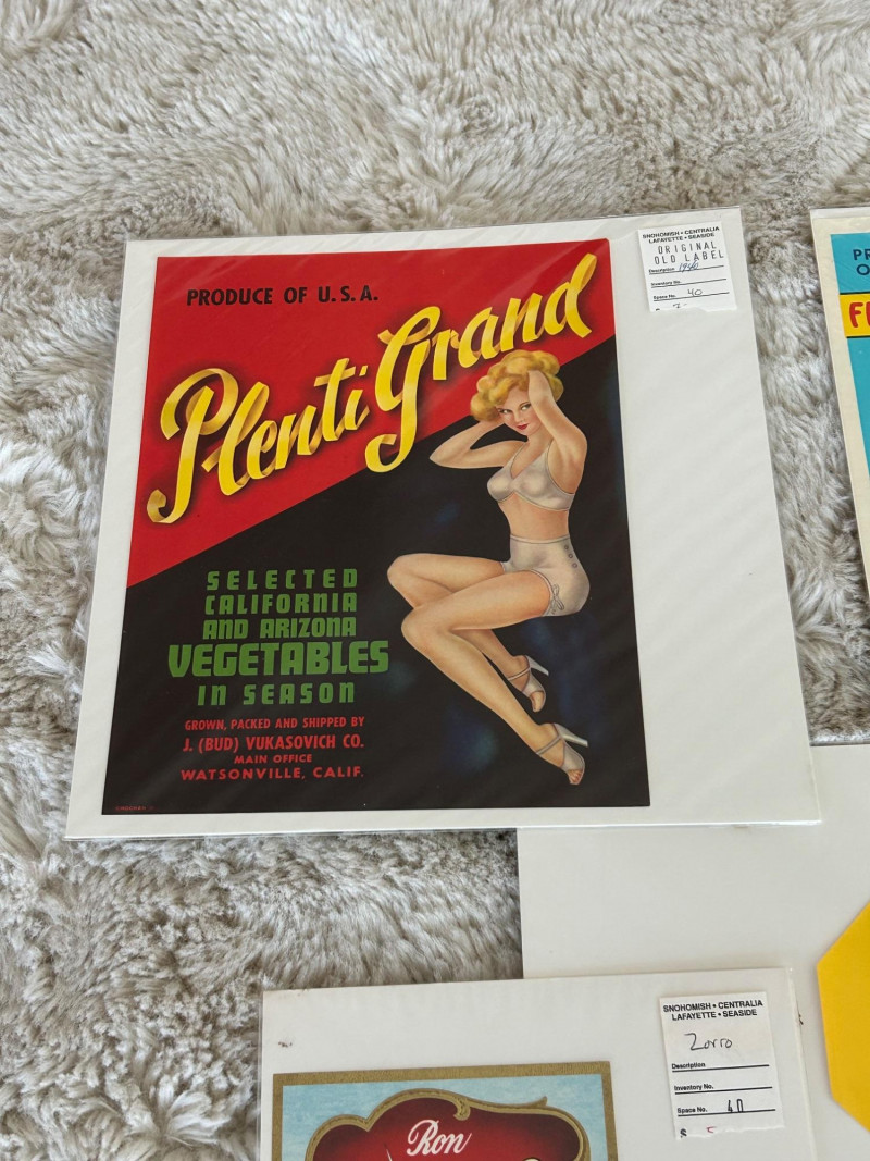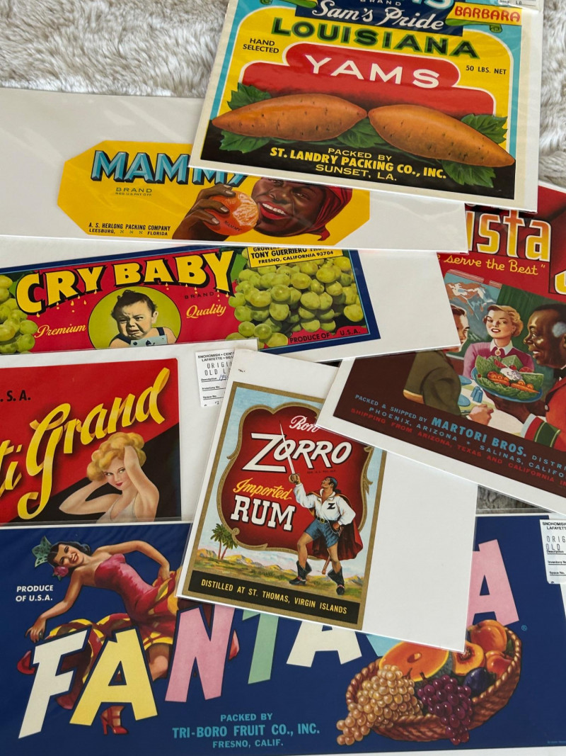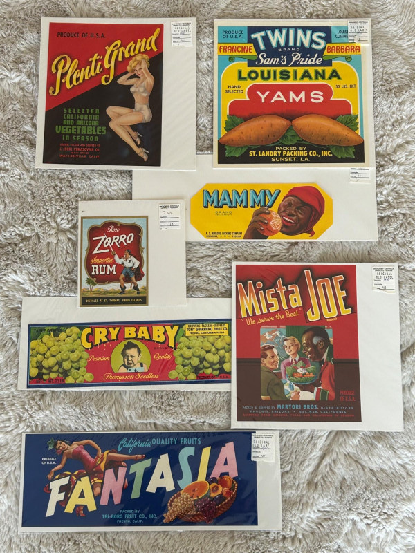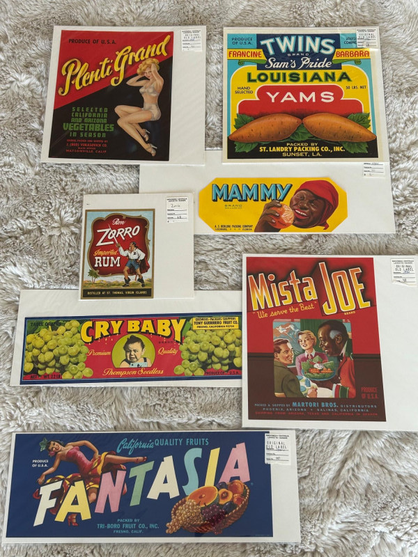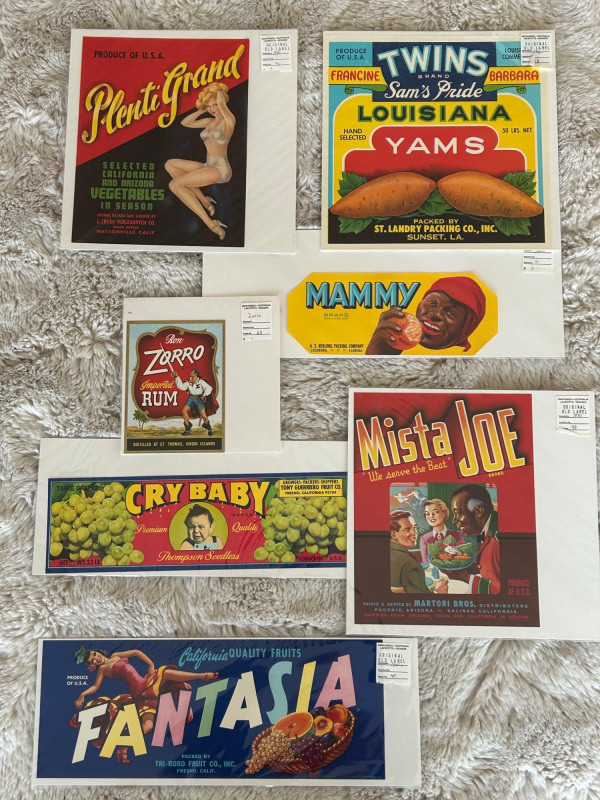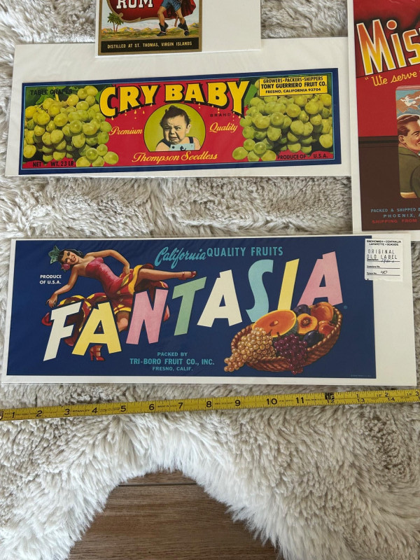 Offered is a curated collection of original vintage paper crate and product labels, dating primarily to the mid-20th century, once used on wooden produce and shipping crates. These labels are admired for their bold typography, rich colors, and classic Americana illustrations. The group includes agricultural, beverage, and novelty branding—from glamorous pin-up produce art to character-driven and regional designs. Per the included informational card, these are authentic original labels, preserved from packing houses and growers’ collections after wooden crates were phased out in favor of printed cardboard boxes in the 1950s. An excellent grouping for collectors of vintage advertising, ephemera, or for framing as decorative wall art. Plenti-Grand – Selected California & Arizona Vegetables Ron Zorro Imported Rum – St. Thomas, Virgin Islands Fantasia – California Quality Fruits Cry Baby – Premium Thompson Seedless Grapes Mammy Brand Twins / Sam’s Pride Louisiana Yams Mista Joe – “We Serve the Best” Additional original labels included as shown in photos Type: Original vintage paper crate labels Era: Circa 1940s–1950s Material: Paper lithograph labels Authenticity: Original (not reproductions) Condition: Very good vintage condition overall Bright colors with strong graphic appeal Minor edge wear or light handling marks consistent with age Origin: United States (various regions)Set Includes: